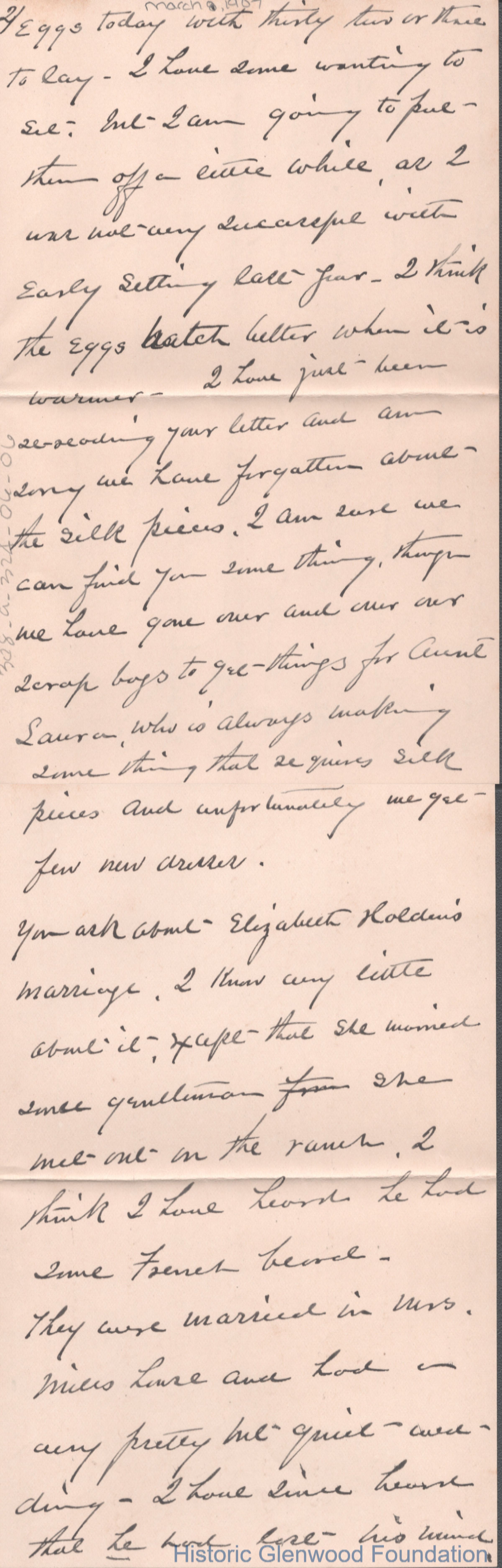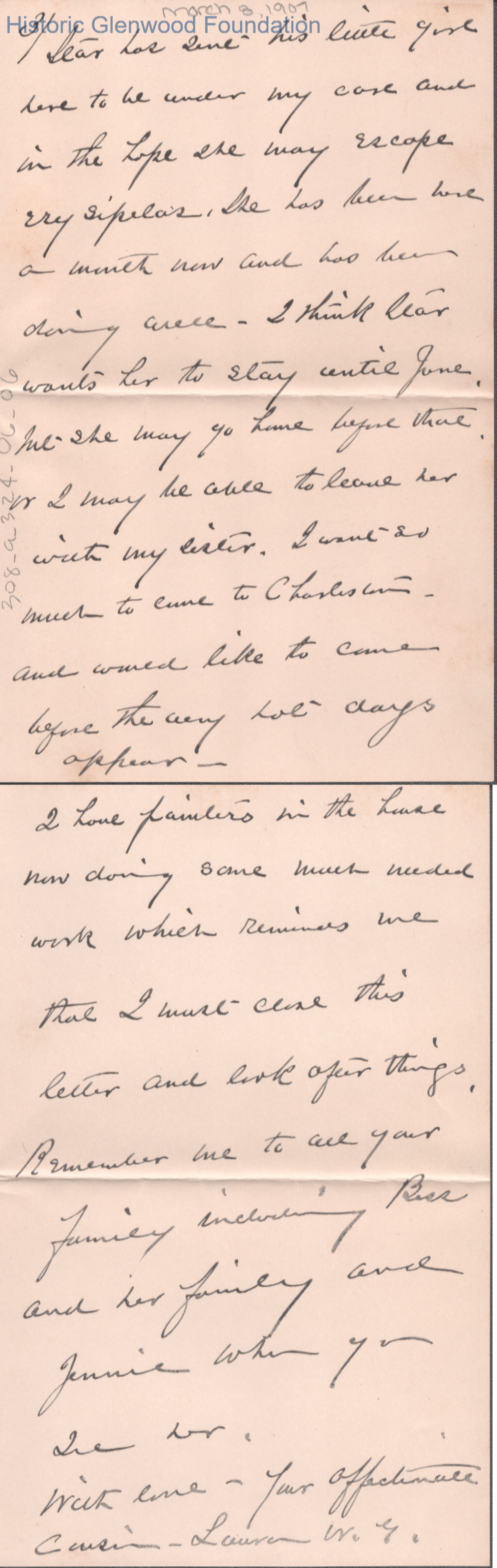 Eight-page letter to Lucy W. Summers from Laura W. Gallaher, Mar 8, 1907.