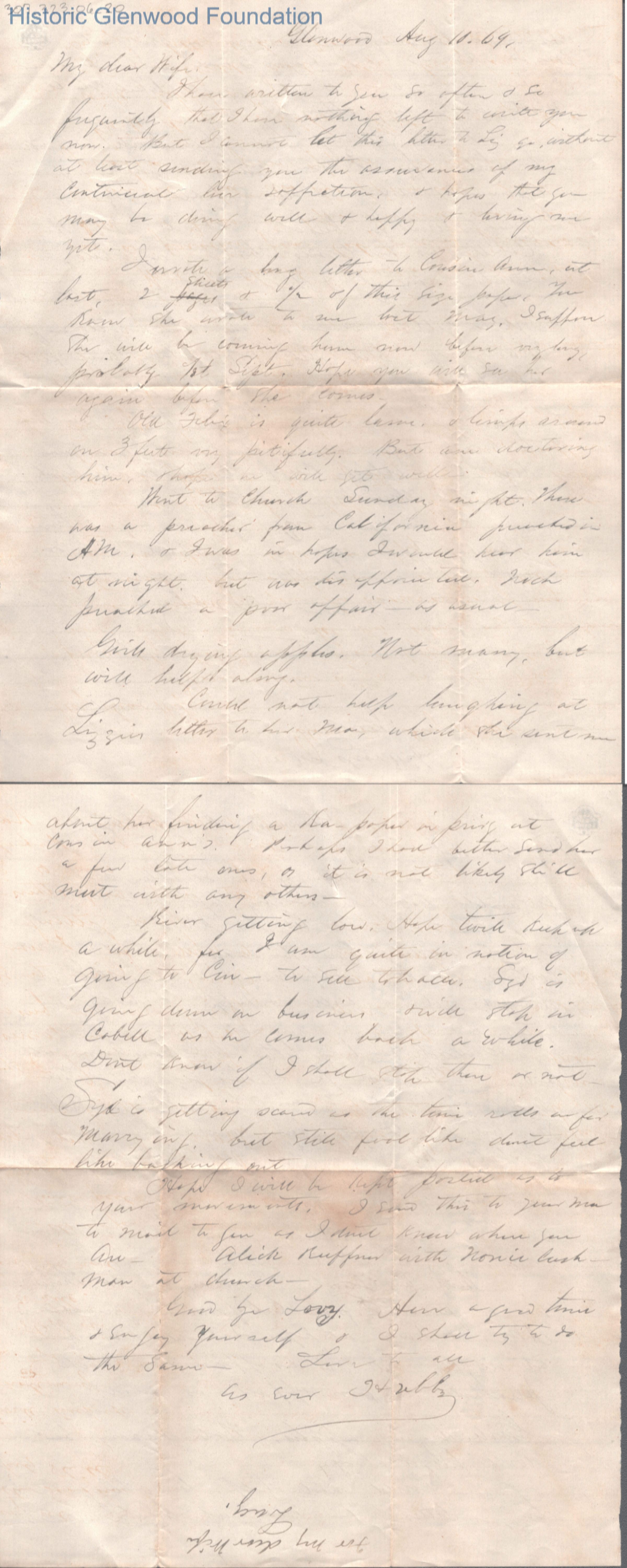 Two-page letter to Lucy W. Summers from Lewis Summers, Aug 10, 1869.