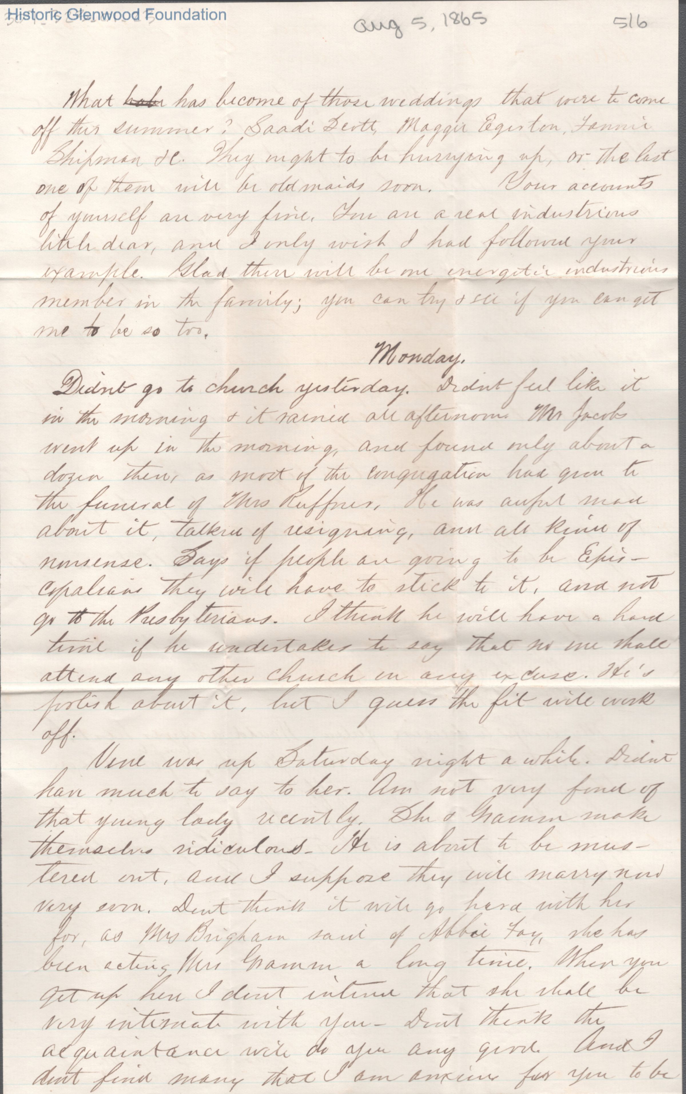 Six-page letter to Lucy W. Summers from Lewis Summers, Aug 5, 1865.
