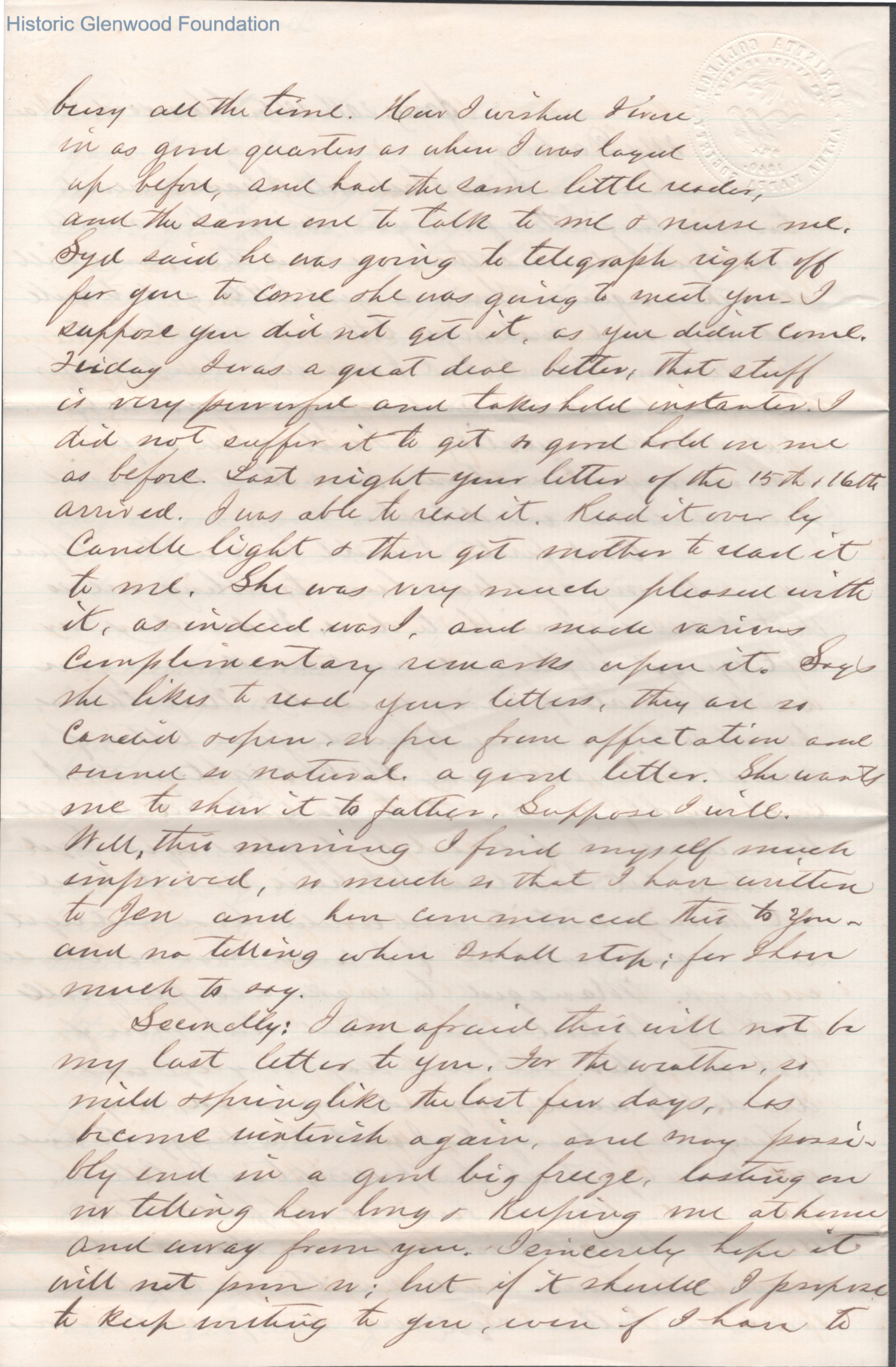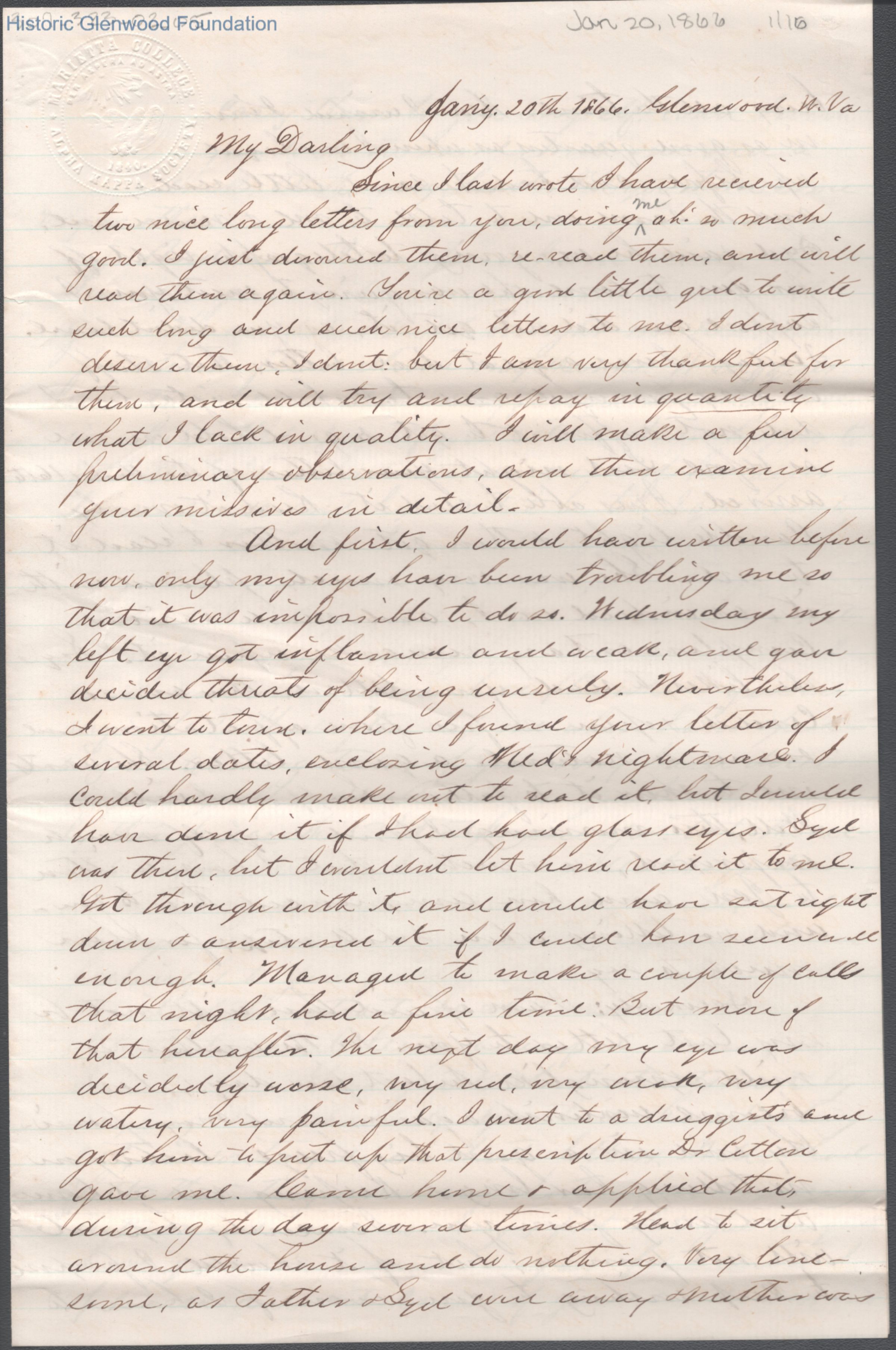 Sixteen-page letter to Lucy W. Summers from Lewis Summers, Jan 20, 1866.