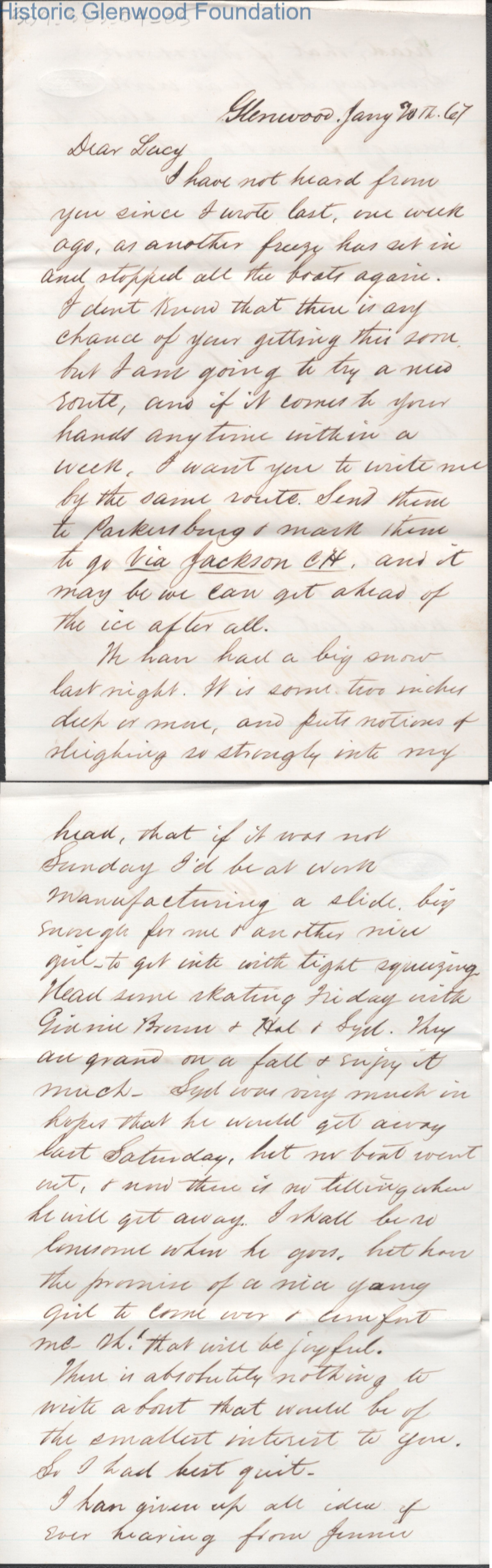 Three-page letter to Lucy W. Summers from Lewis Summers, Jan 20, 1867.
