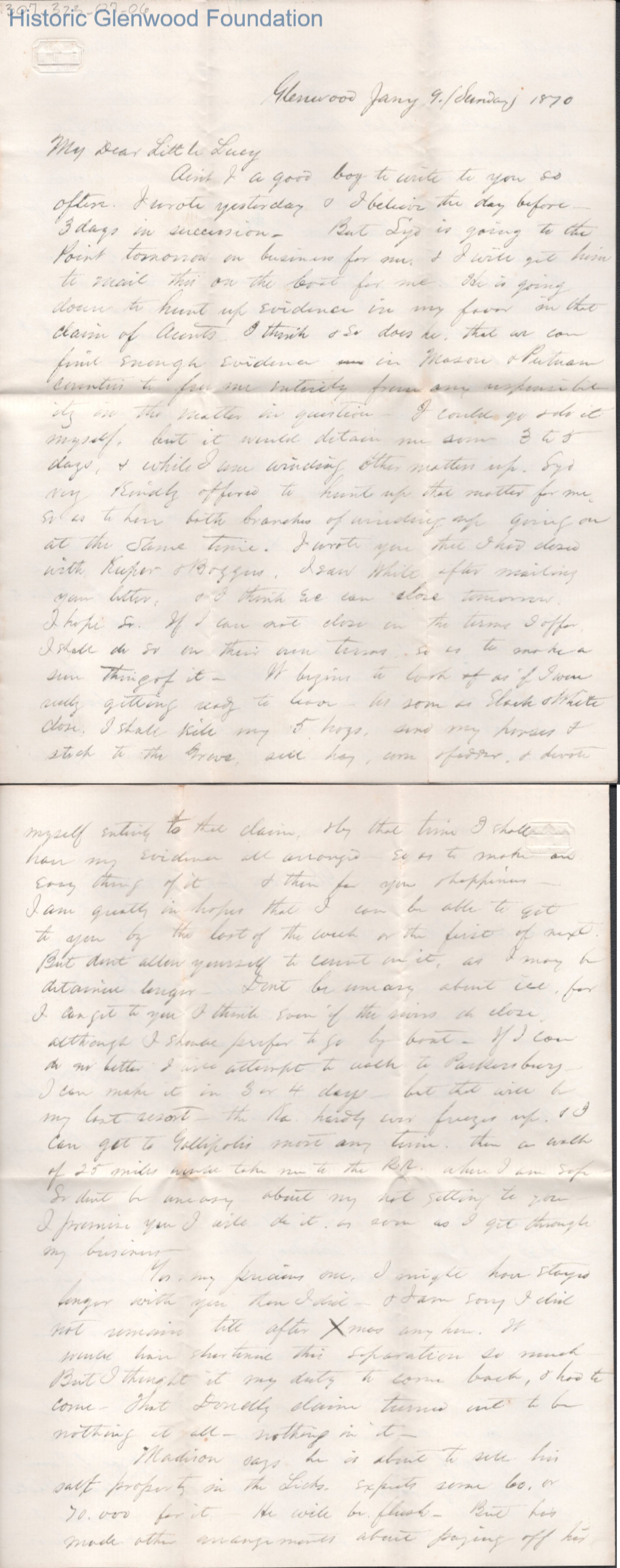 Four-page letter to Lucy W. Summers from Lewis Summers, Jan 9, 1870.