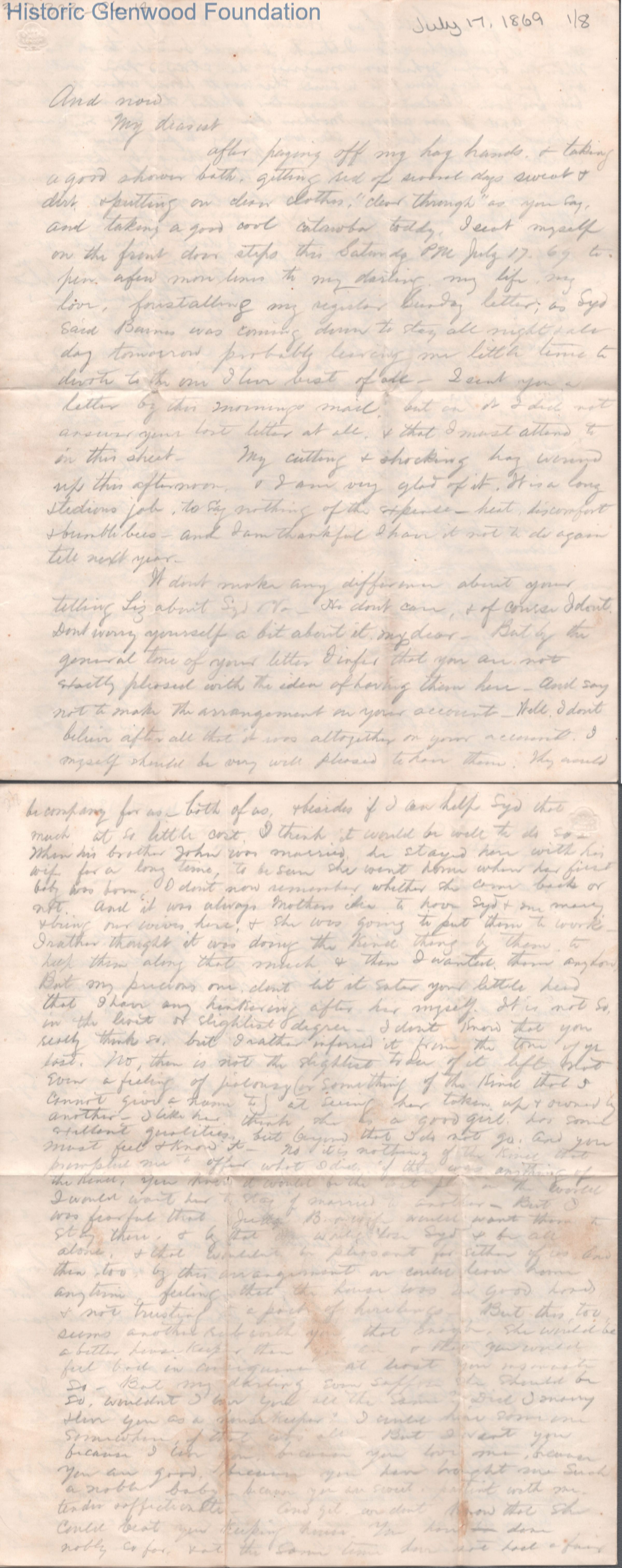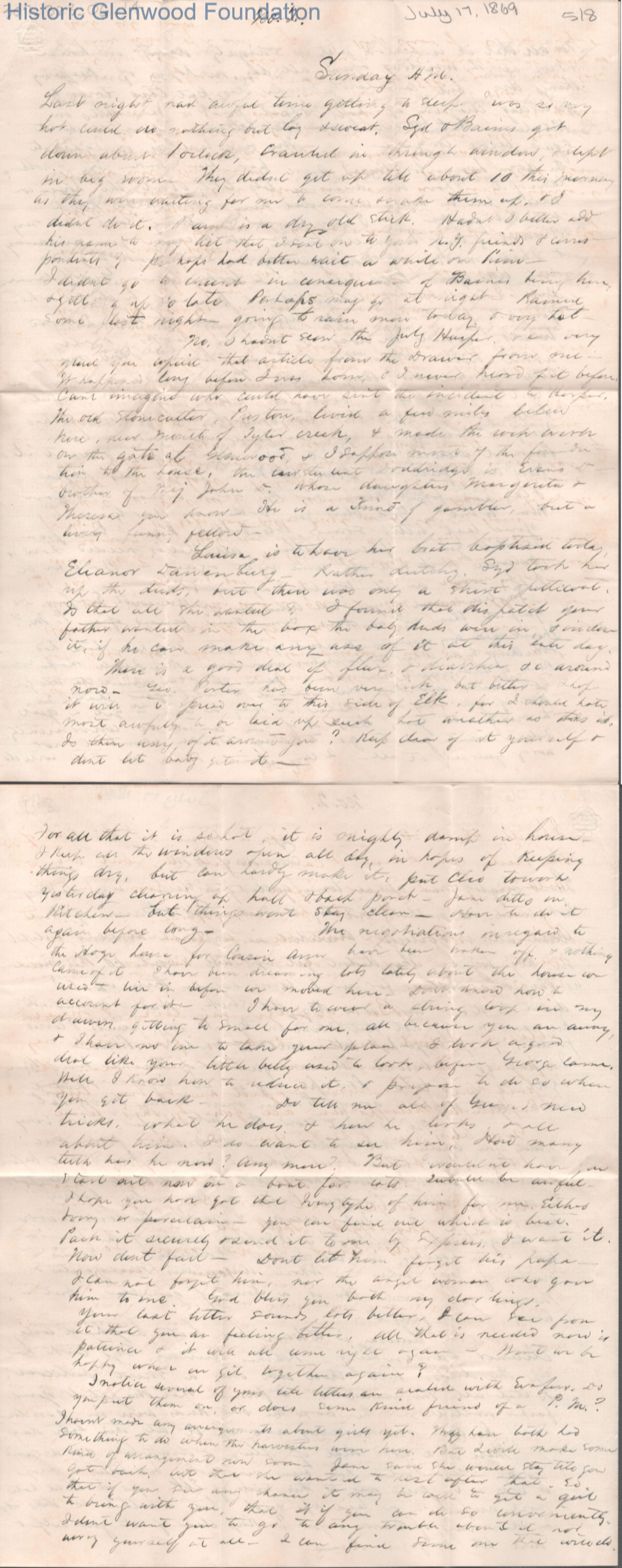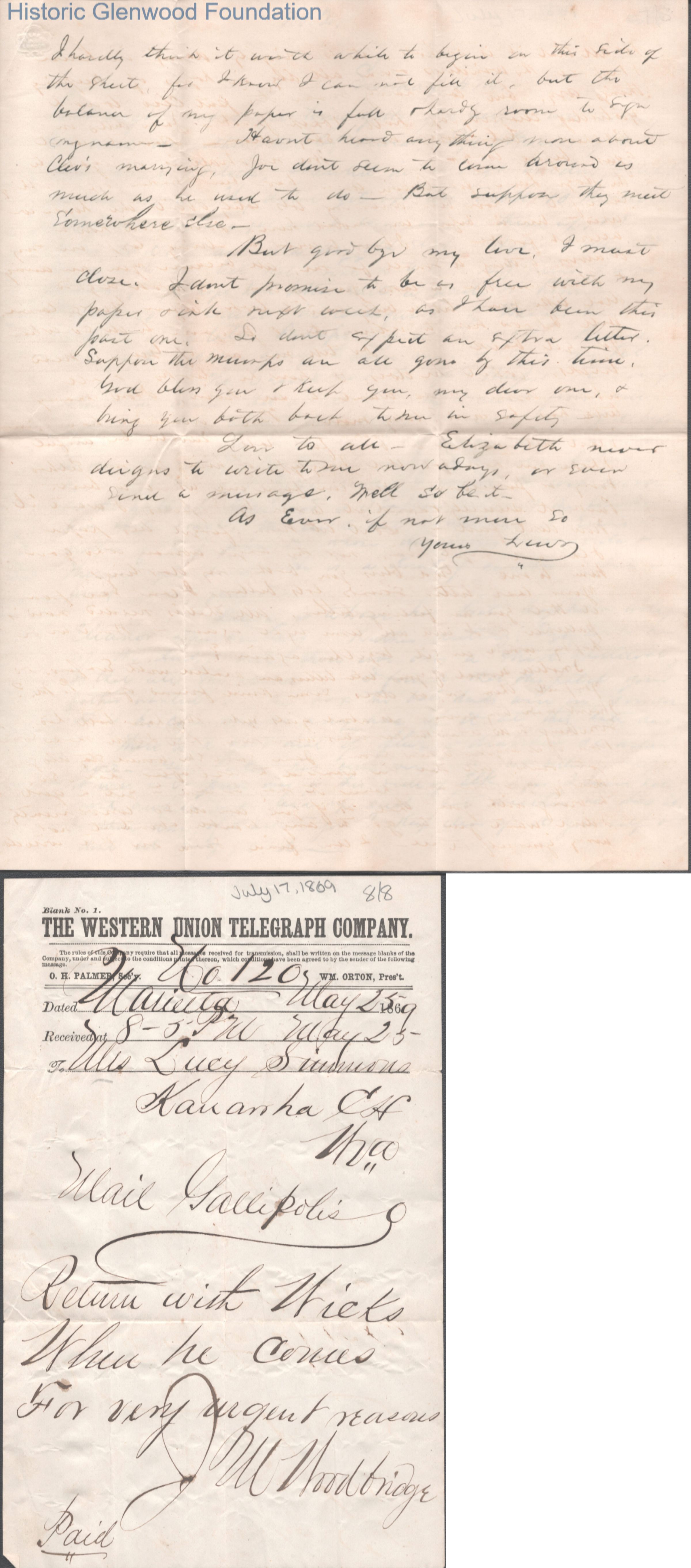 Eight-page letter with telegram to Lucy W. Summers from Lewis Summers, Jul 17, 1869.