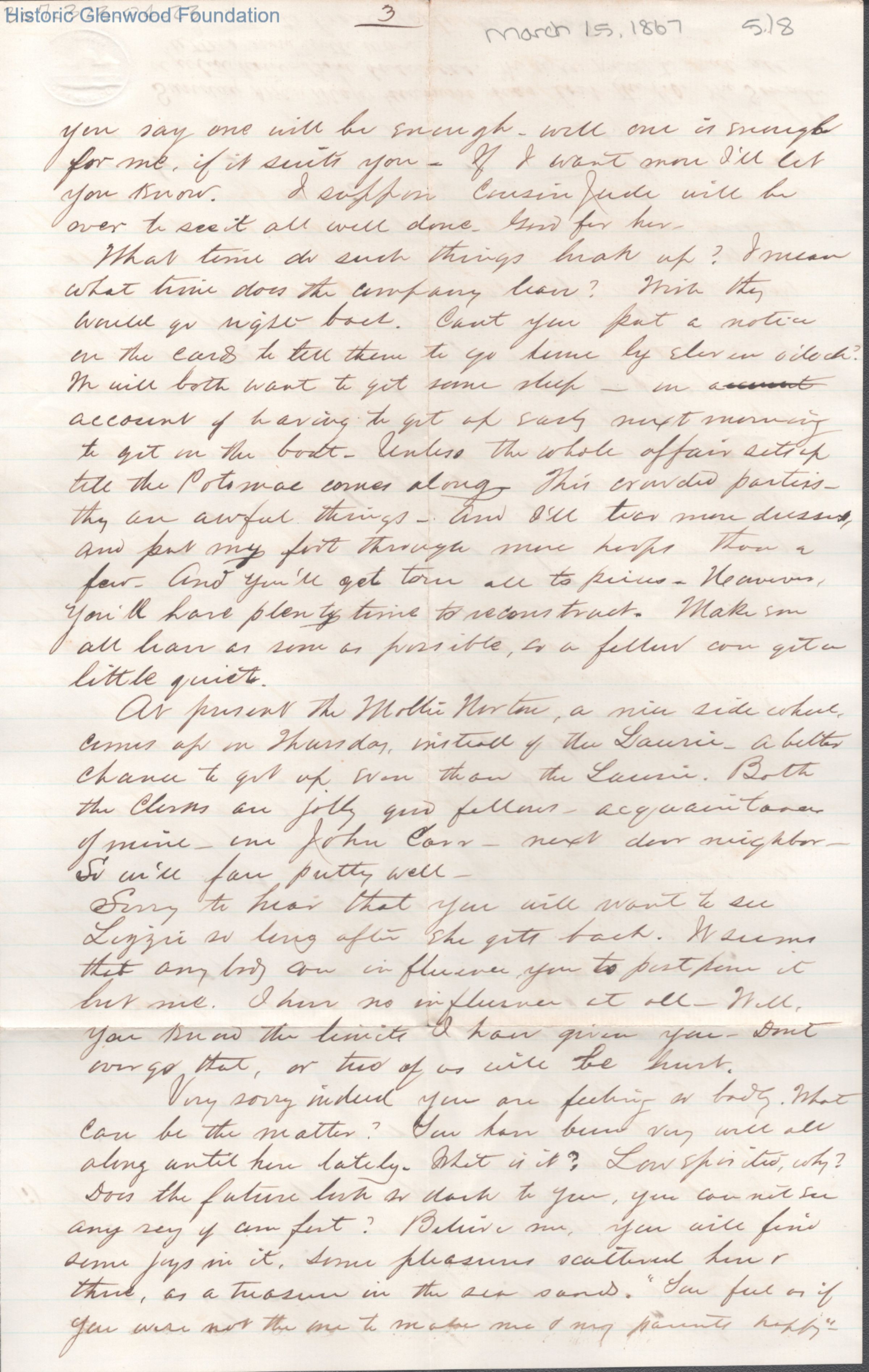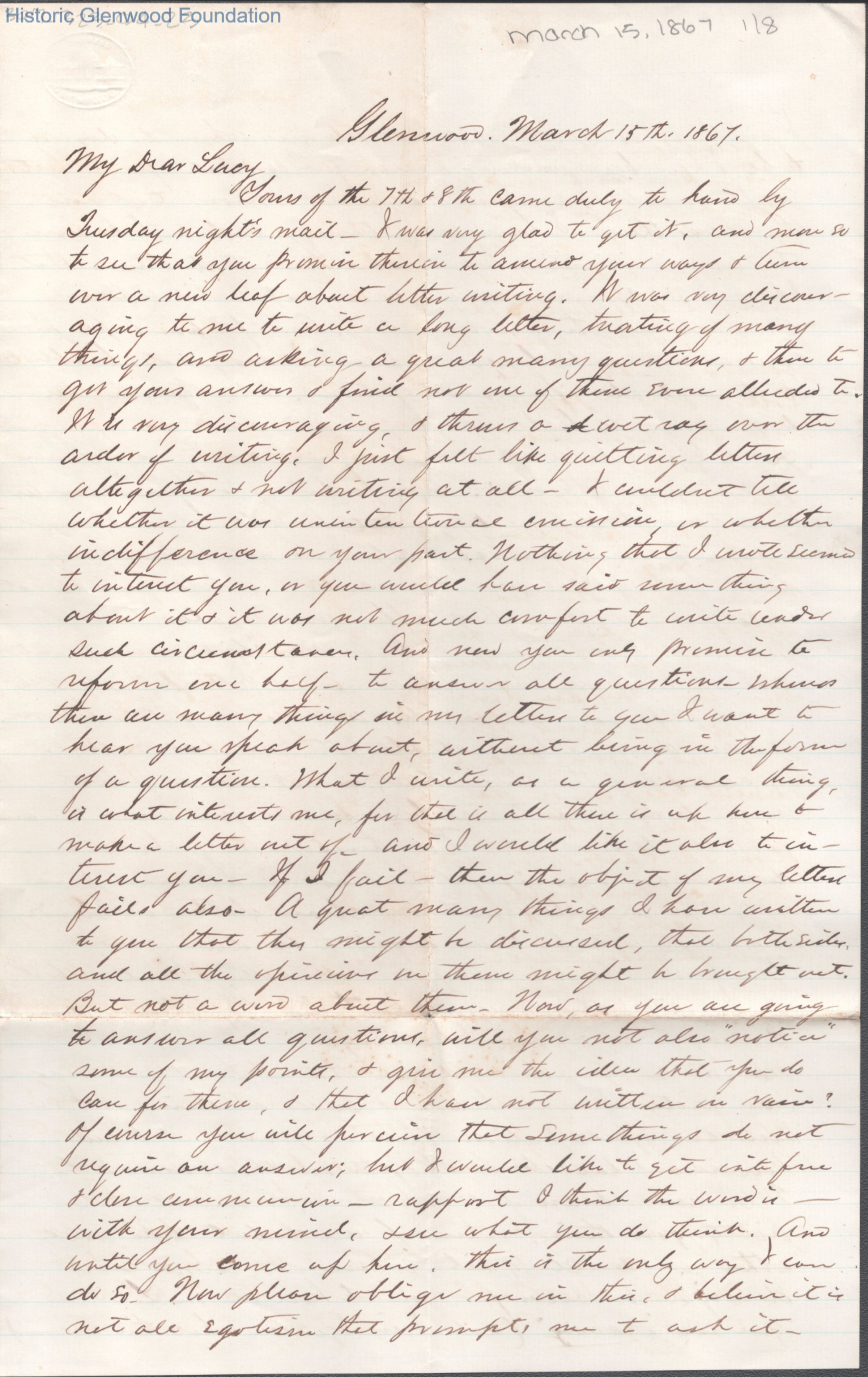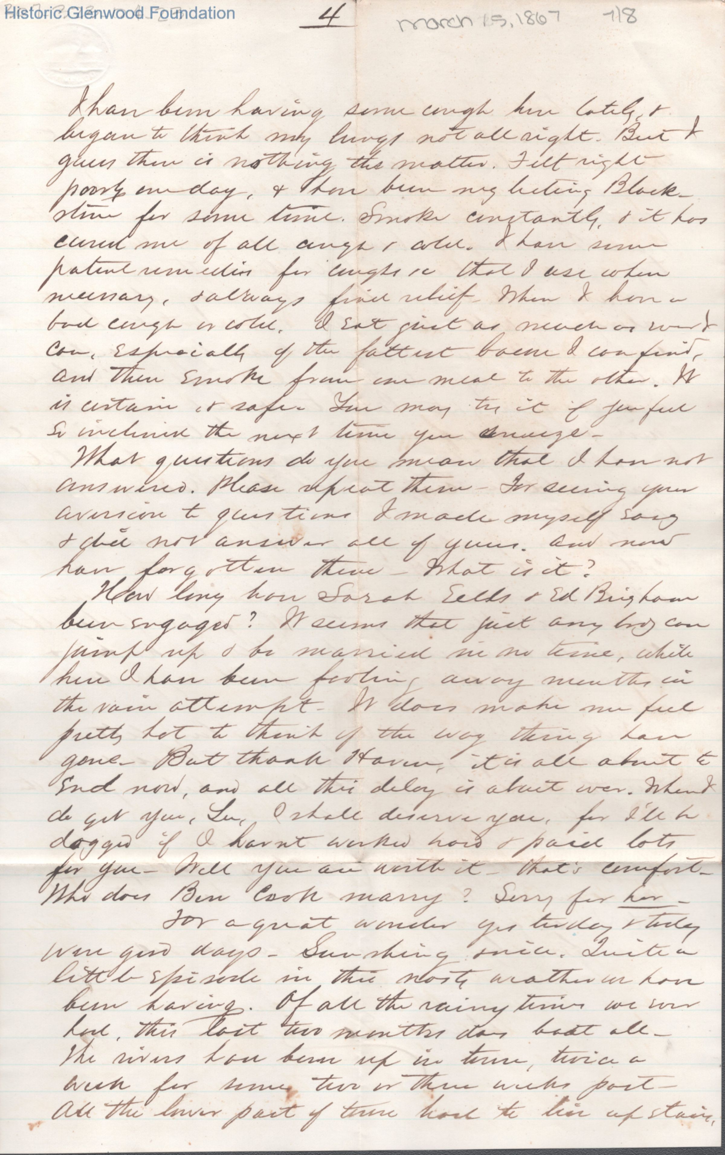 Eight-page letter to Lucy W. Summers from Lewis Summers, Mar 15, 1867.