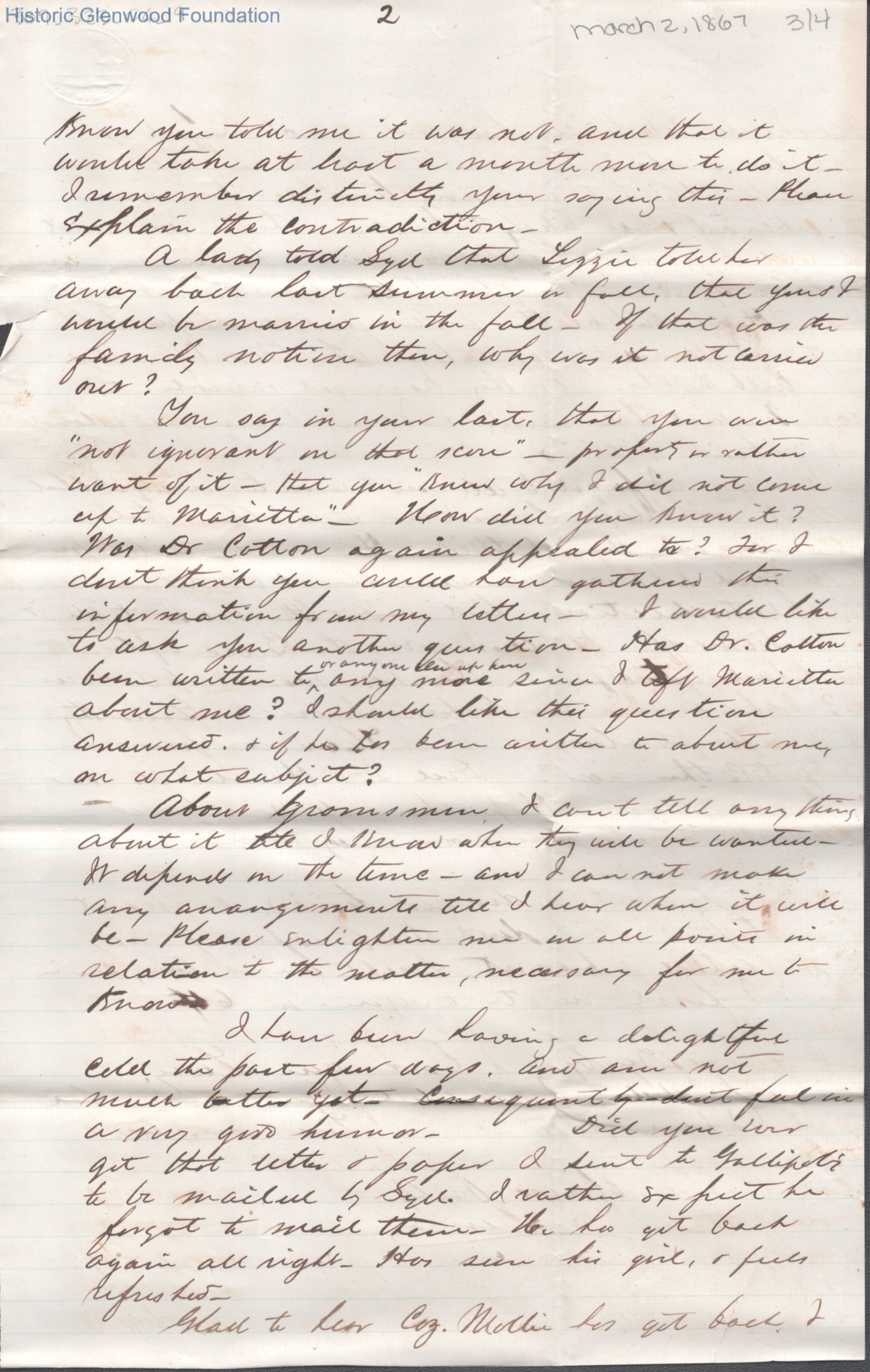 Four-page letter to Lucy W. Summers from Lewis Summers, Mar 2, 1867.