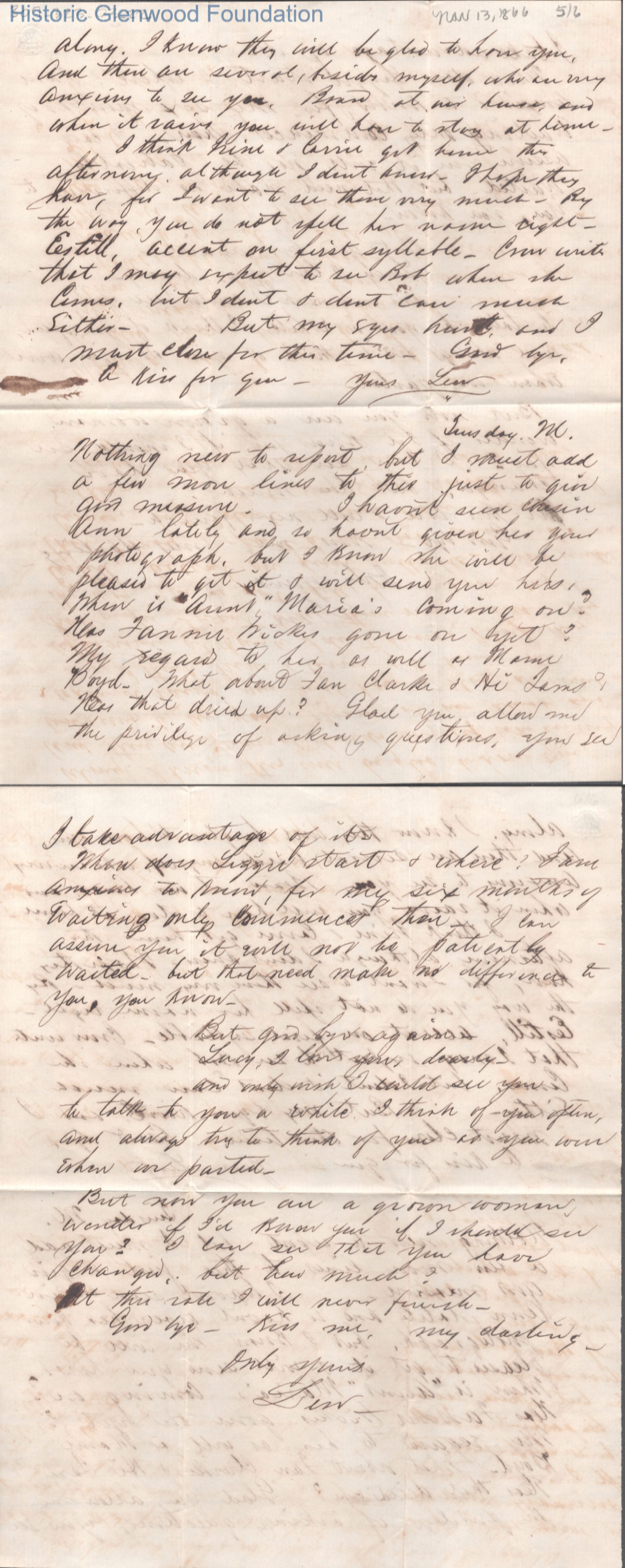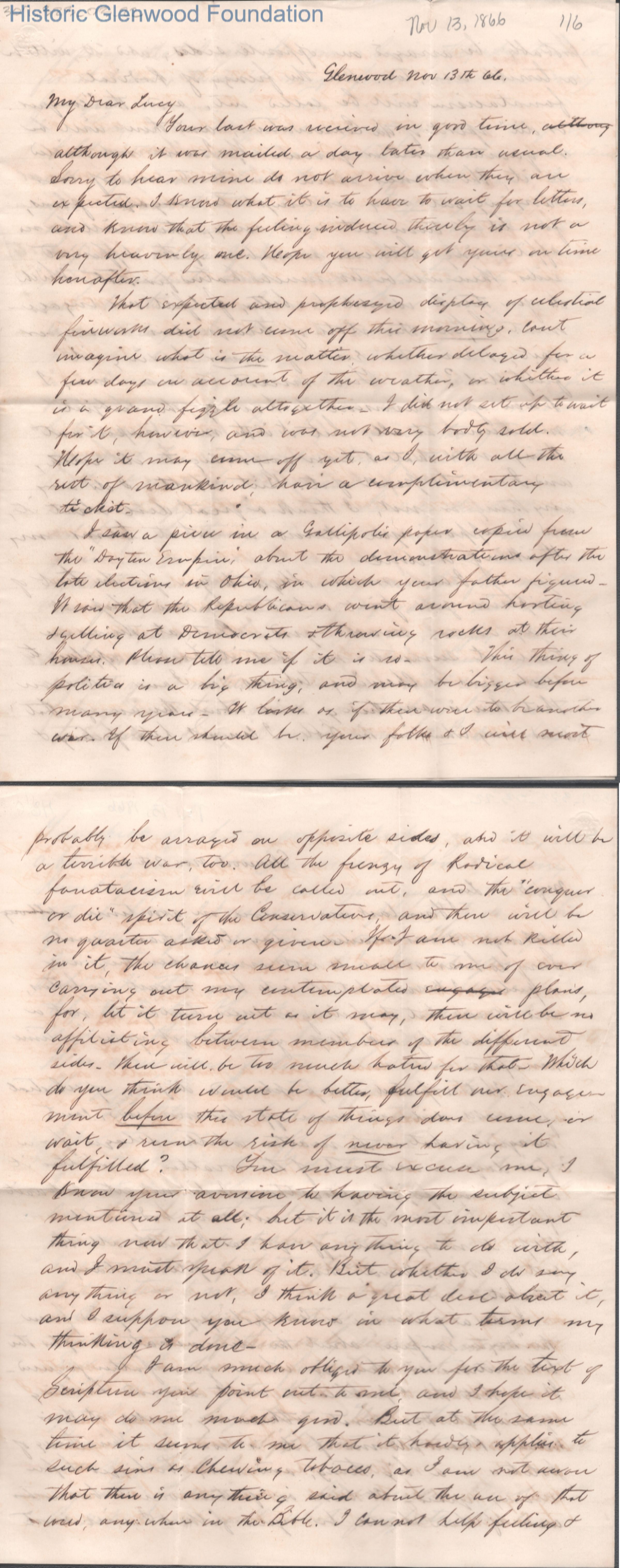 Six-page letter to Lucy W. Summers from Lewis Summers, Nov 13, 1866.