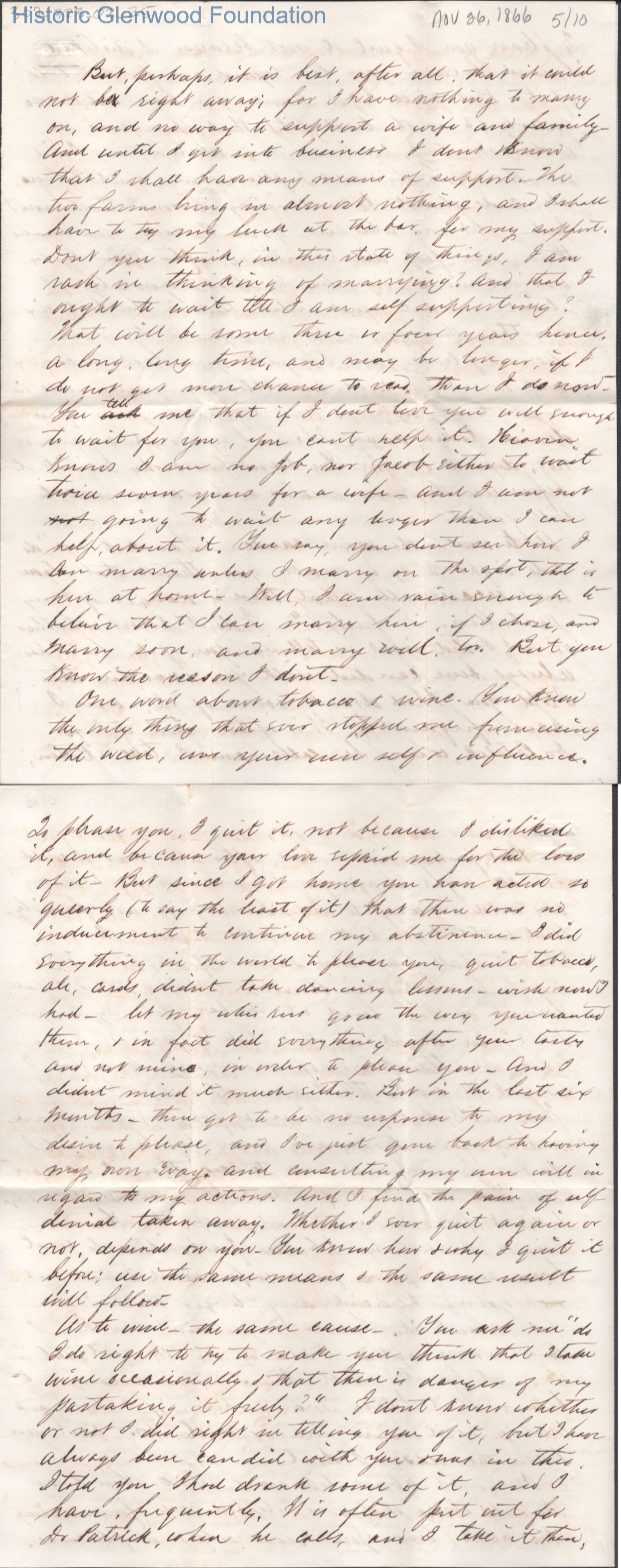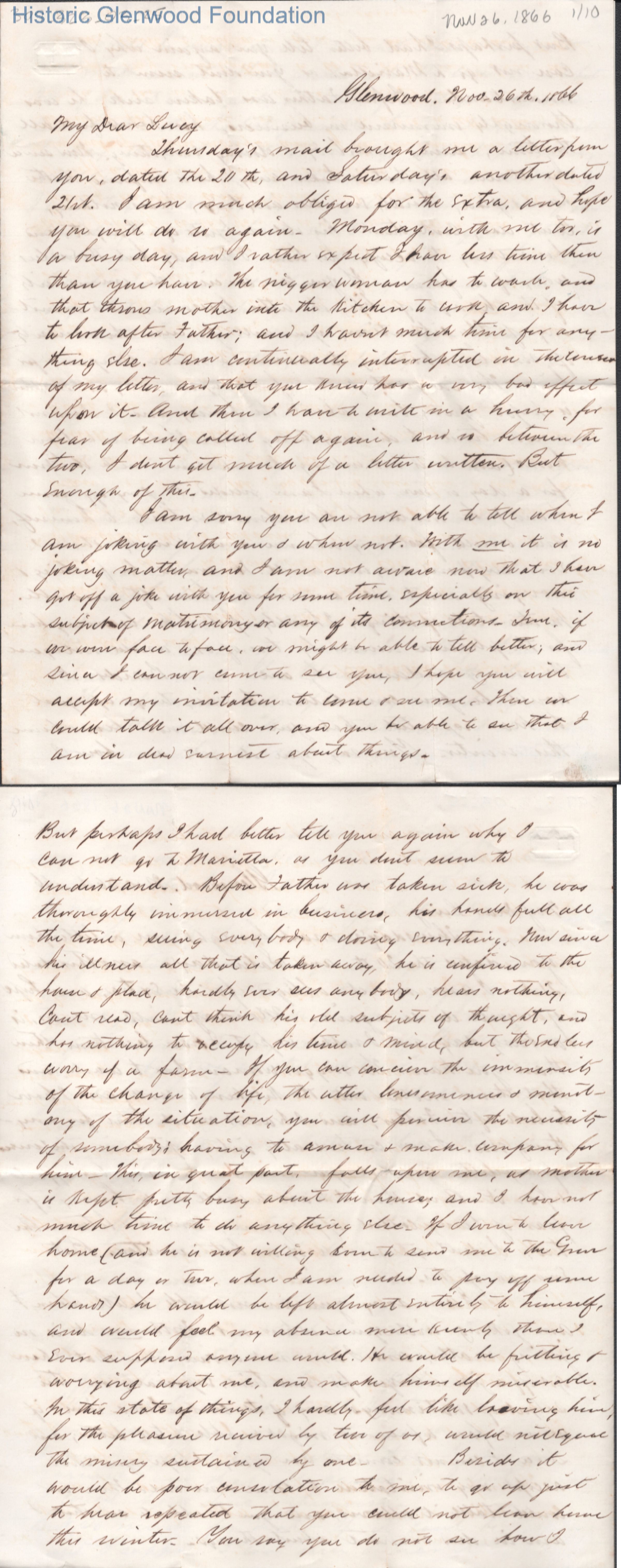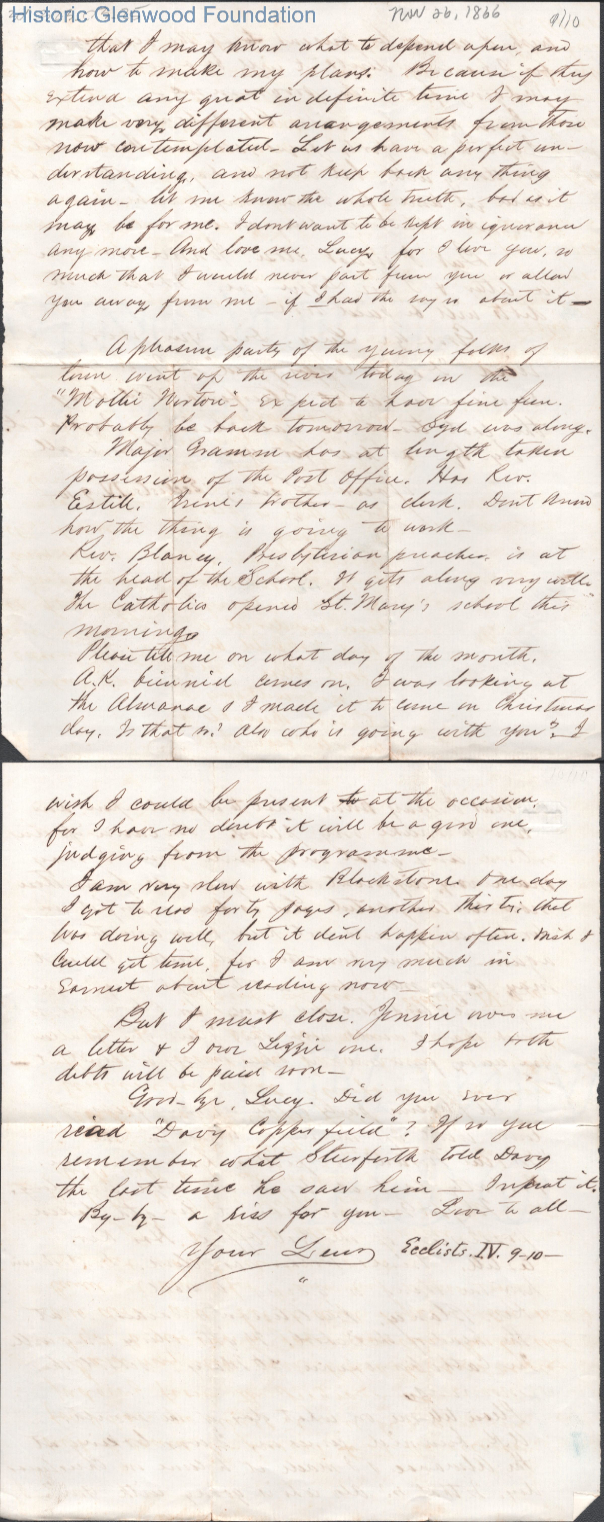 Ten-page letter to Lucy W. Summers from Lewis Summers, Nov 26, 1866.