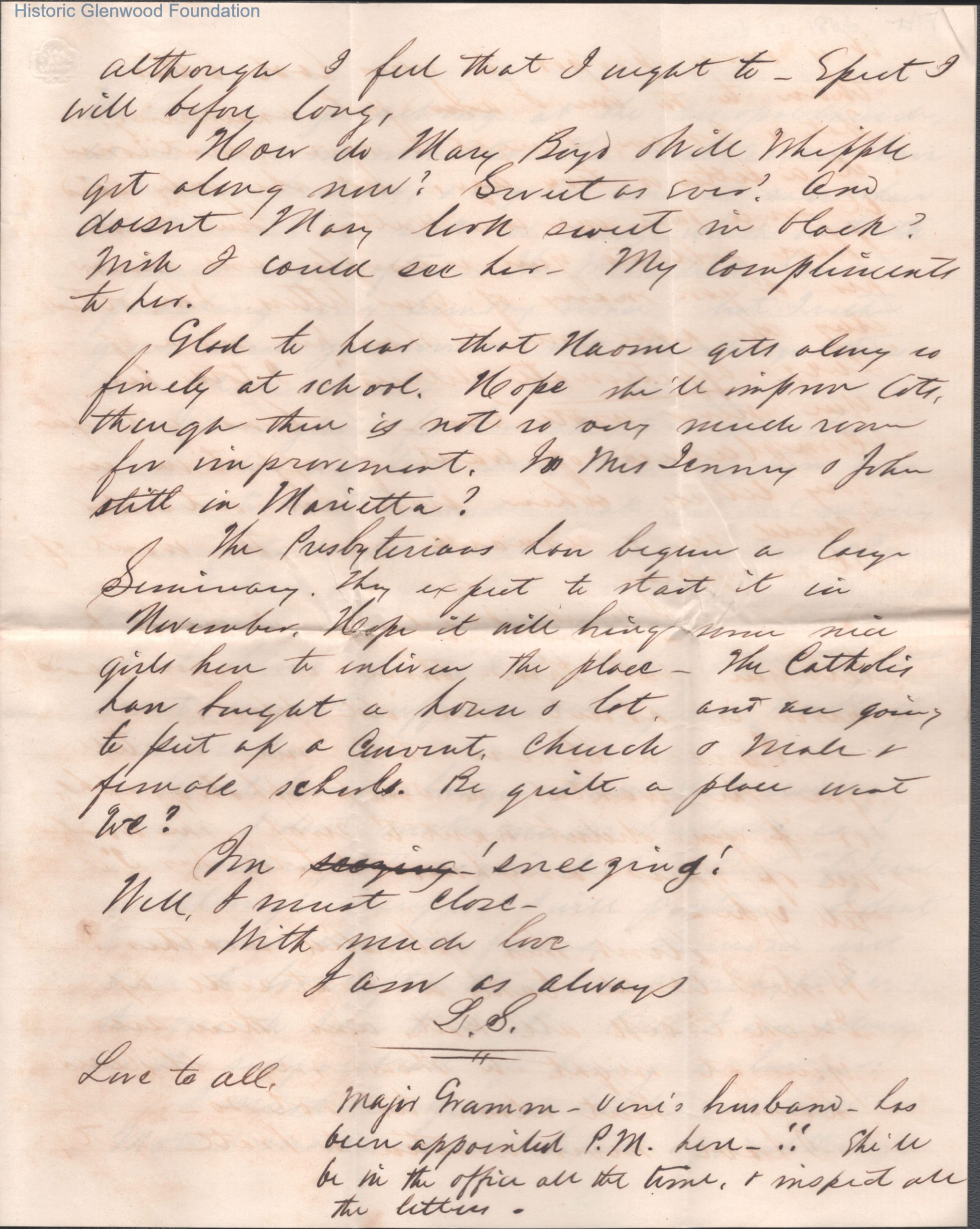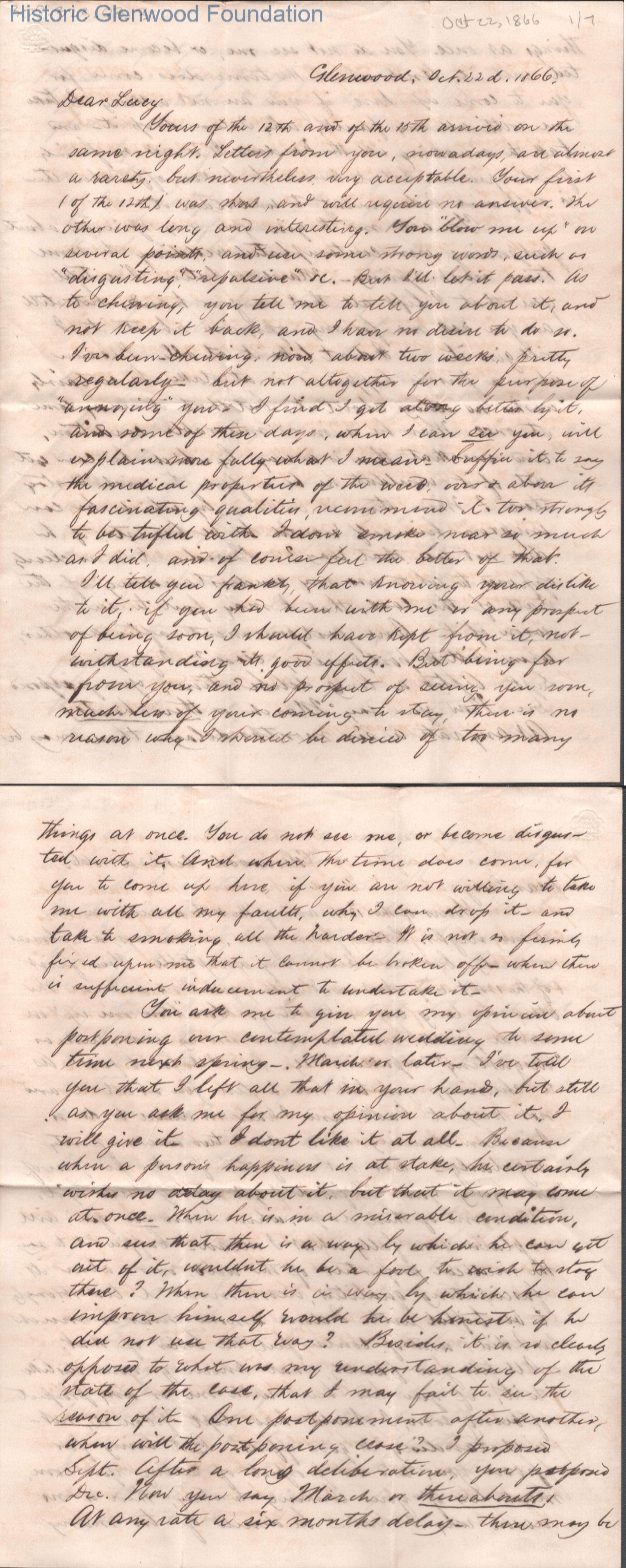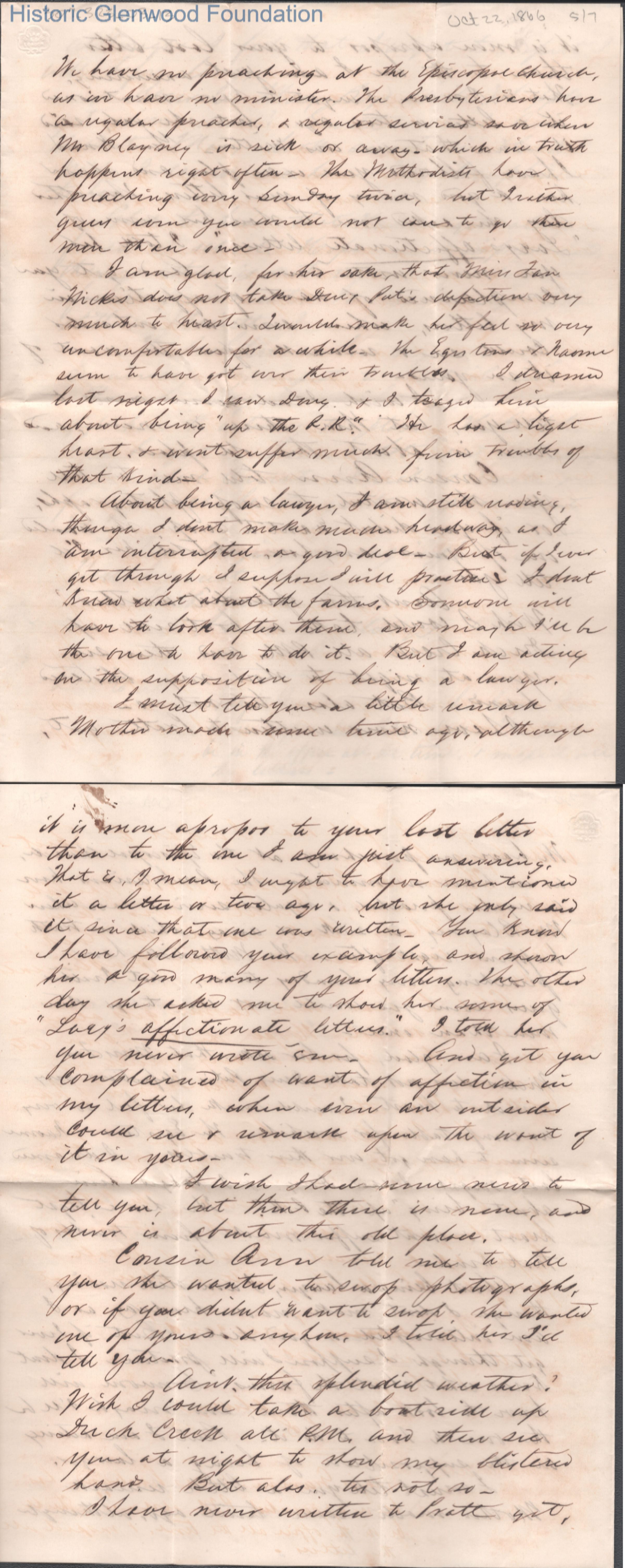 Seven-page letter to Lucy W. Summers from Lewis Summers, Oct 22, 1866.