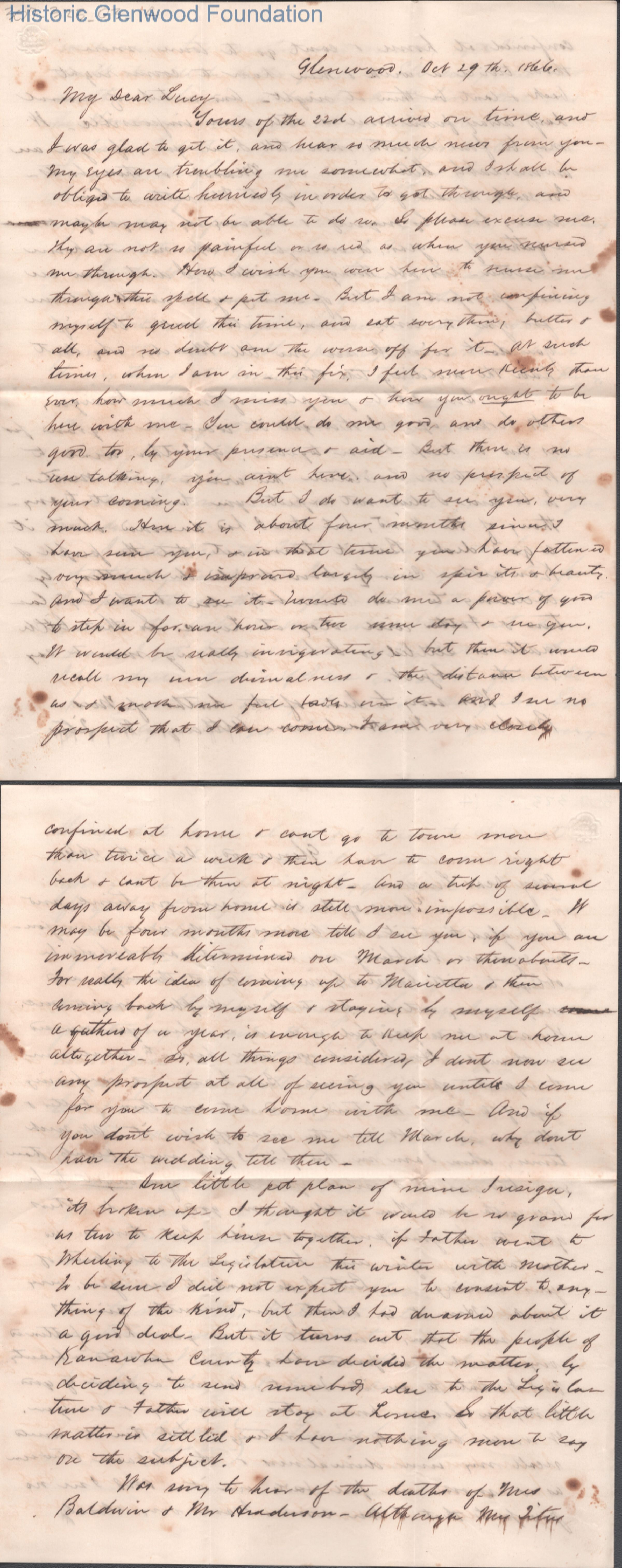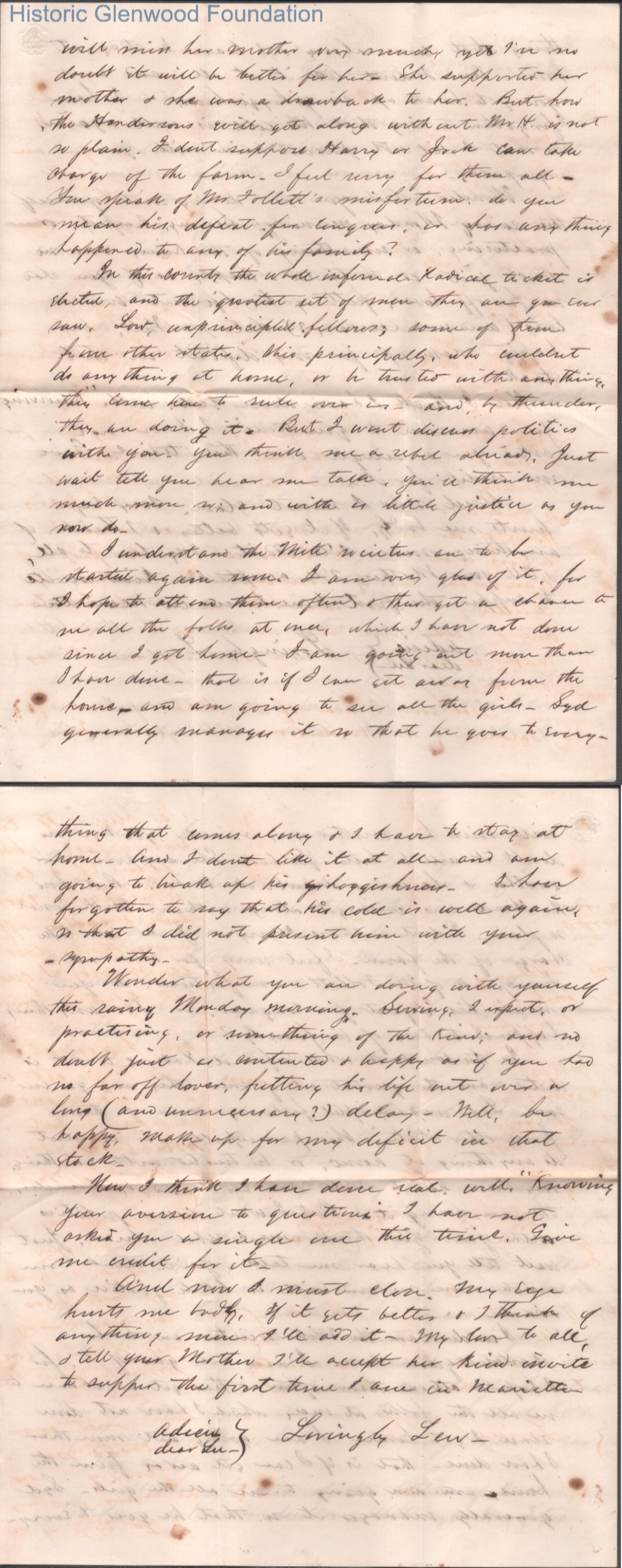 Four-page letter to Lucy W. Summers from Lewis Summers, Oct 29, 1866.