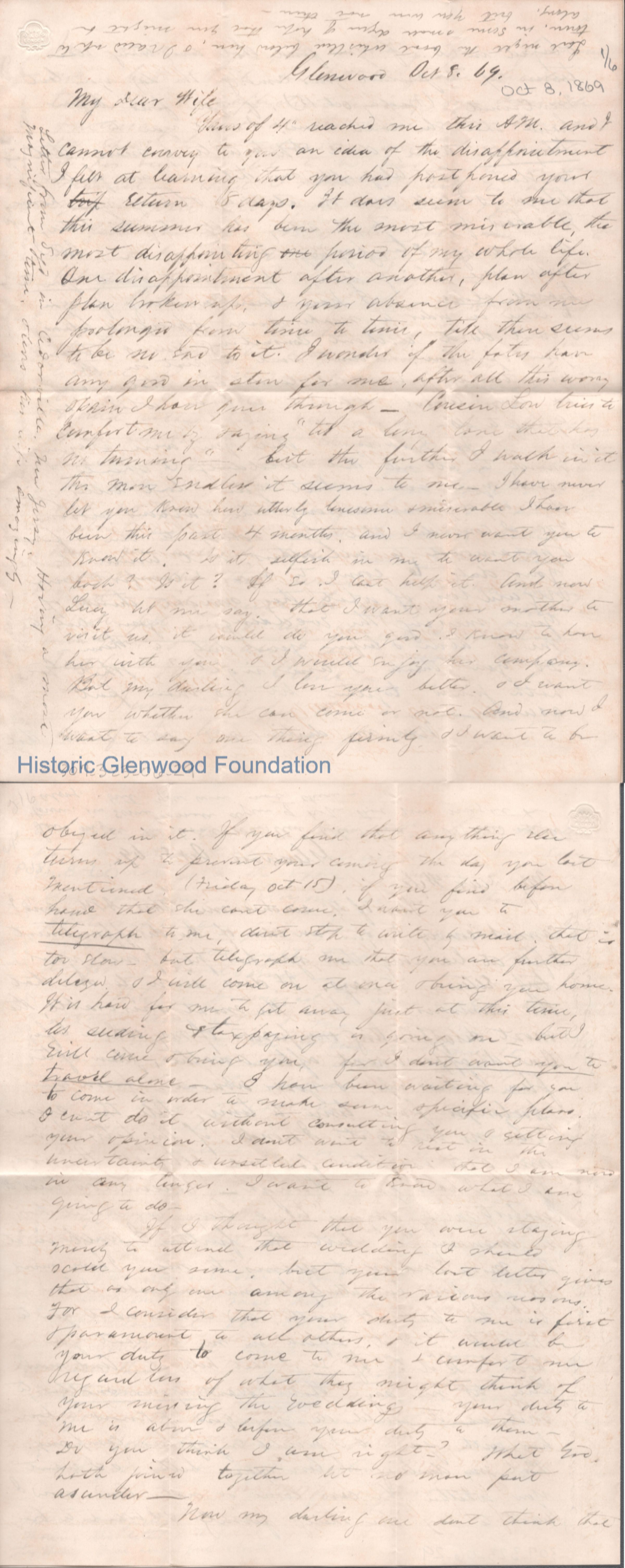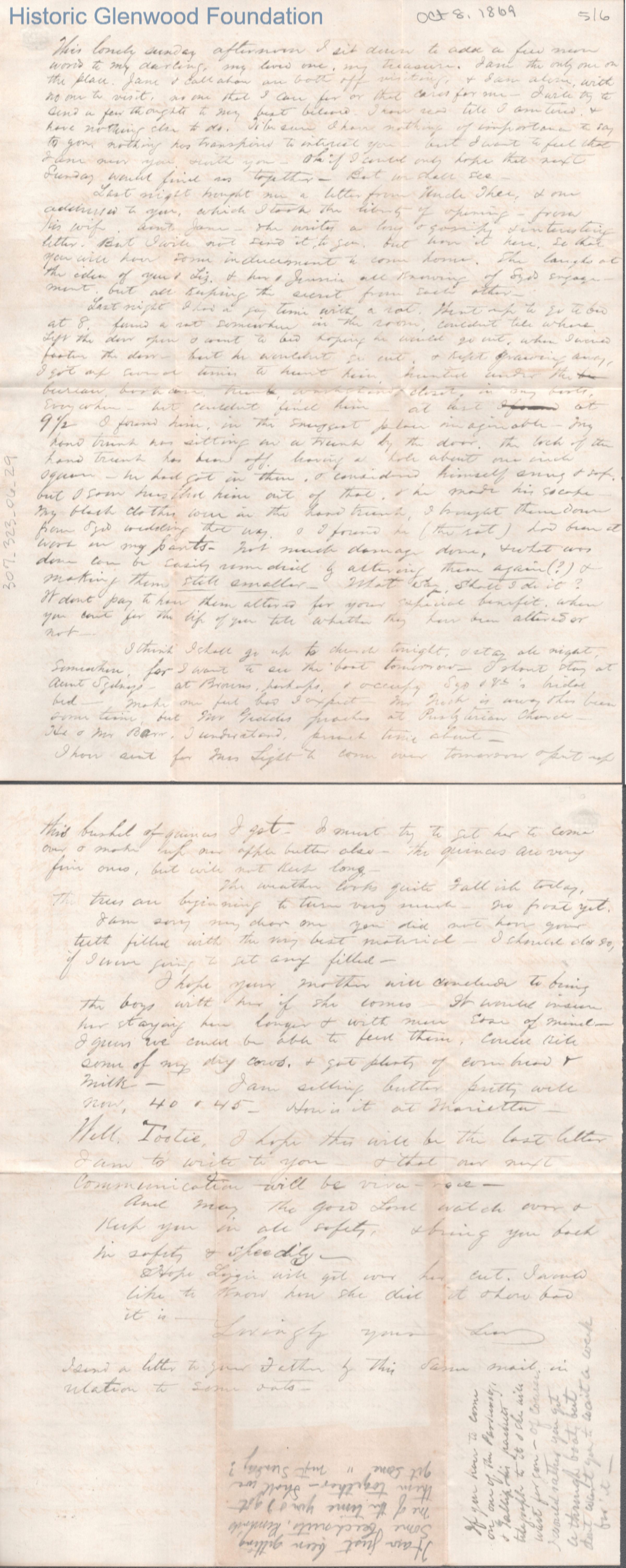 Six-page letter to Lucy W. Summers from Lewis Summers, Oct 8, 1869.