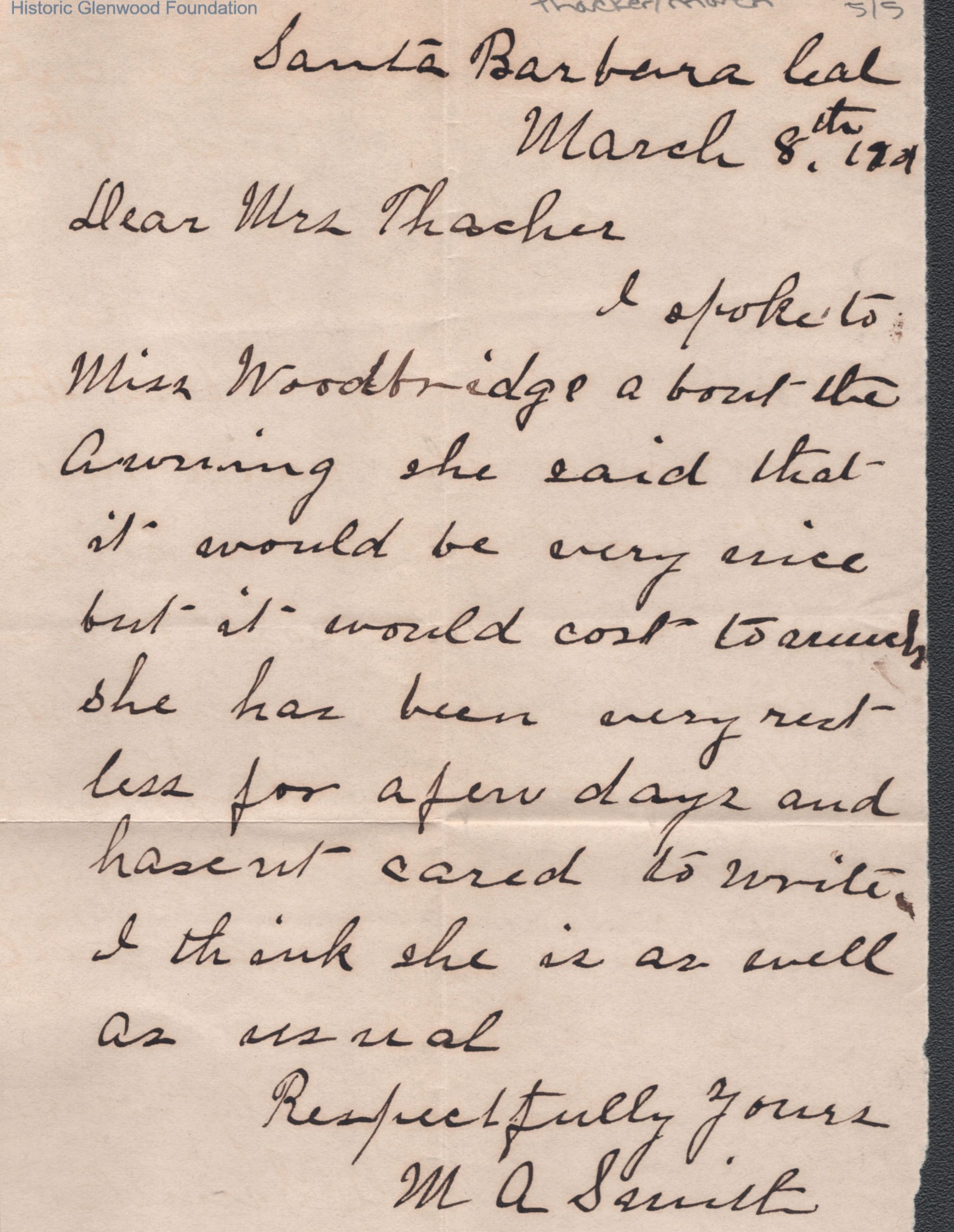 4-page letter to Lucy W. Summers from Lucy Thacker; letter to Mrs. Thacker from M. A. Smith enclosed