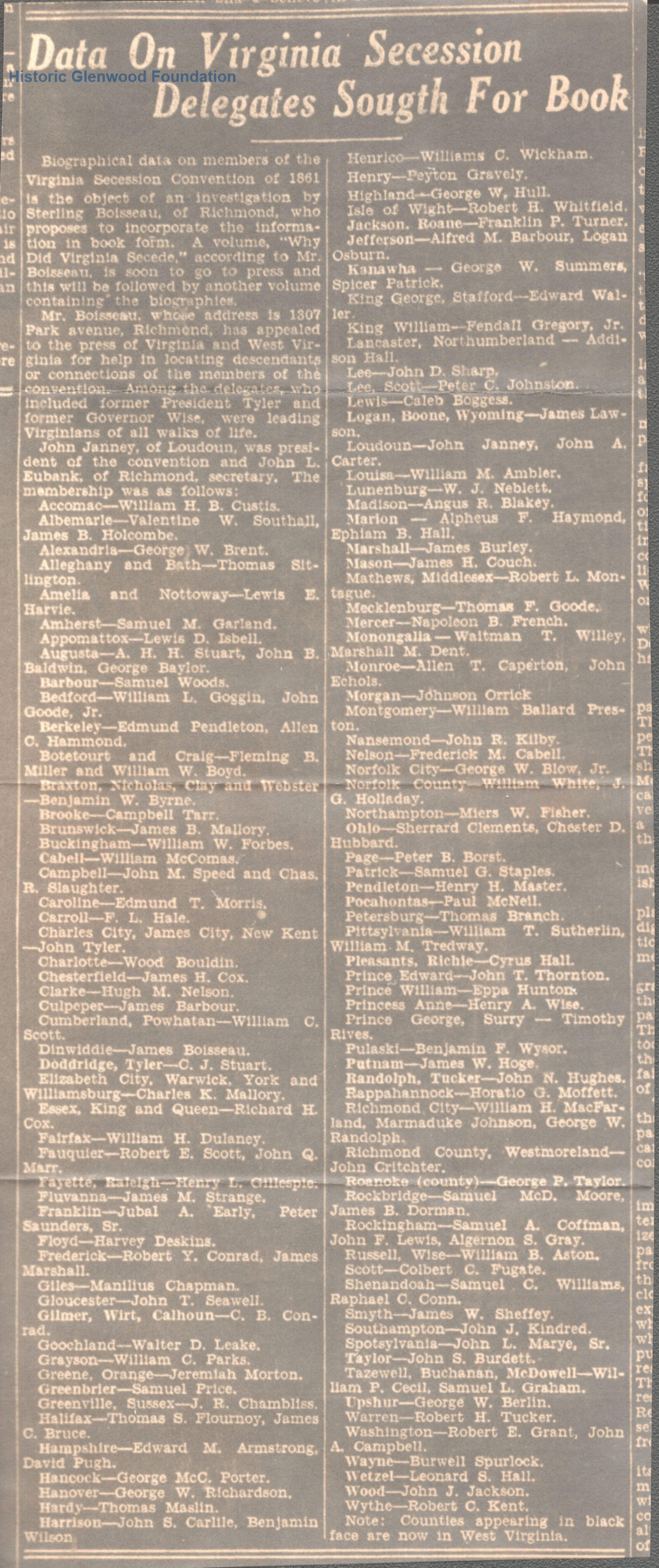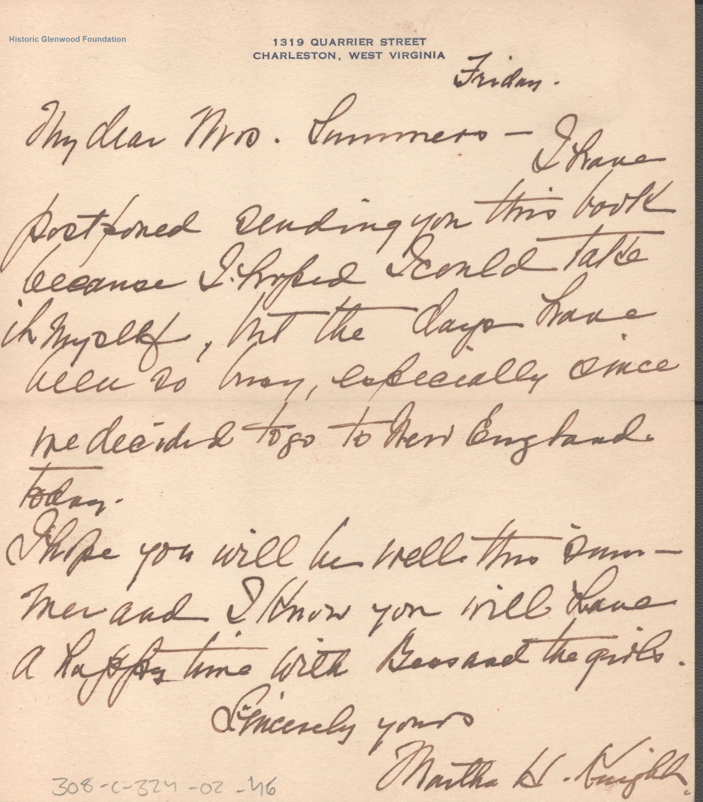 Single page letter to Lucy W. Summers from Martha H. Knight. Enclosure about search for data on Virginia Secession delegates.