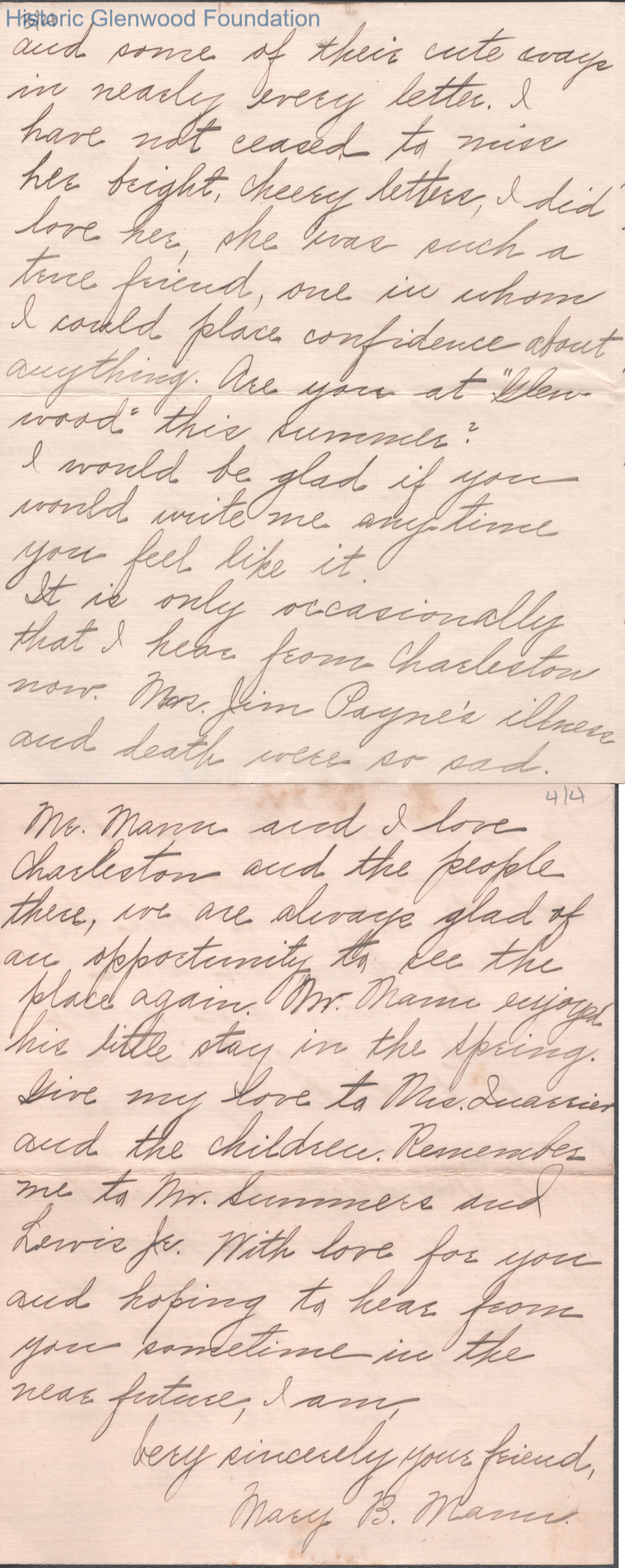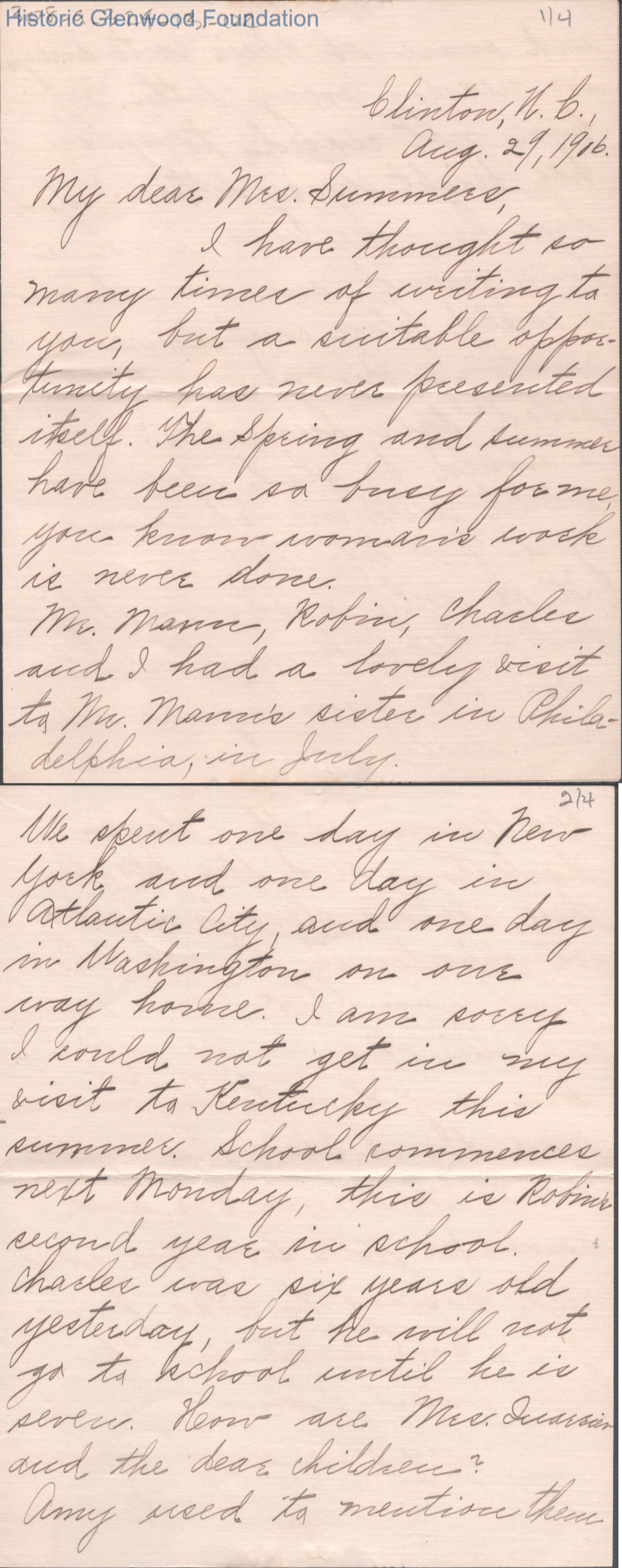 Four-page letter to Lucy W. Summers from Mary B. Mann, Aug 29, 1906.