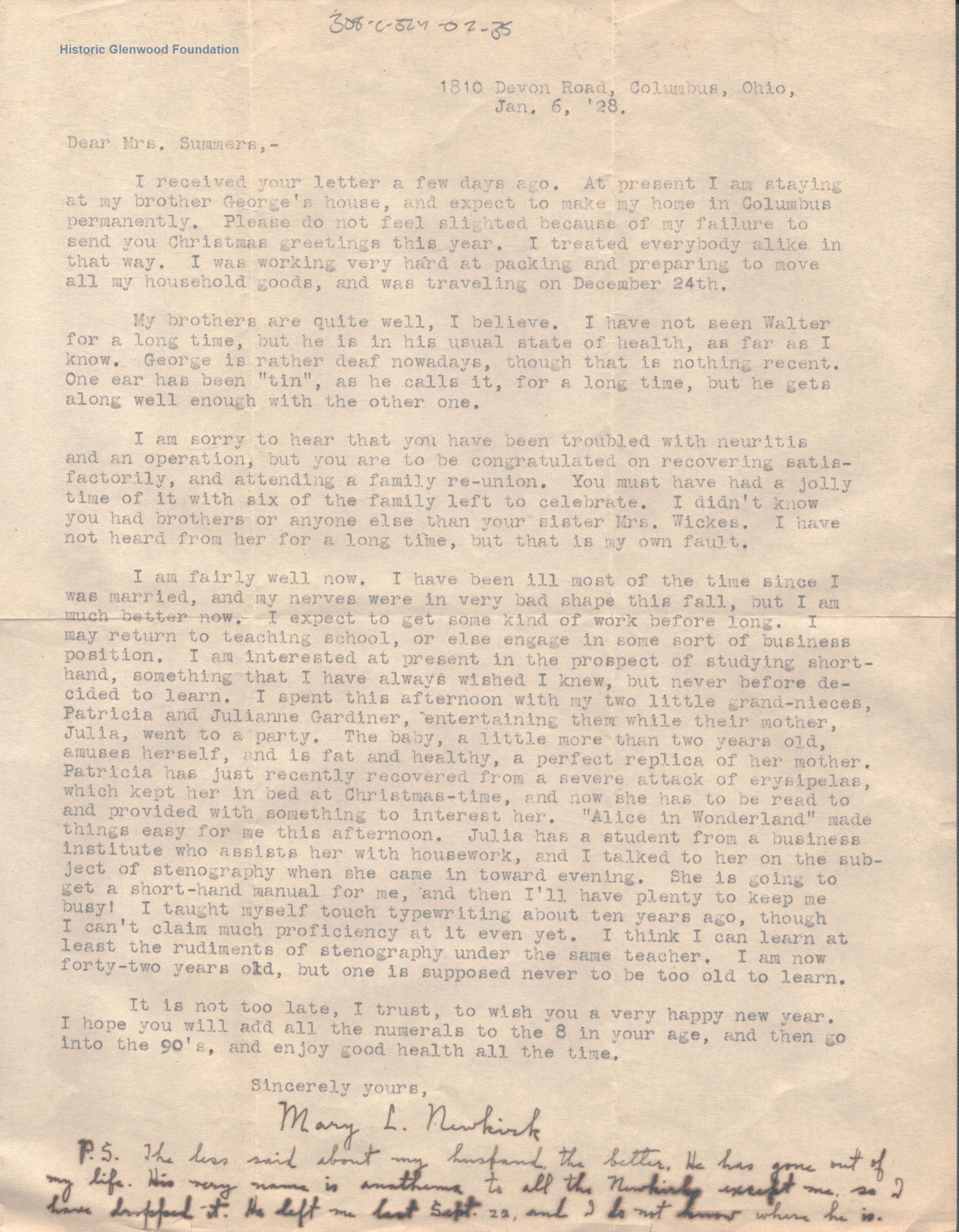 Lucy W. Summers from Mary L. Newkirk; January 6, 1928