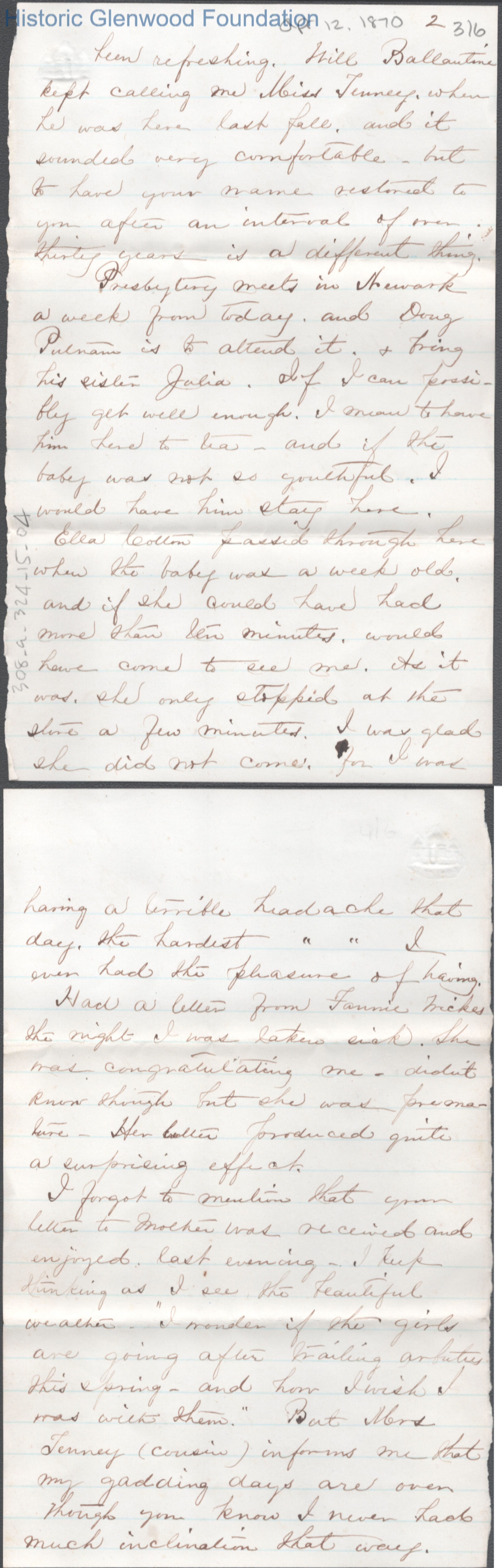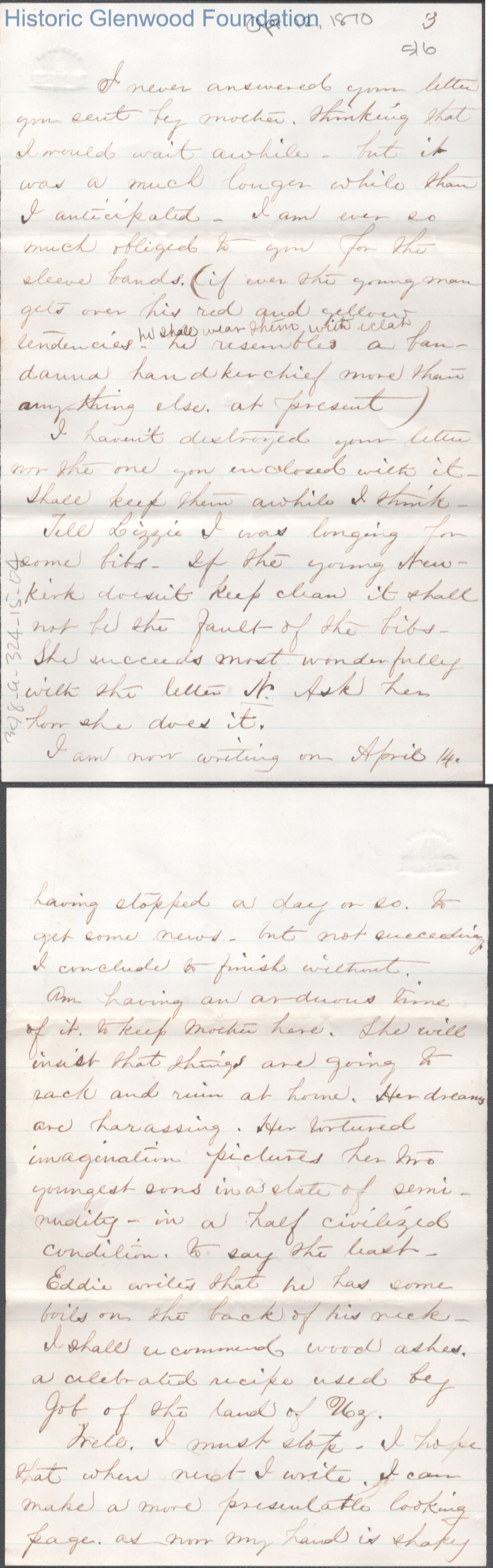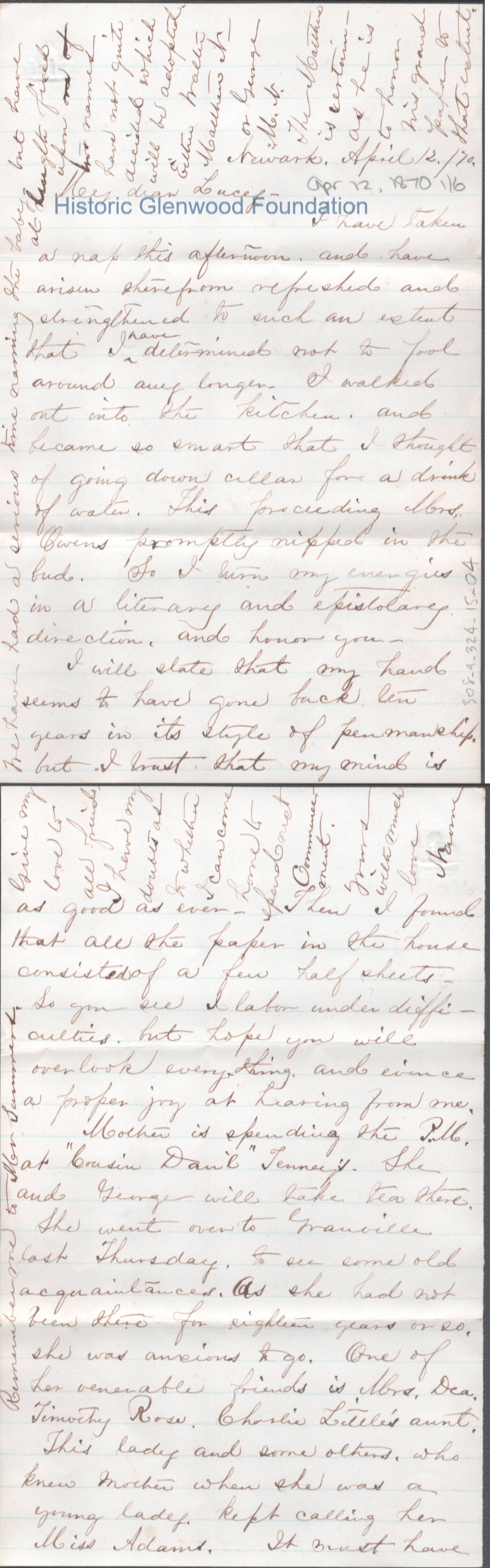 Six-page letter to Lucy W. Summers from Nannie, Apr 12, 1870.