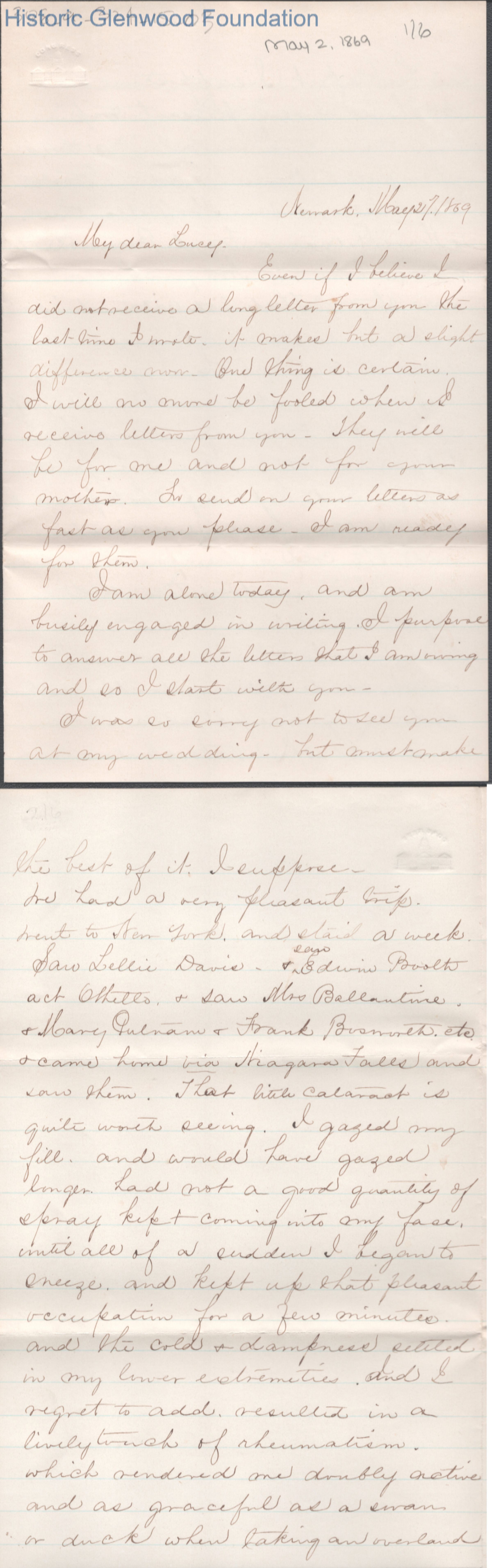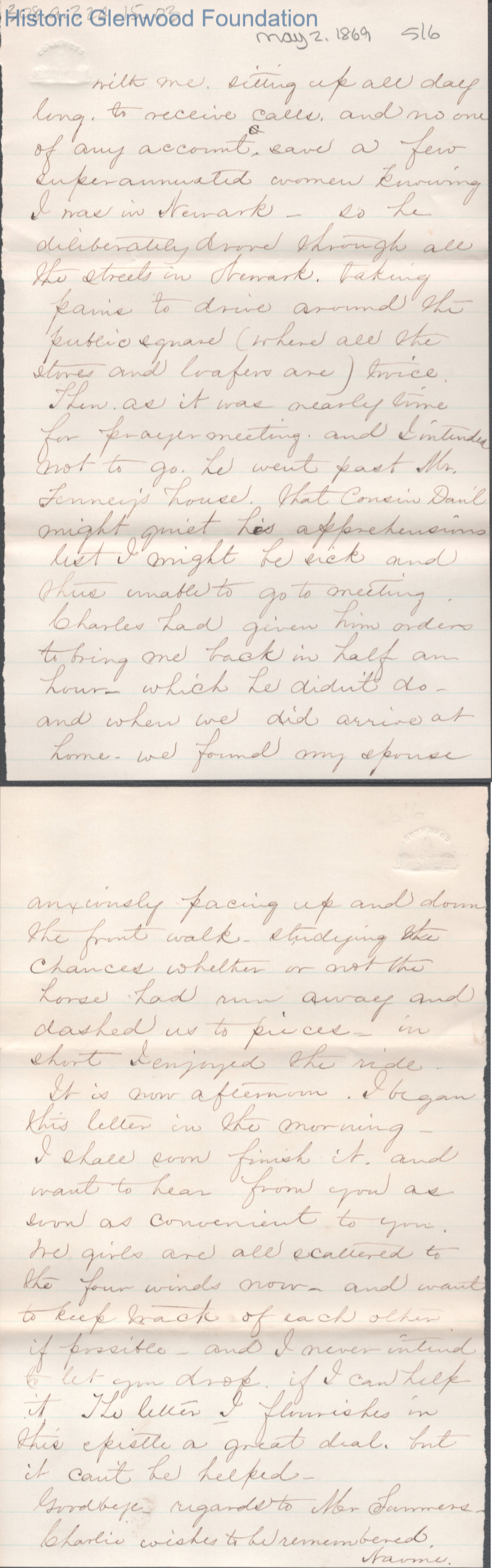 Six-page letter to Lucy W. Summers from Nannie, May 27, 1869.