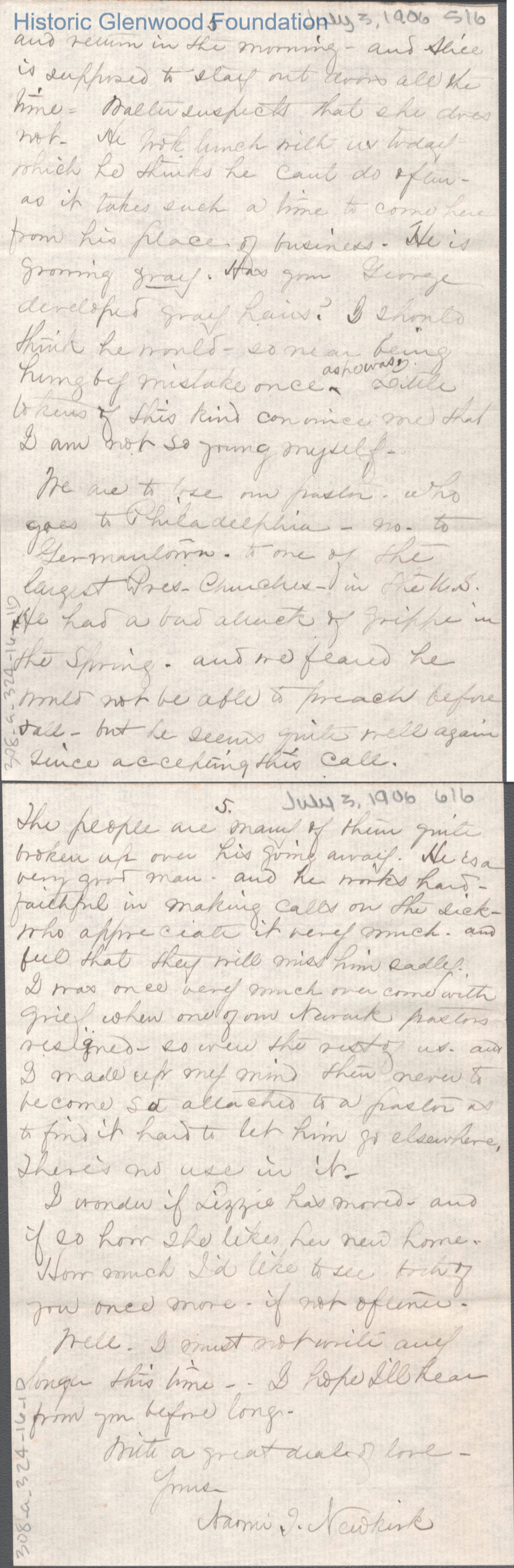 Six-page letter to Lucy W. Summers from Naomi T. Newkirk, Jul 3, 1906.