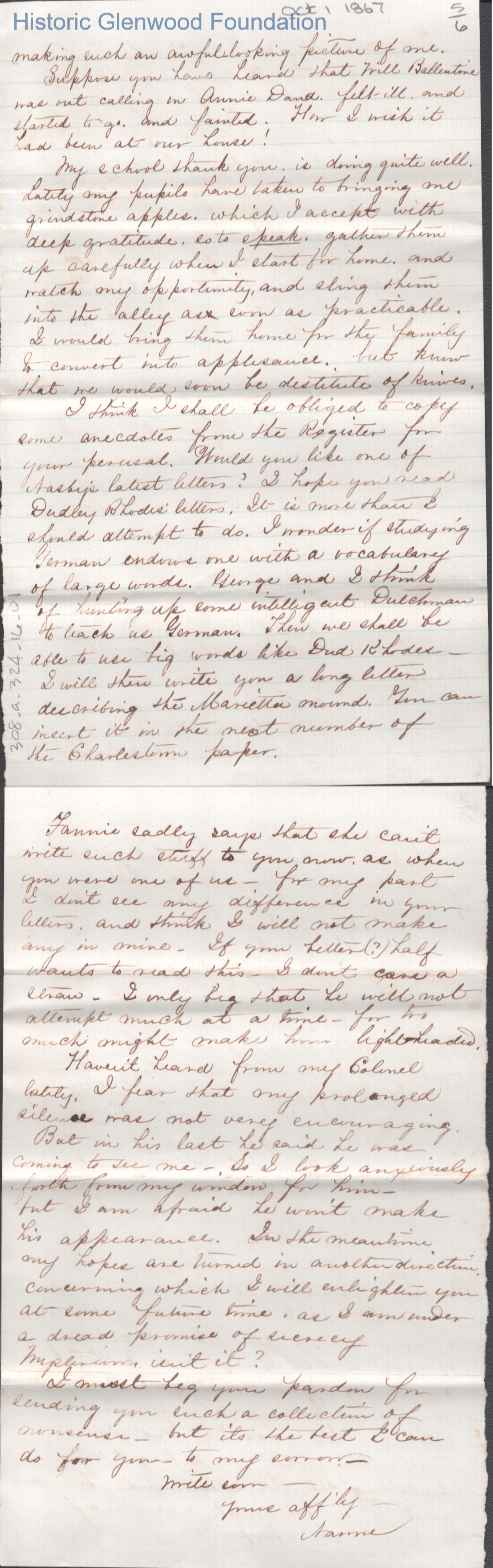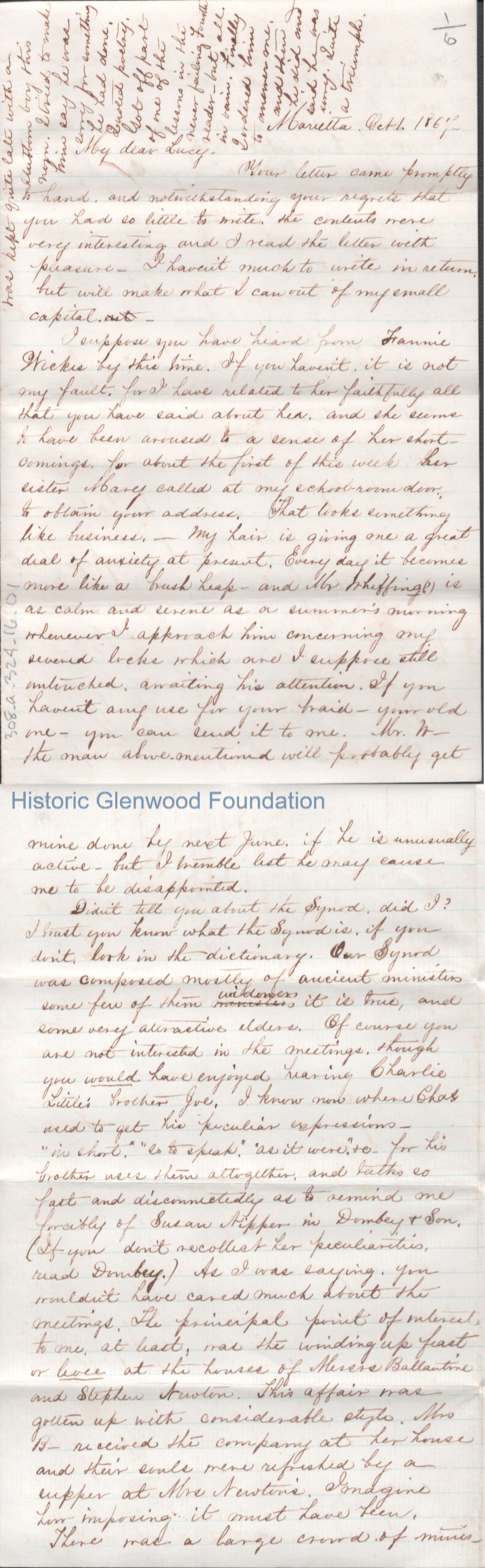 Six-page letter to Lucy W. Summers from Naomi T. Newkirk, Oct 1, 1867.