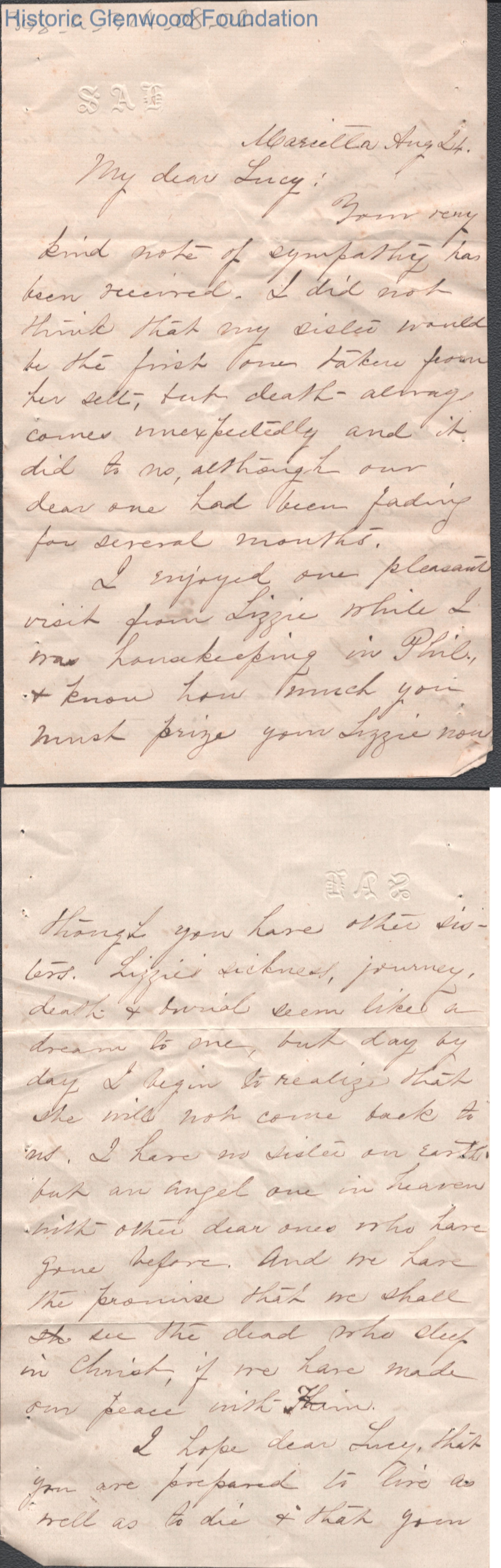 Four-page letter to Lucy W. Summers from Sarah A. Holden, unknown year ("Aug 24") is noted.