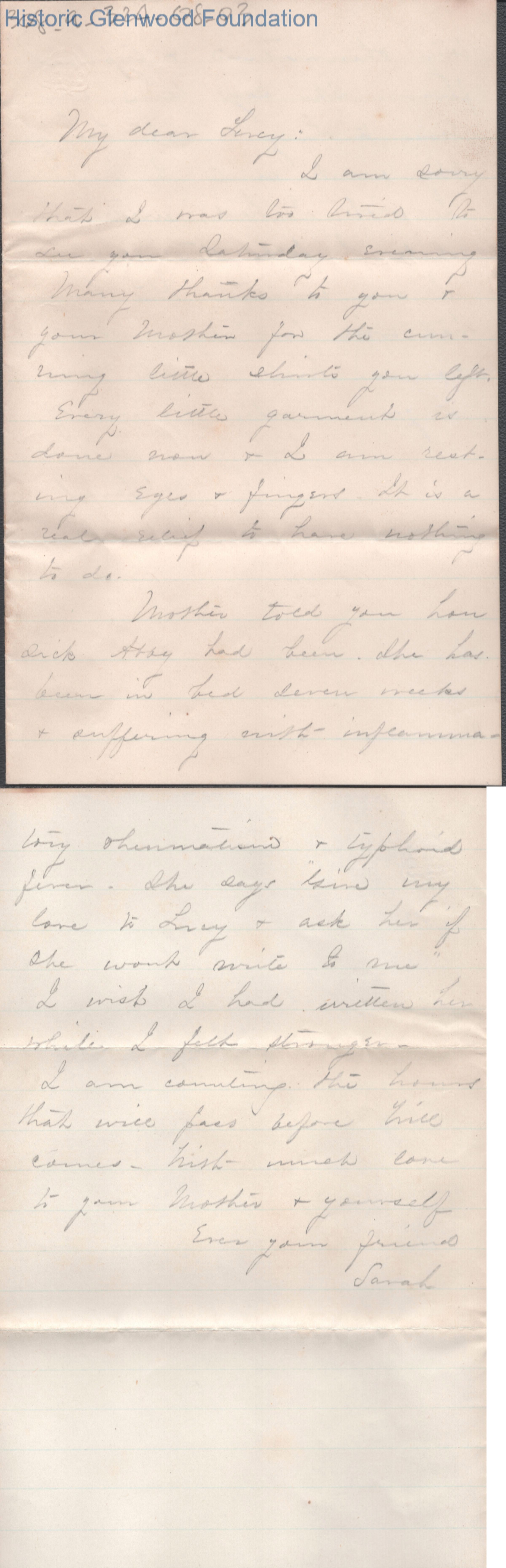 Two-page letter to Lucy W. Summers from Sarah A. Holden, no date.