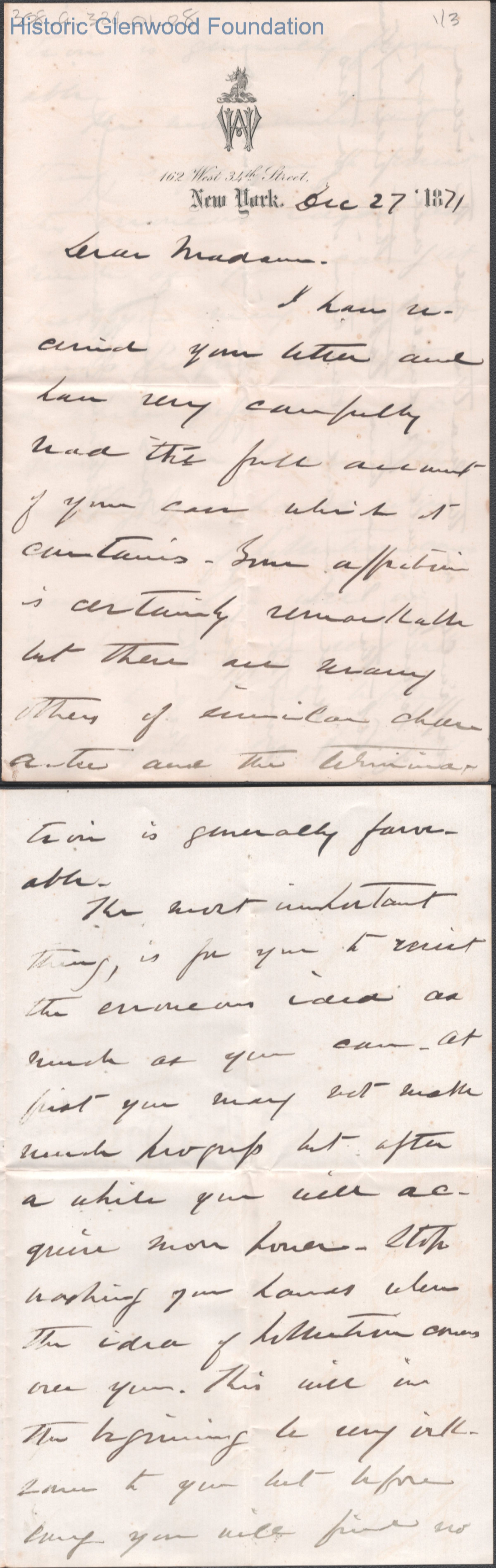 Three-page letter to Lucy W. Summers from unknown sender, Dec 27, 1871. The letter is signed "William A." but the last name is illegible.