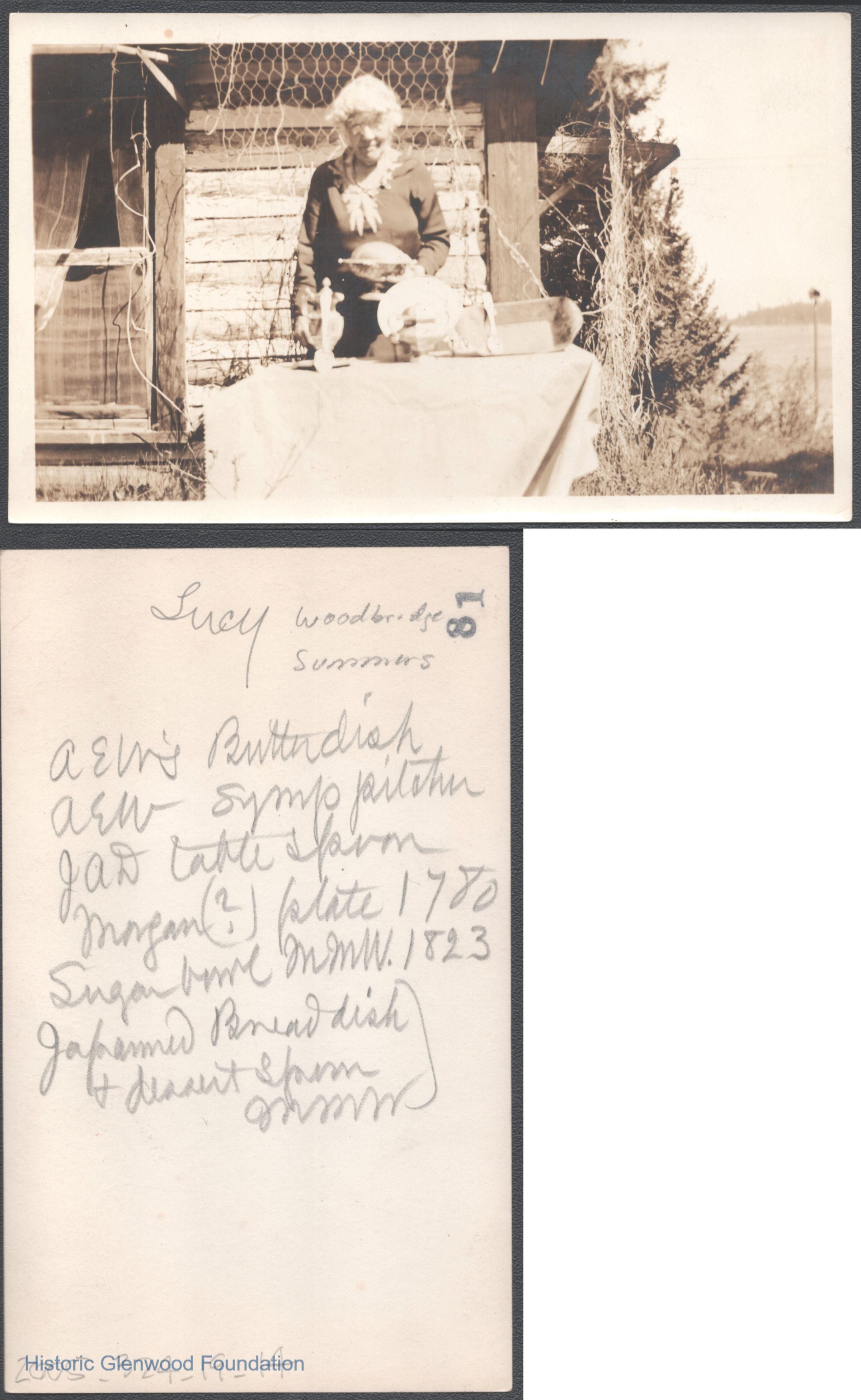 Candid photo of Lucy W. Summers, no date. She is outside and displaying antiques.