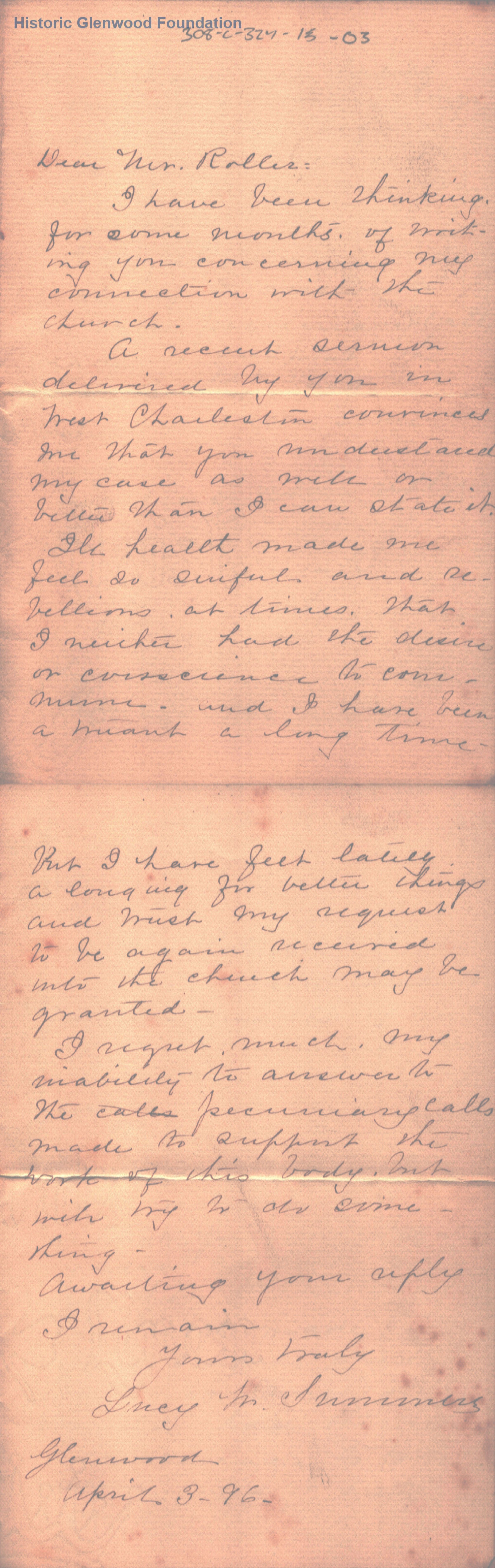 2-page letter from Lucy W. Summers to "Mr. Roller," who was the Rector at St. John's Episcopal Church from 1818 to 1918, n. d.