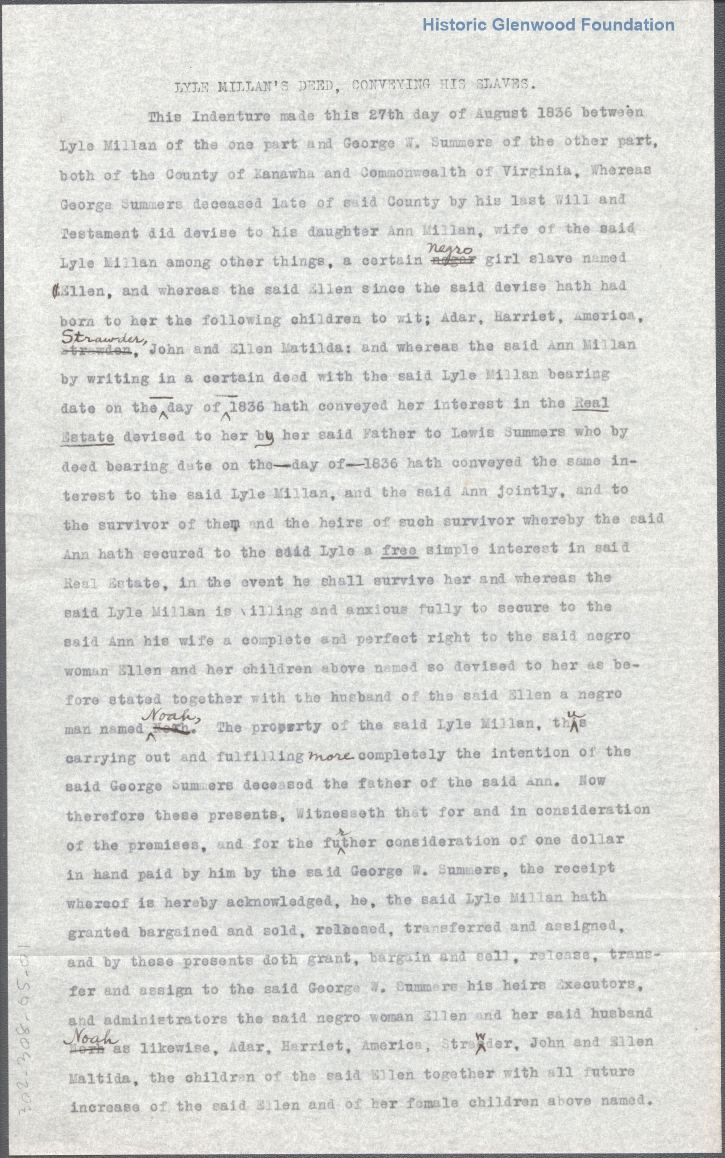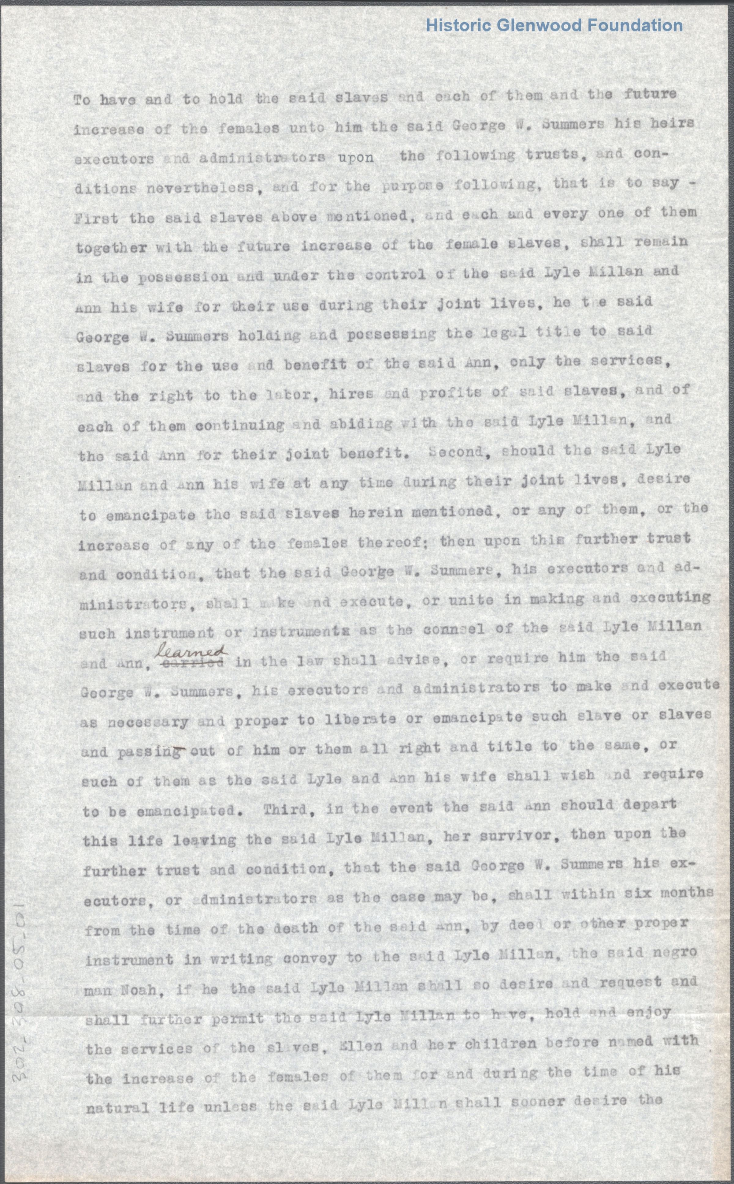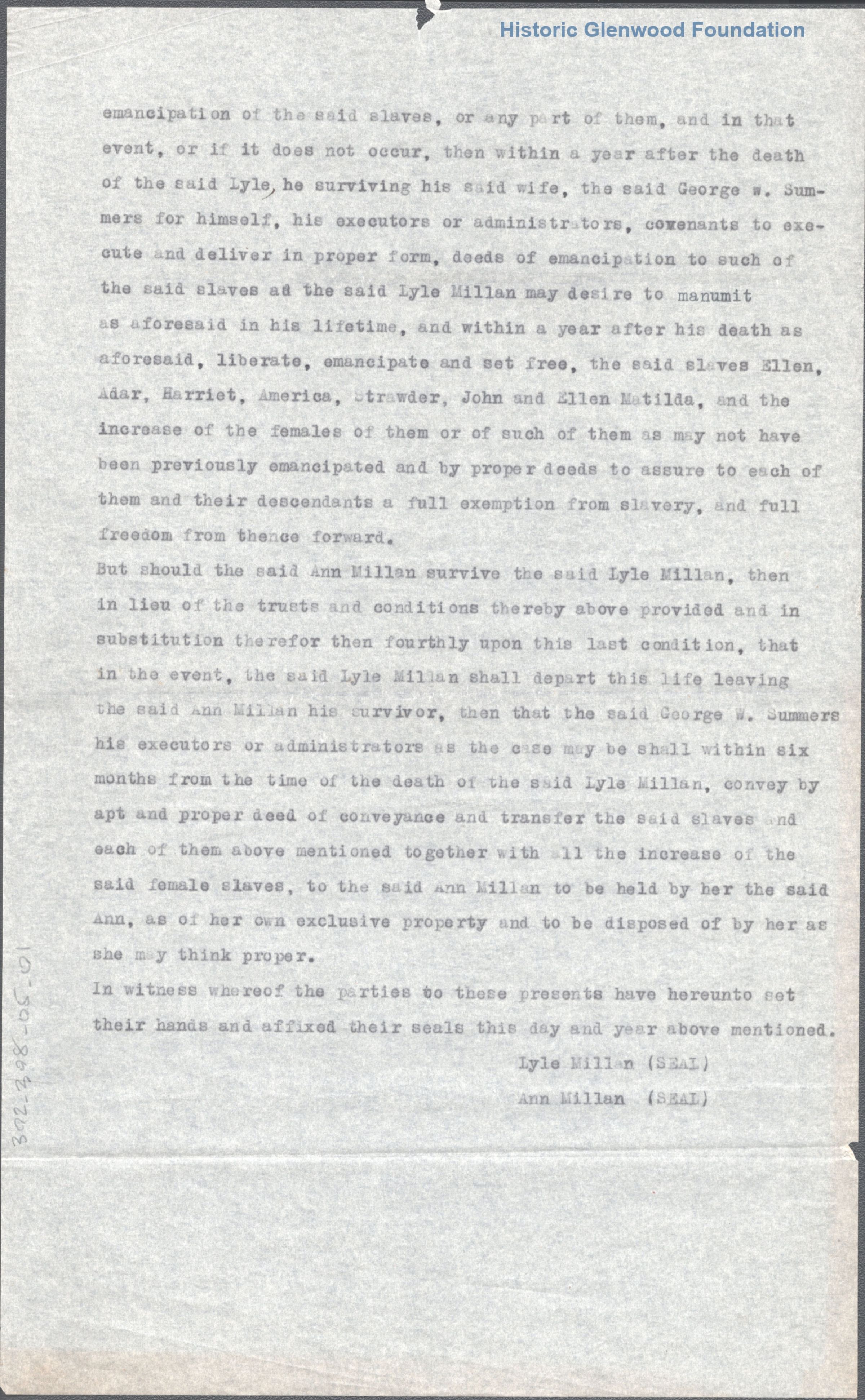 Transcript of a legal document conveying the enslaved persons of Lyle MillanDate(s) of Creation