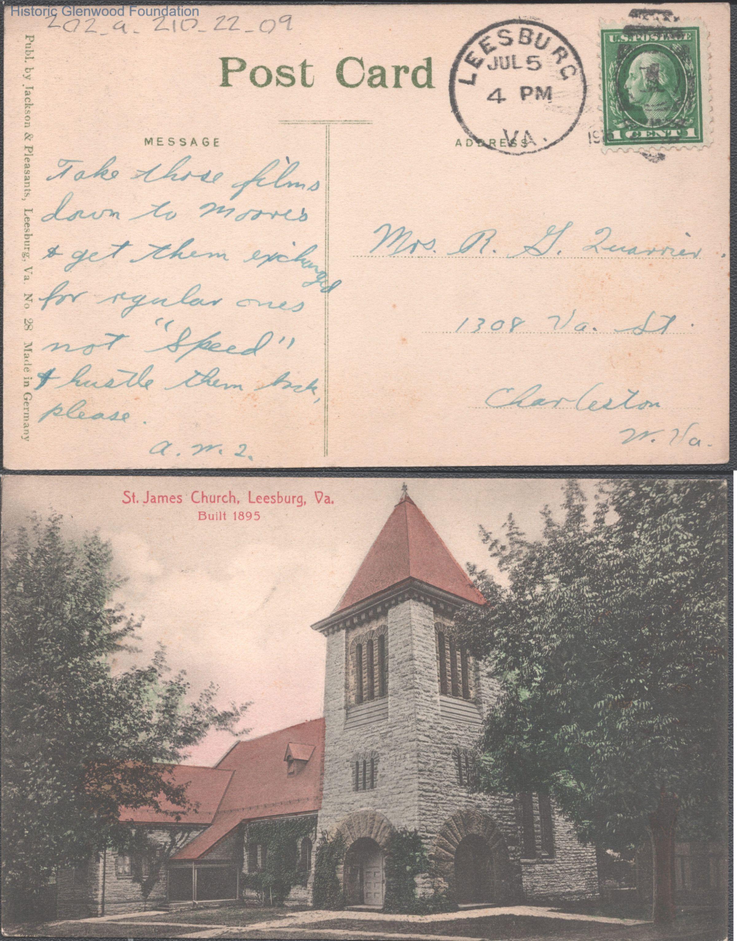Postcard to Elizabeth S. Quarrier from her son Alexander W. Quarrier, Jul 5, 1916.