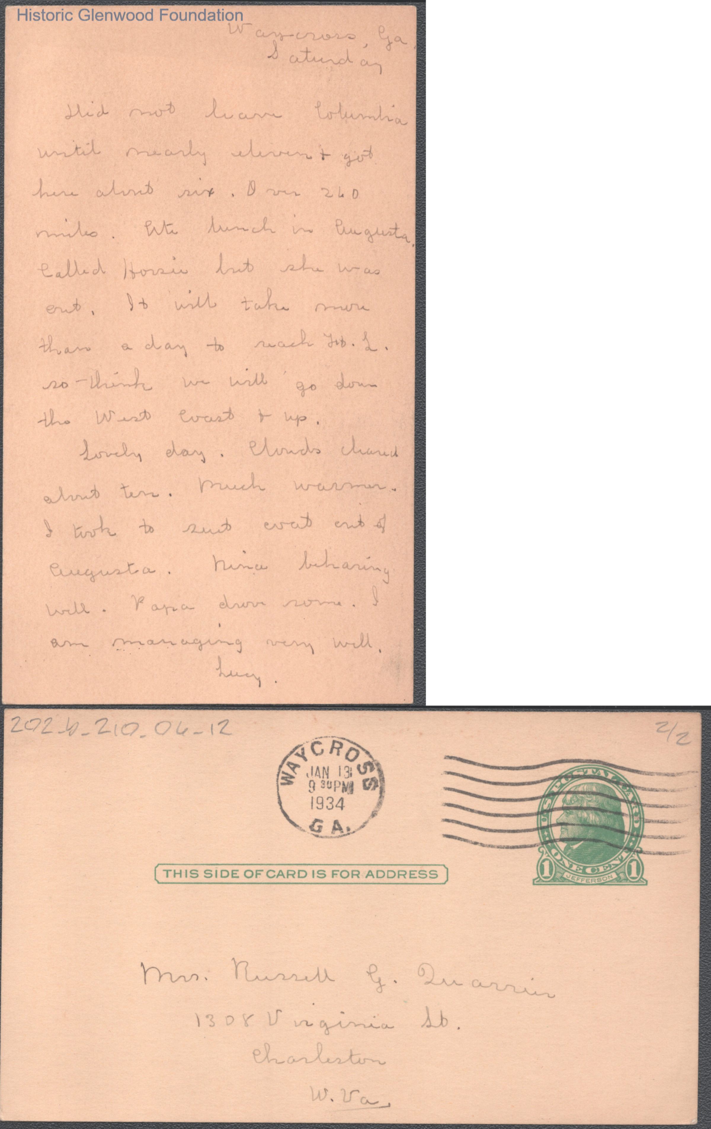 Postcard to Elizabeth S. Quarrier from Lucy S. Quarrier, Jan 13, 1934.