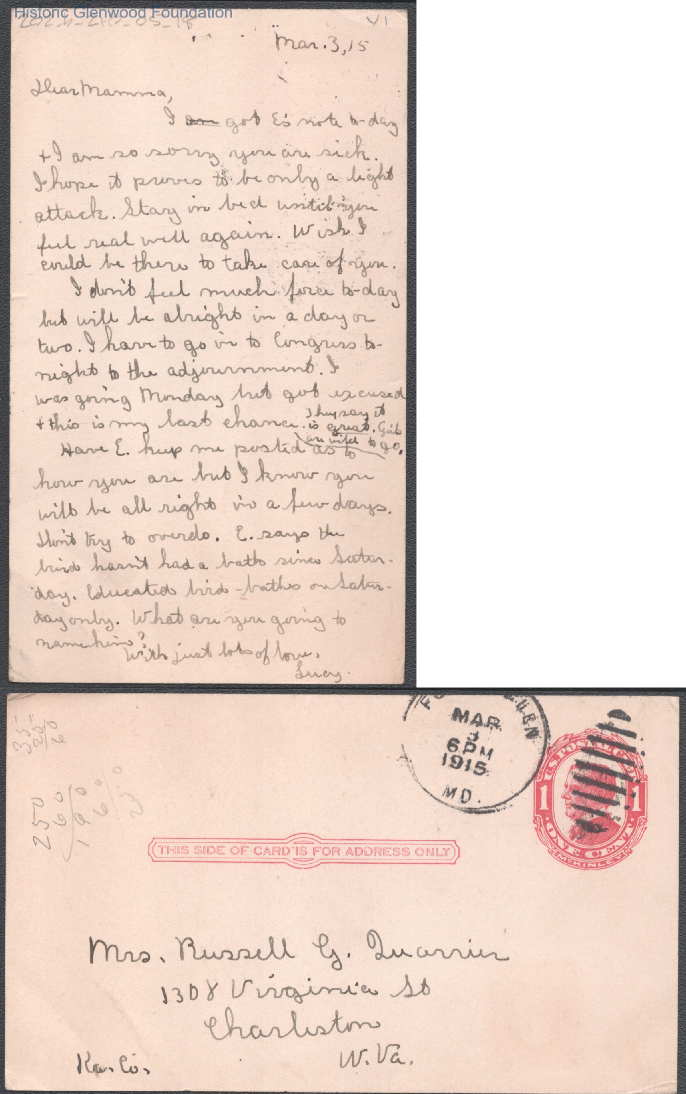 Postcard to Elizabeth S. Quarrier from Lucy S. Quarrier, Mar 3, 1915