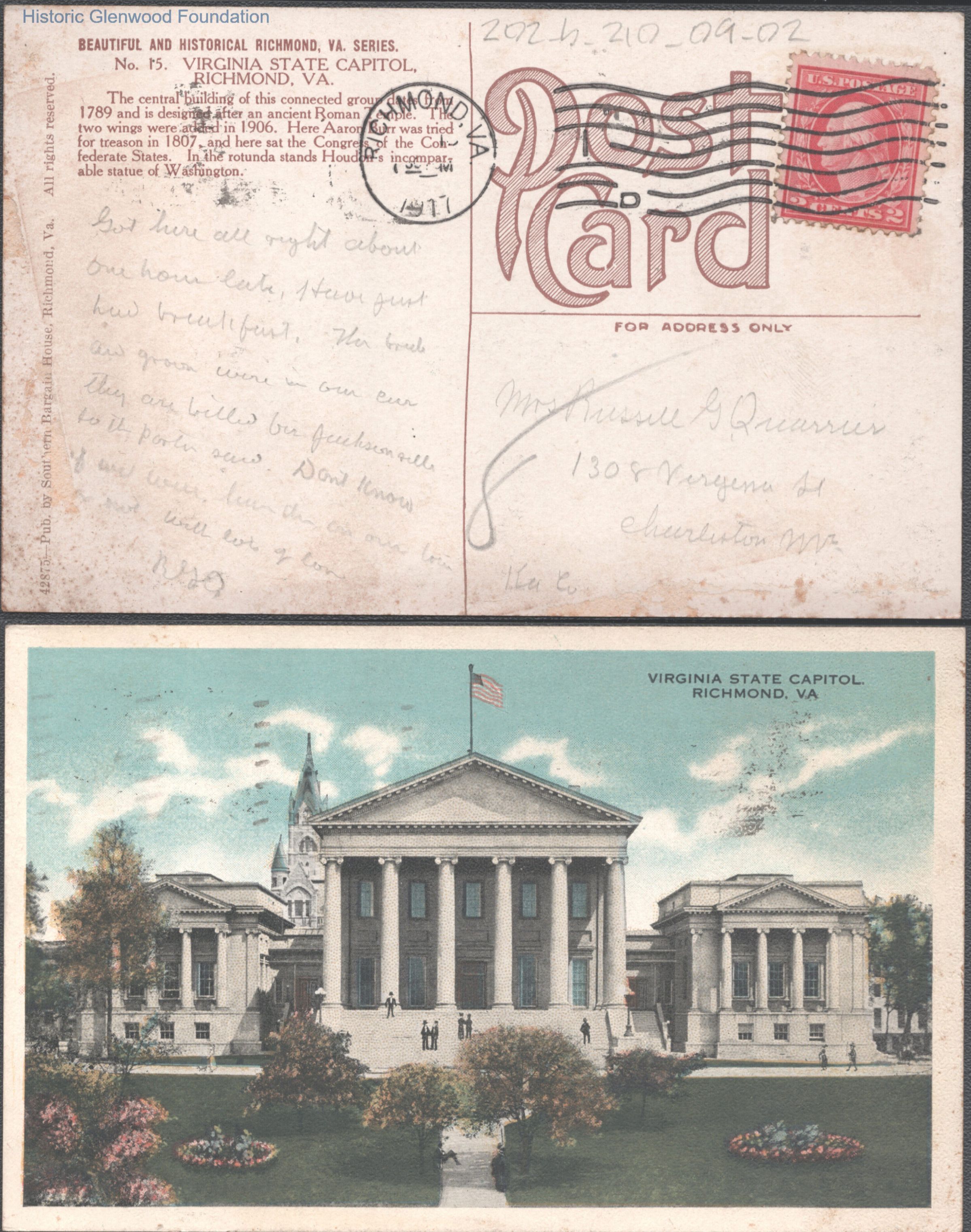 Postcard to Elizabeth S. Quarrier from Russell G. Quarrier, c. 1917.