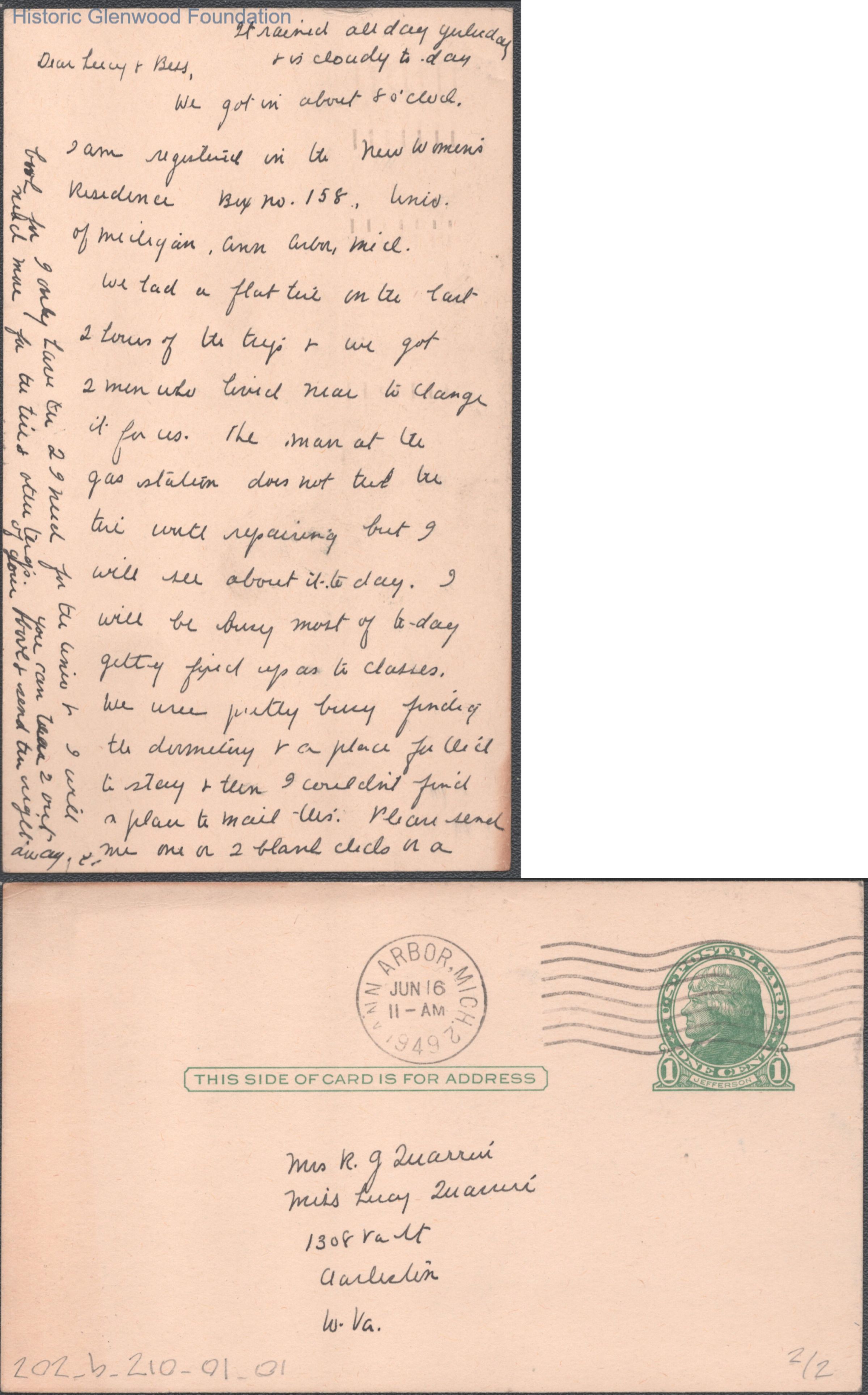 Postcard to Elizabeth S. Quarrier from Elizabeth G. Quarrier, Jun 16, 1949.