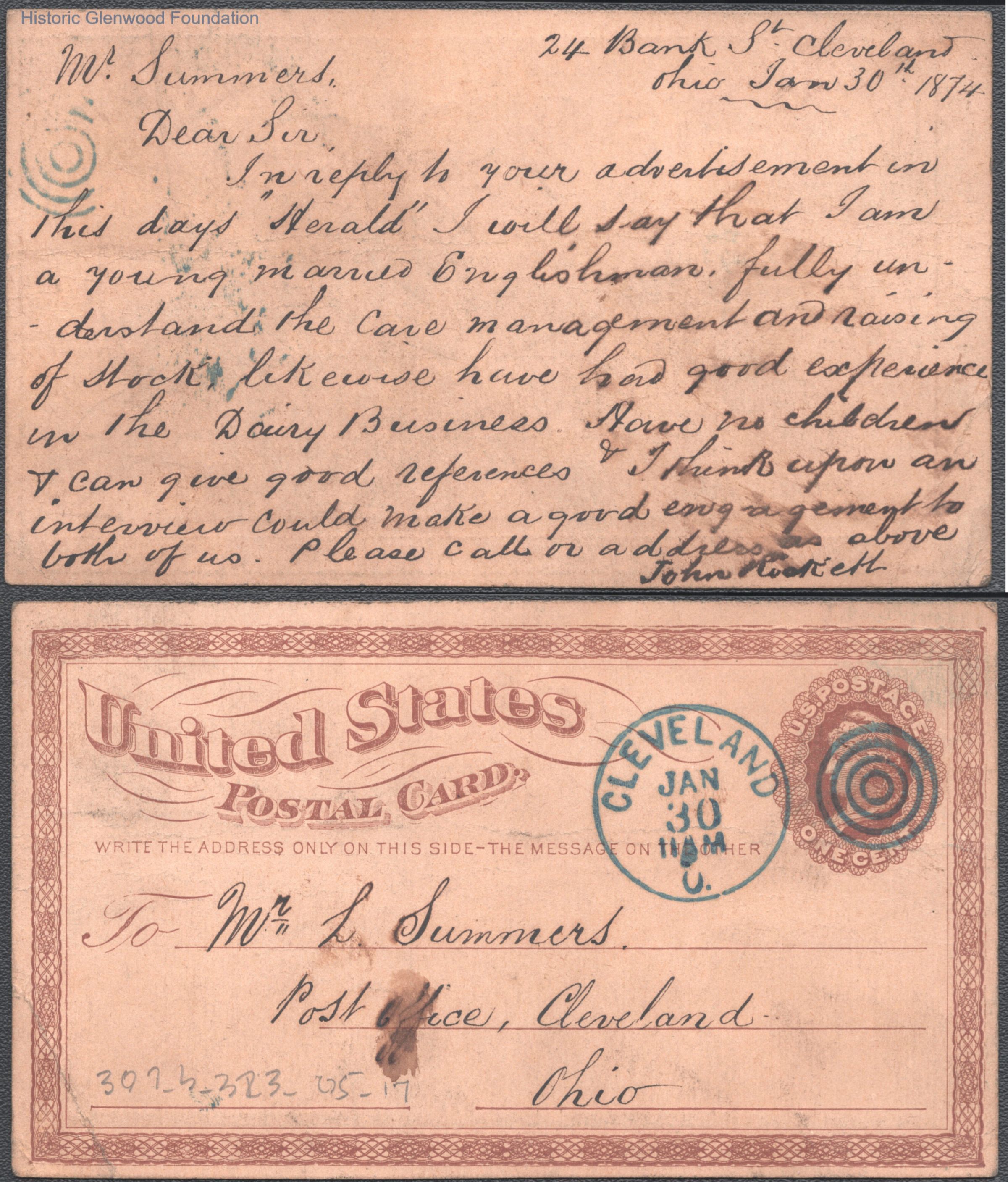Postcard to Lewis Summers from John Rockett, Jan 30, 1874.