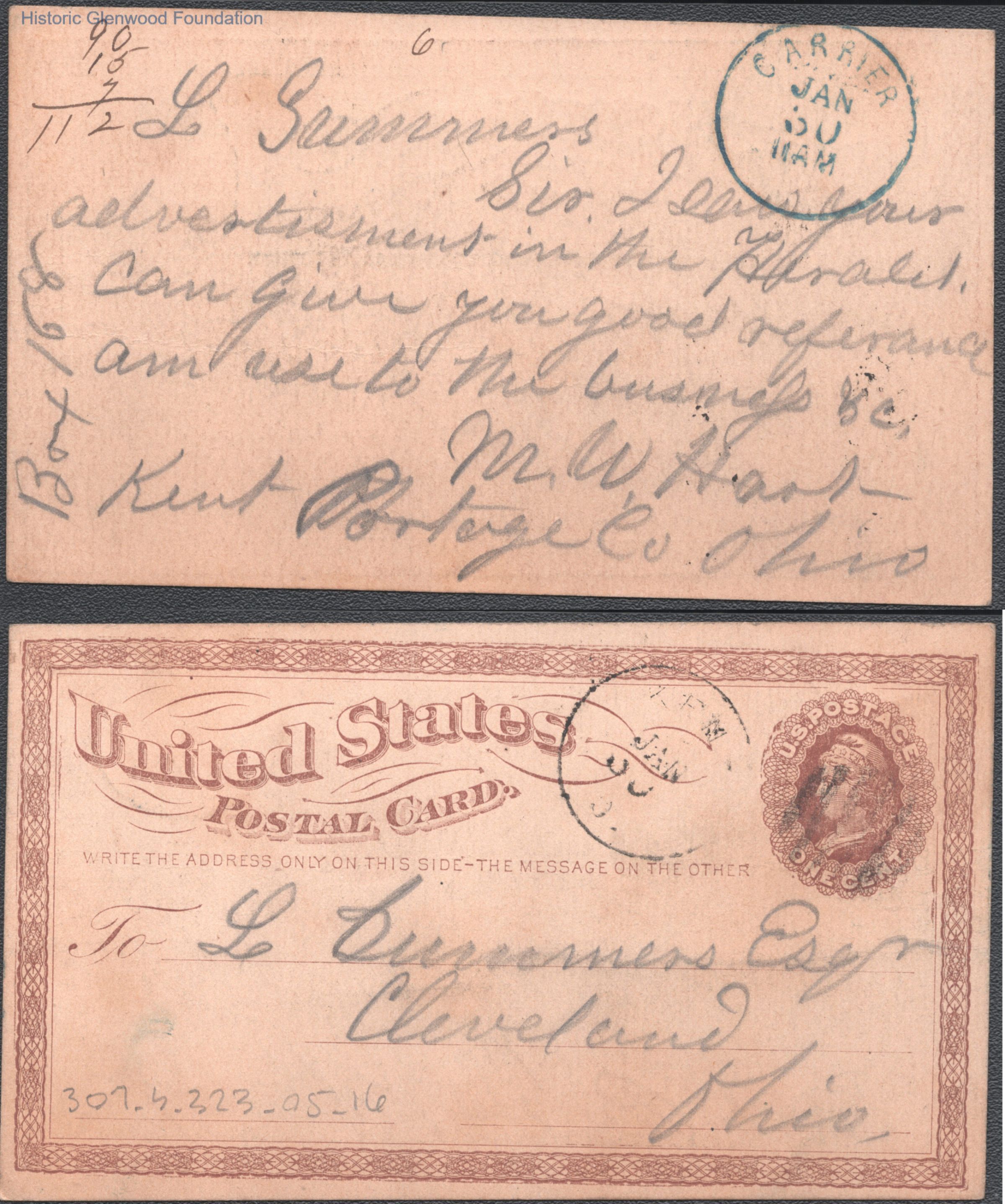 Postcard to Lewis Summers from M. W. Hart, Jan 30, 1874.