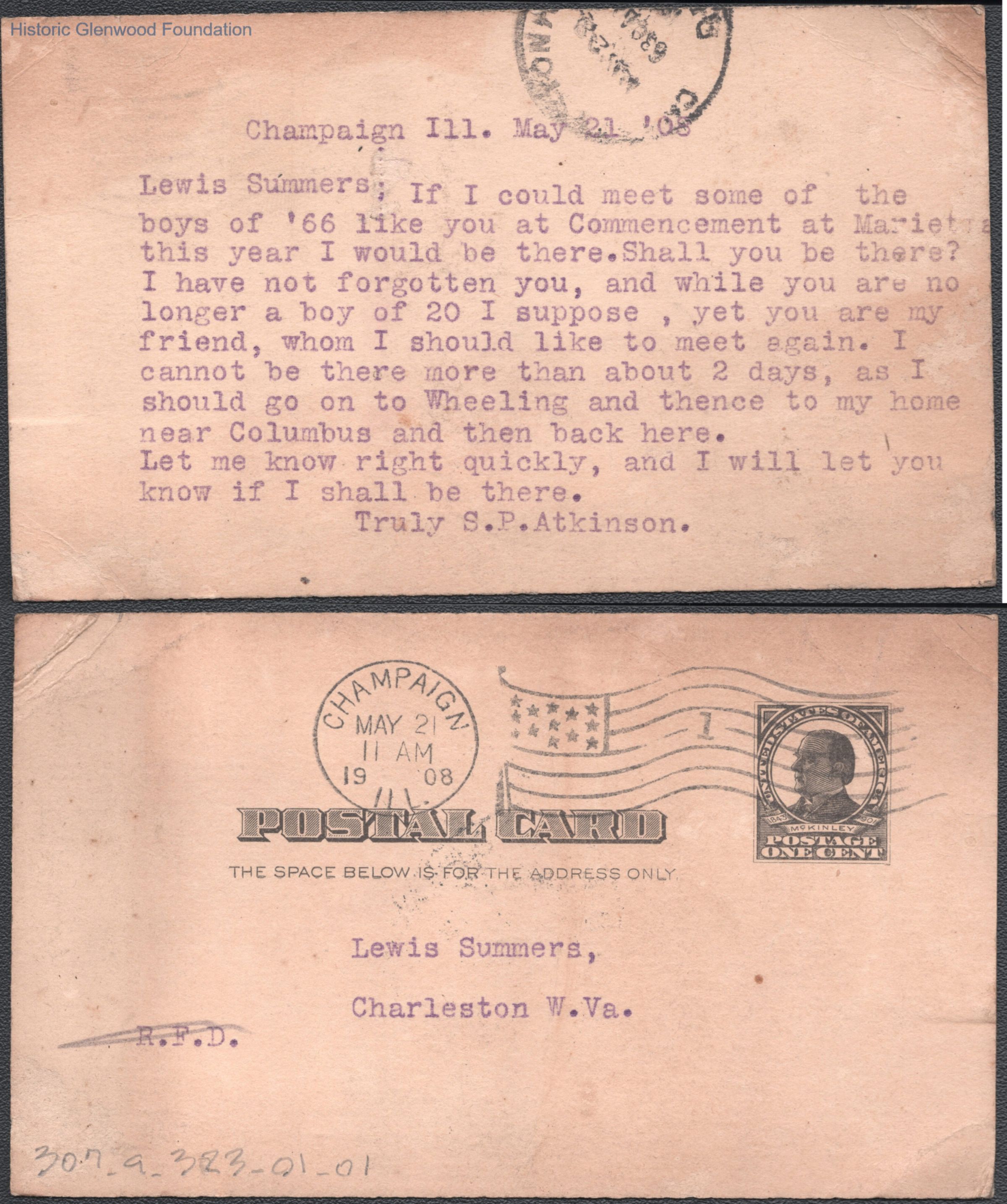 Postcard to Lewis Summers from S. P. Atkinson, May 21, 1908.
