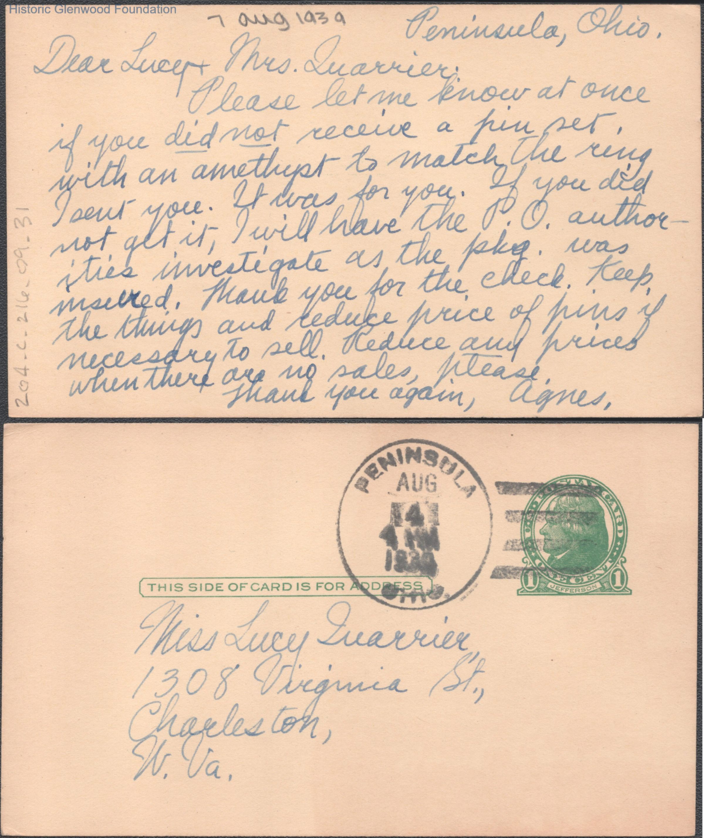 Postcard to Lucy S. Quarrier & Elizabeth G. Quarrier from Elizabeth S. Quarrier, Aug 7, 1939.