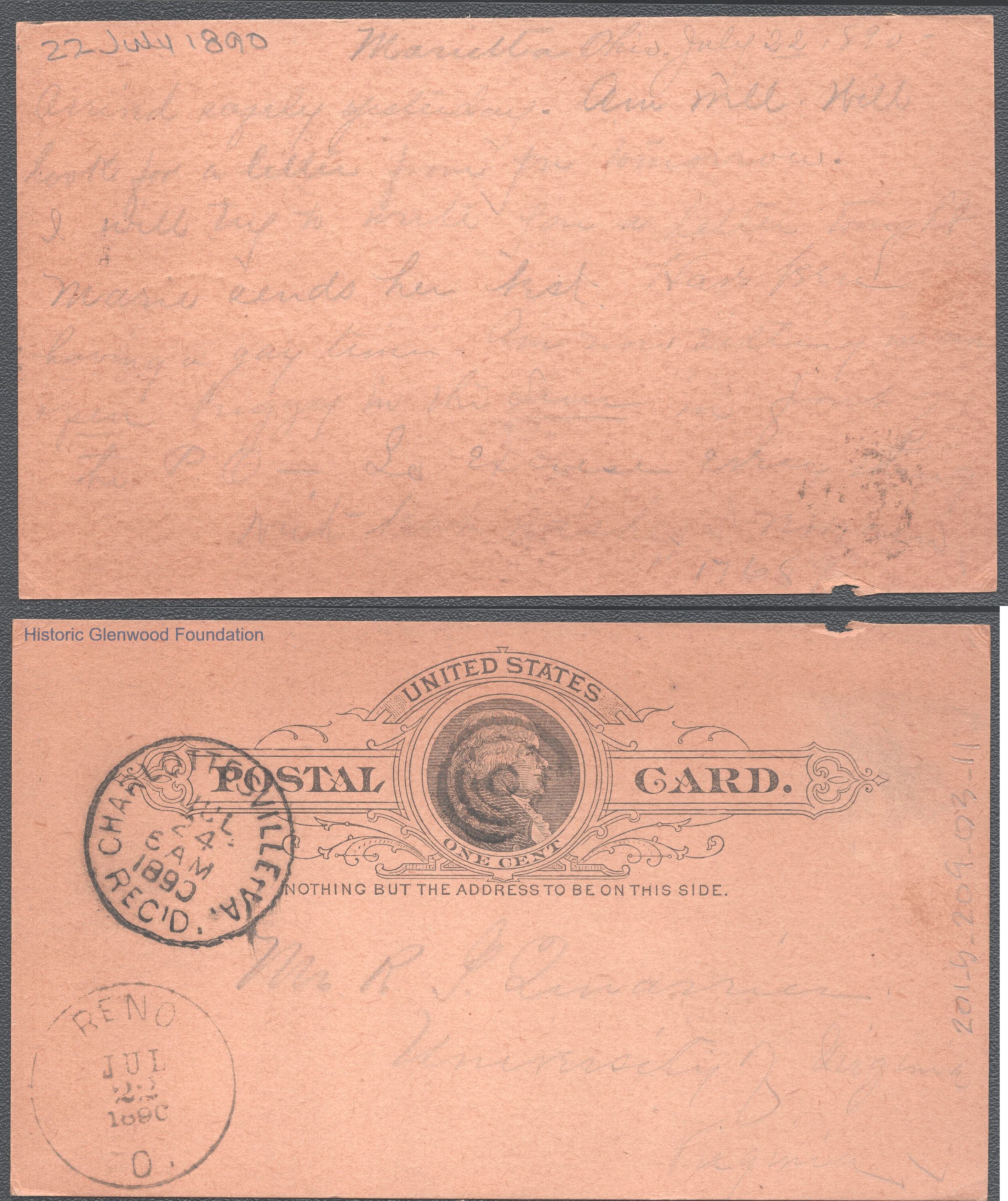 Postcard to Russell G. Quarrier from Elizabeth S. Quarrier, Jul 22, 1890.
