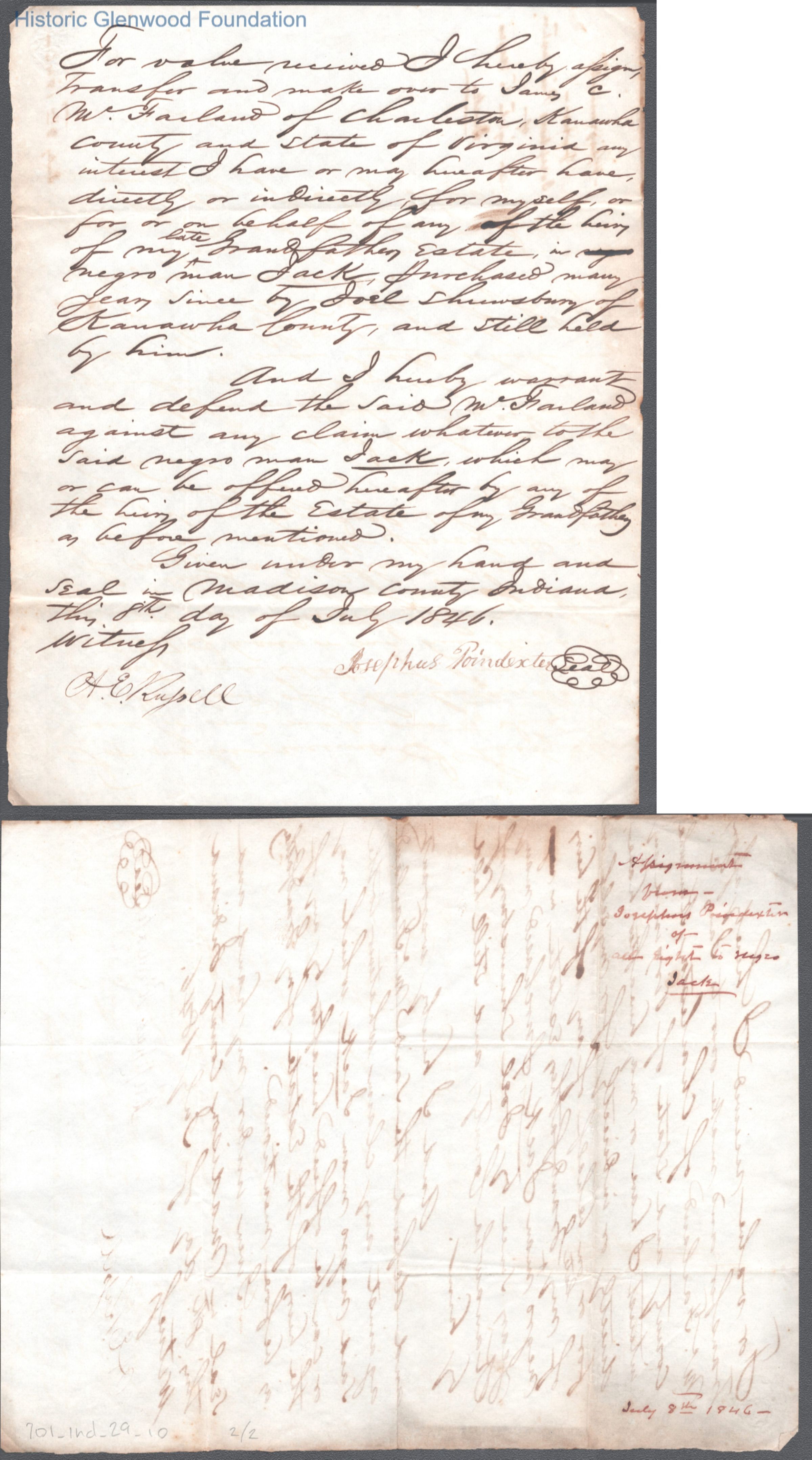Receipt for Josephus Poindexter slave sale to James C. McFarland, Jul 8, 1846.