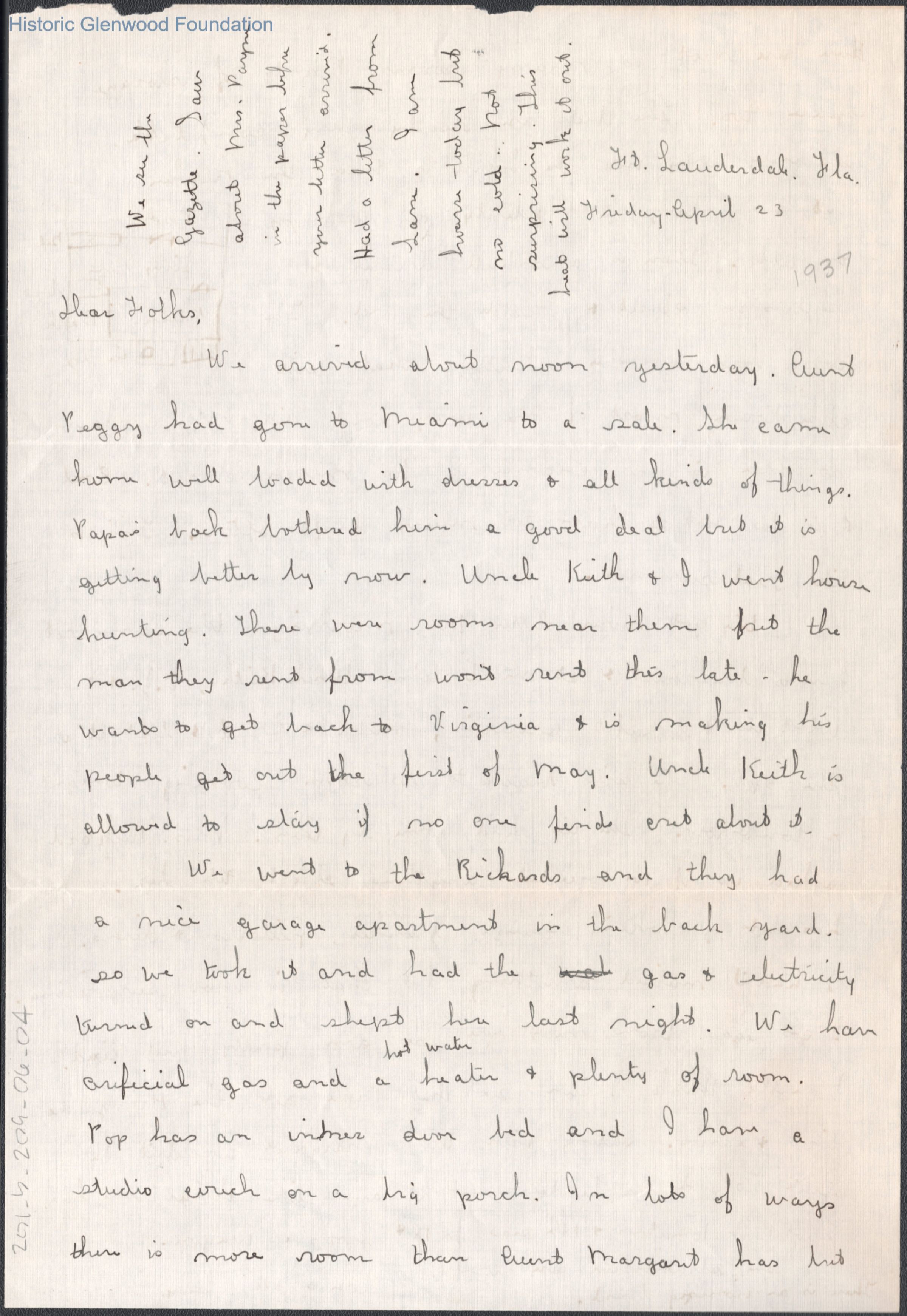 Two-page letter to Russell G. & Elizabeth S. Quarrier from daughter Lucy S. Quarrier, Apr 23, 1937.