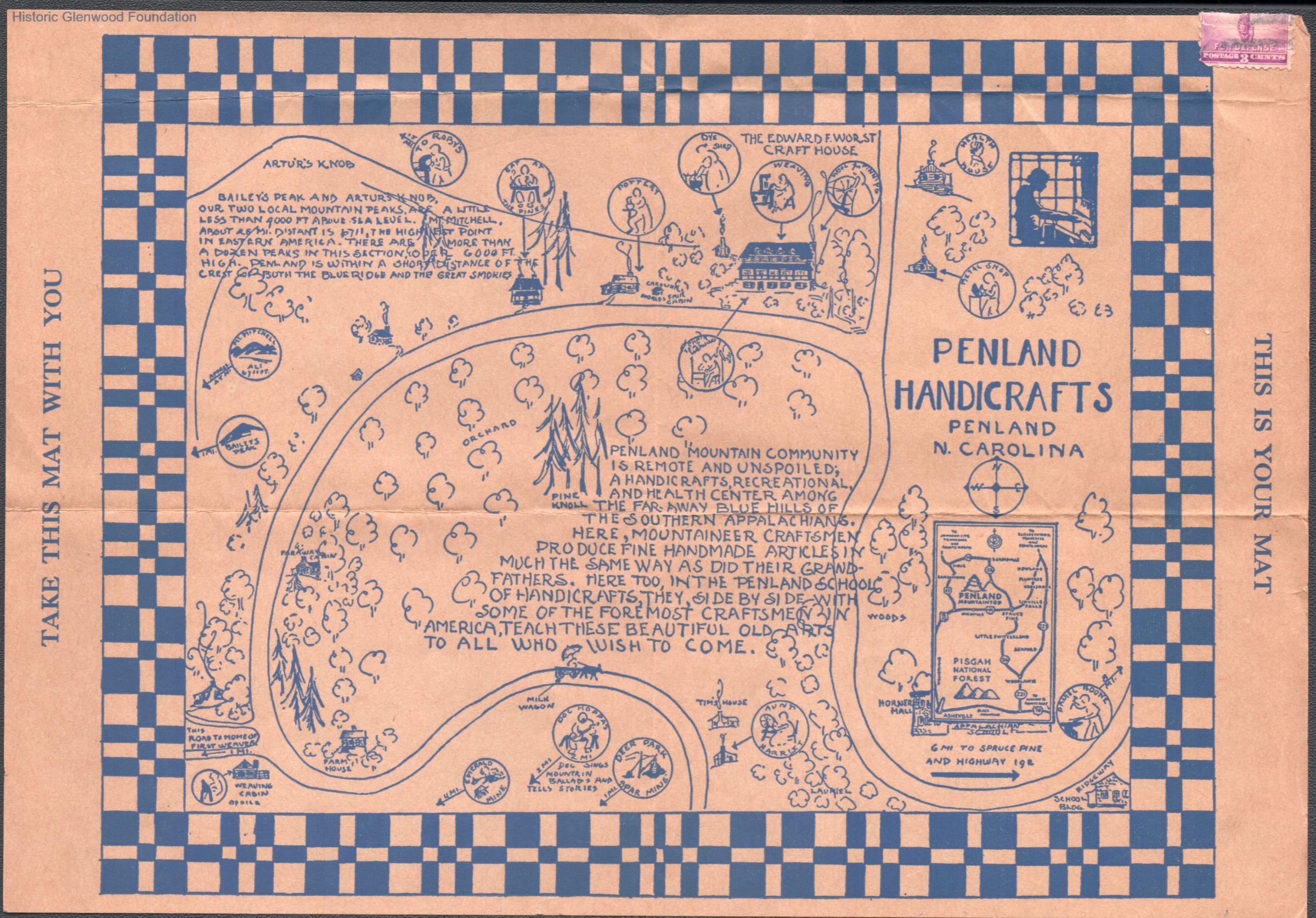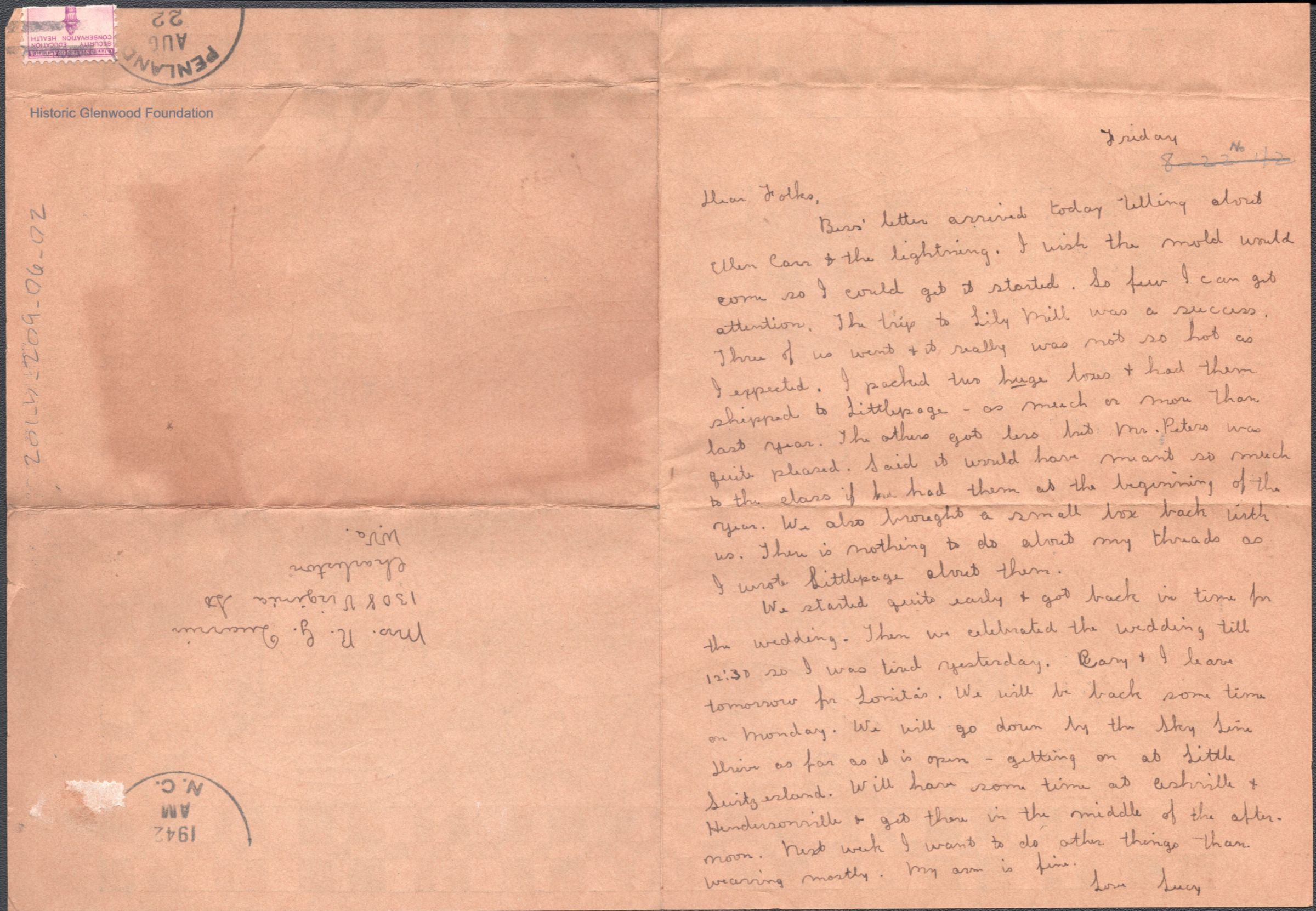 Single page letter to Russell G. & Elizabeth S. Quarrier from daughter Lucy S. Quarrier, postmarked Aug 22, 1942. Written on reverse of a restaurant placemat.
