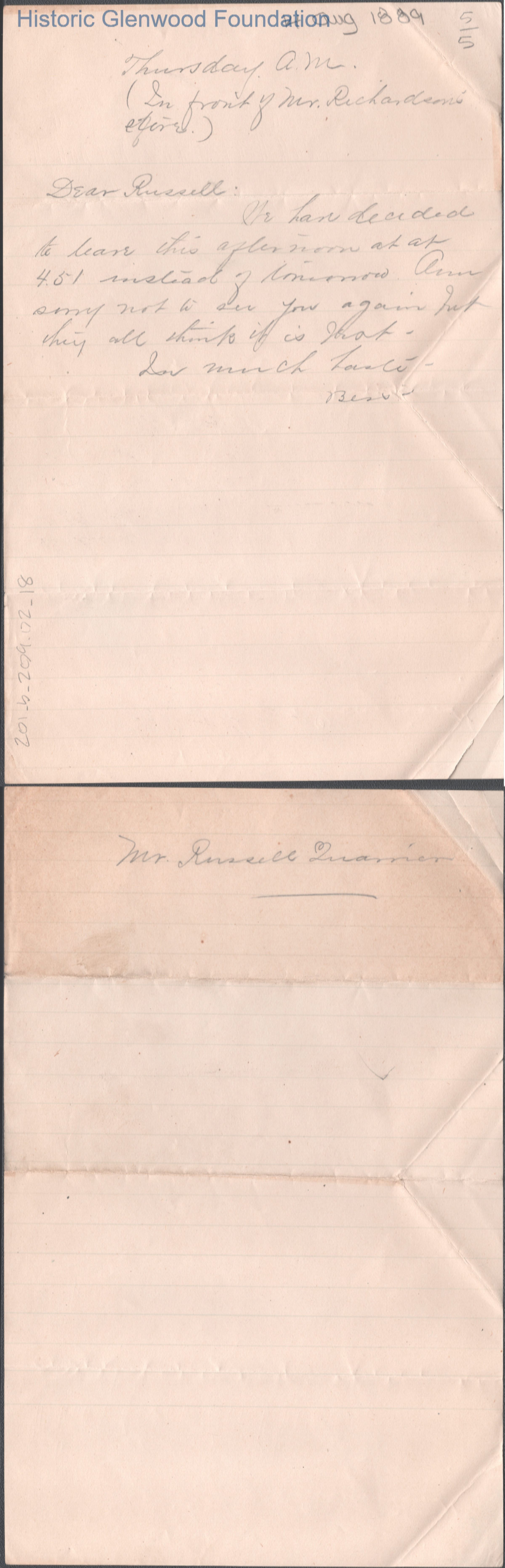 Five-page letter to Russell G. Quarrier from Elizabeth S. Quarrier, Aug 14, 1889.