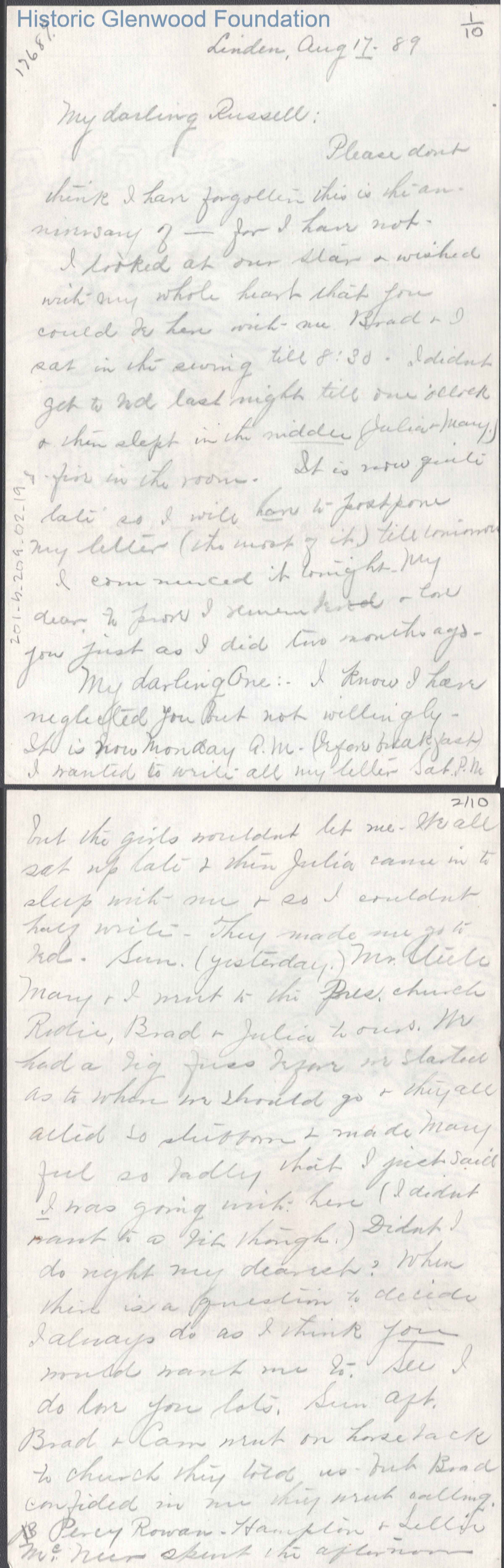 Russell G. Quarrier from Elizabeth S. Quarrier, Aug 17, 1889