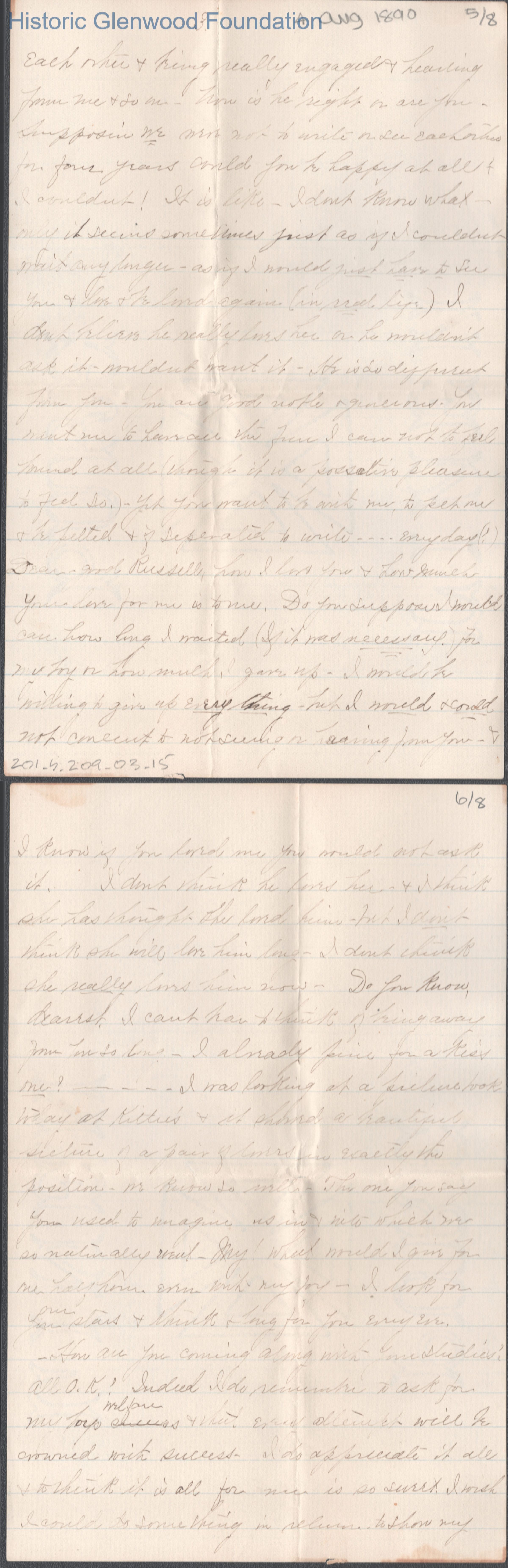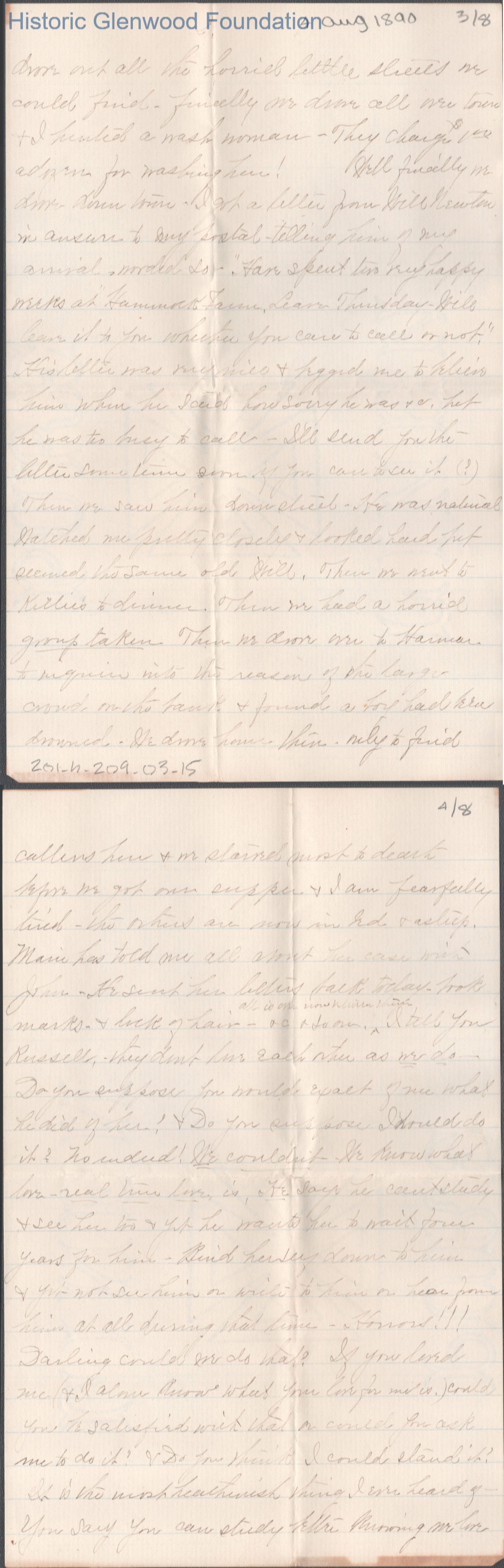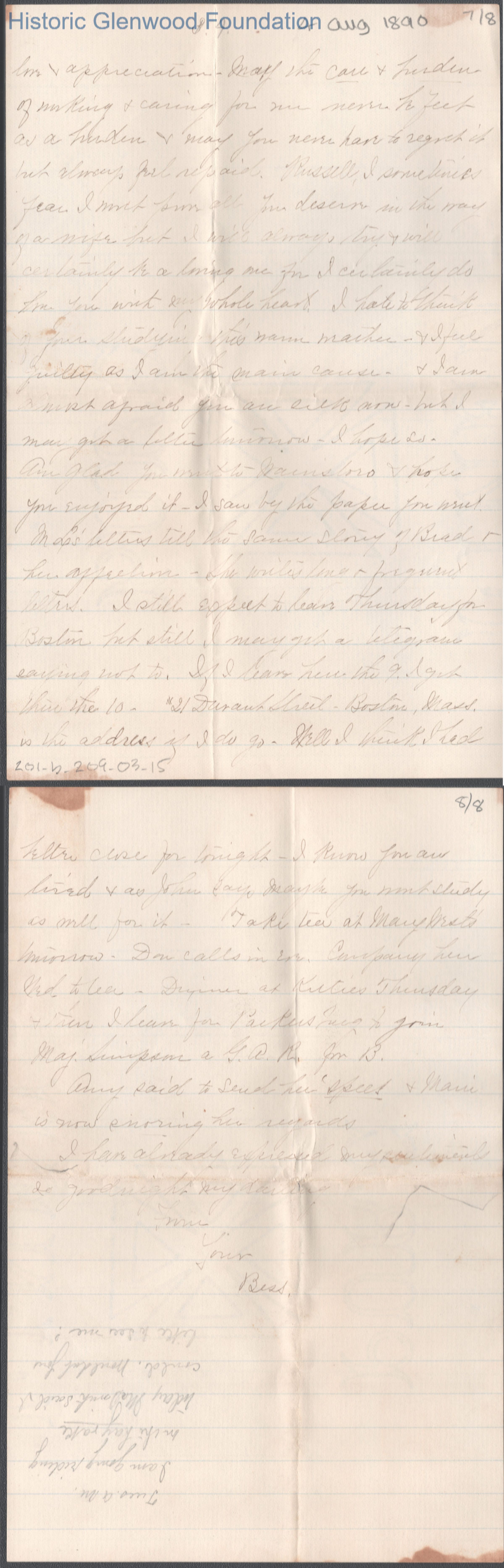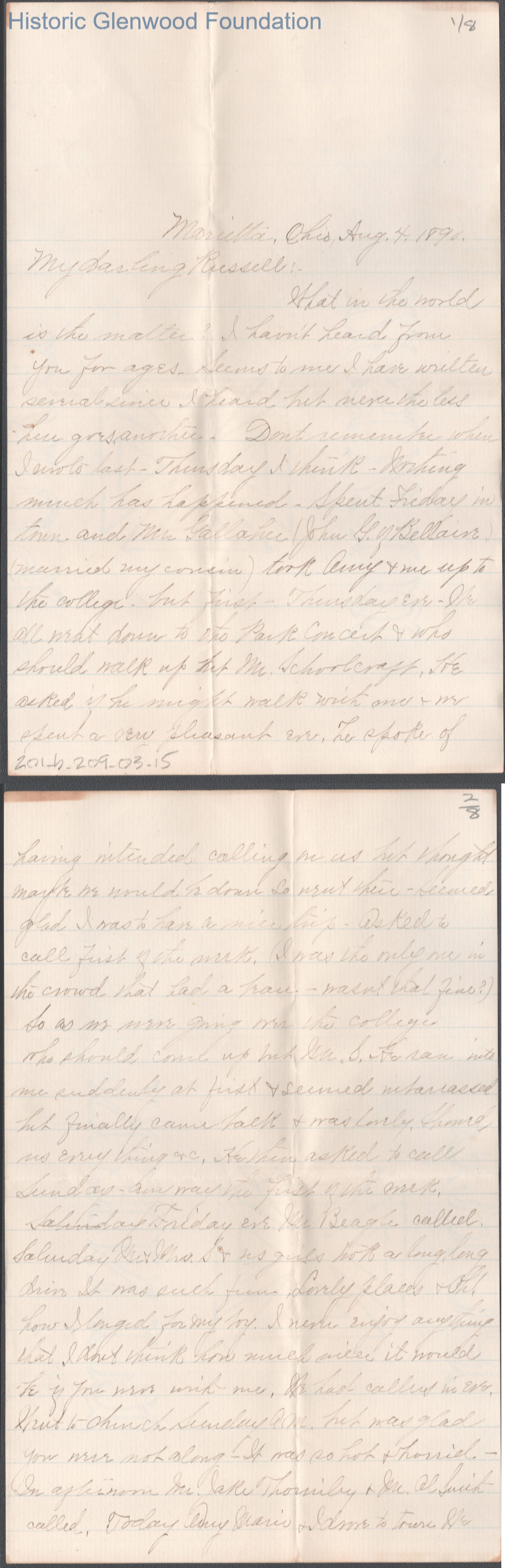 Eight-page letter to Russell G. Quarrier from Elizabeth S. Quarrier, Aug 4, 1890.