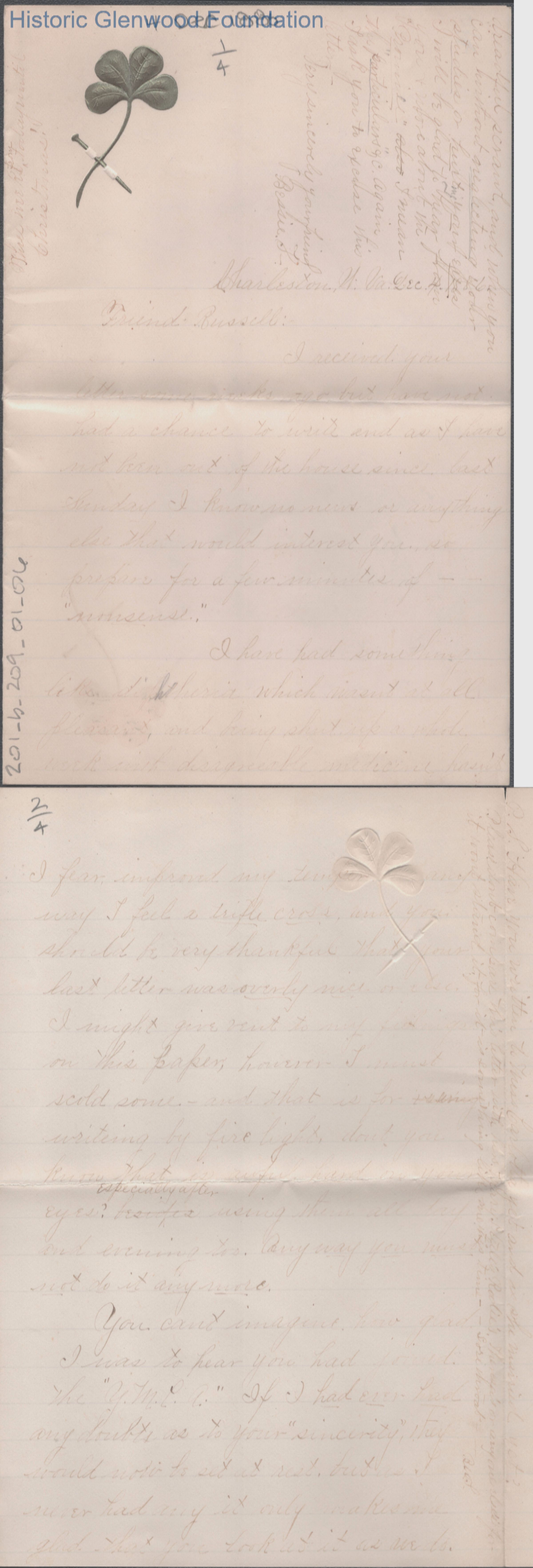 Four-page letter to Russell G. Quarrier from Elizabeth S. Quarrier, Dec 4, 1886.