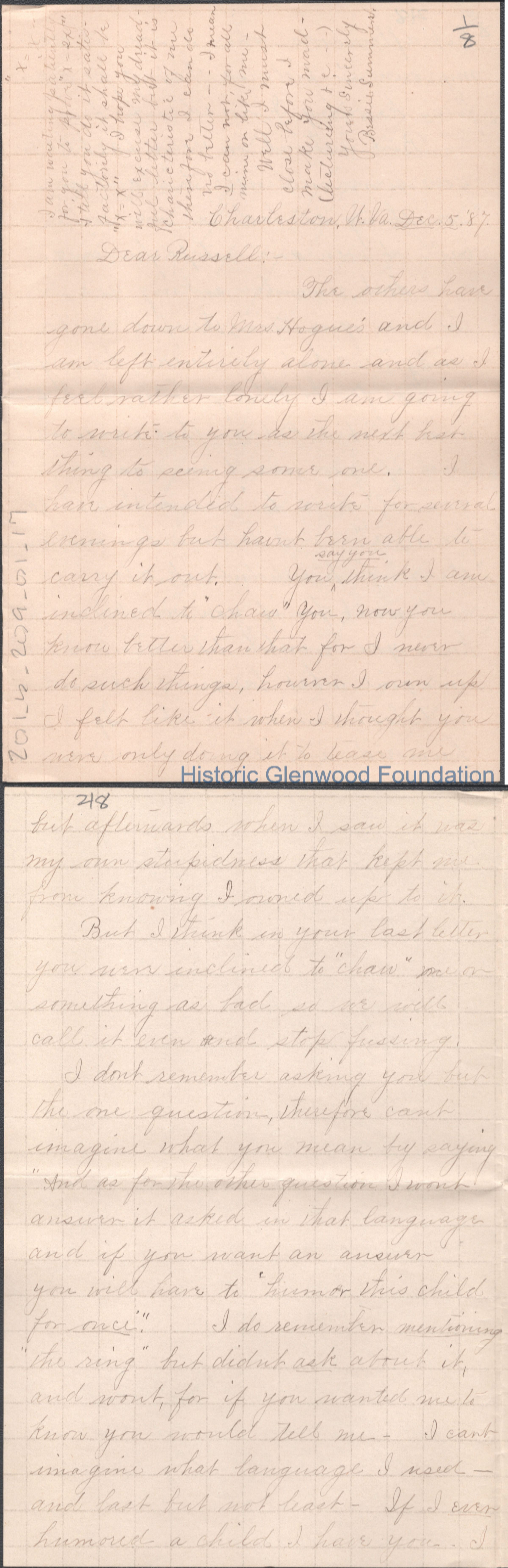 Russell G. Quarrier from Elizabeth S. Quarrier, Dec 5, 1887