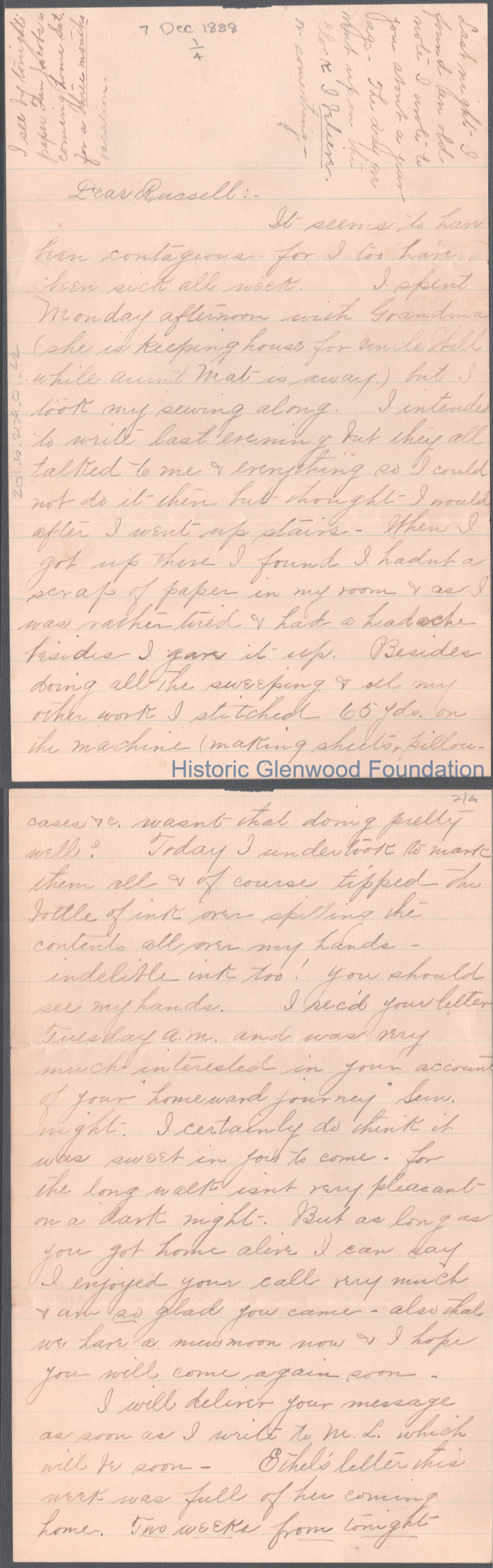 Four-page letter to Russell G. Quarrier from Elizabeth S. Quarrier, Dec 7, 1888.