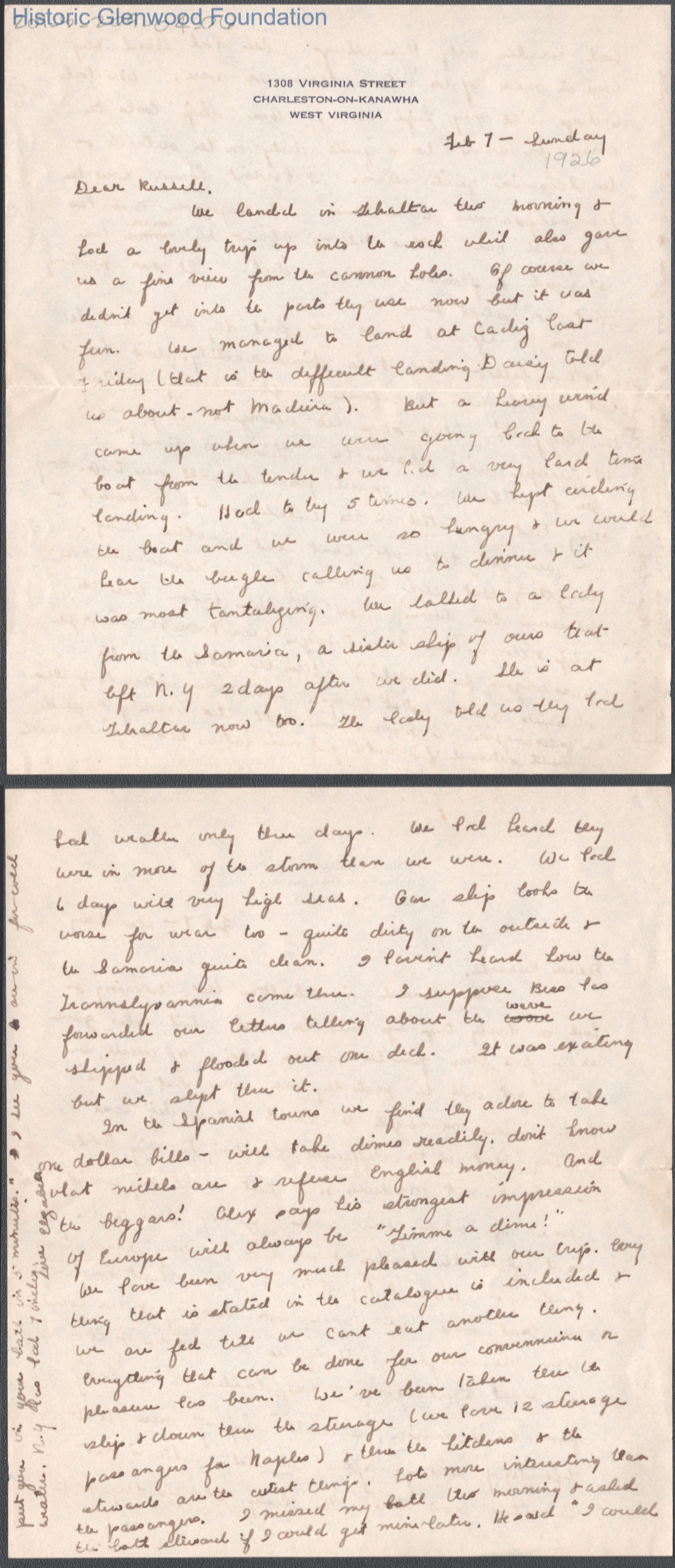 Russell G. Quarrier from Elizabeth S. Quarrier, Feb 7, 1926