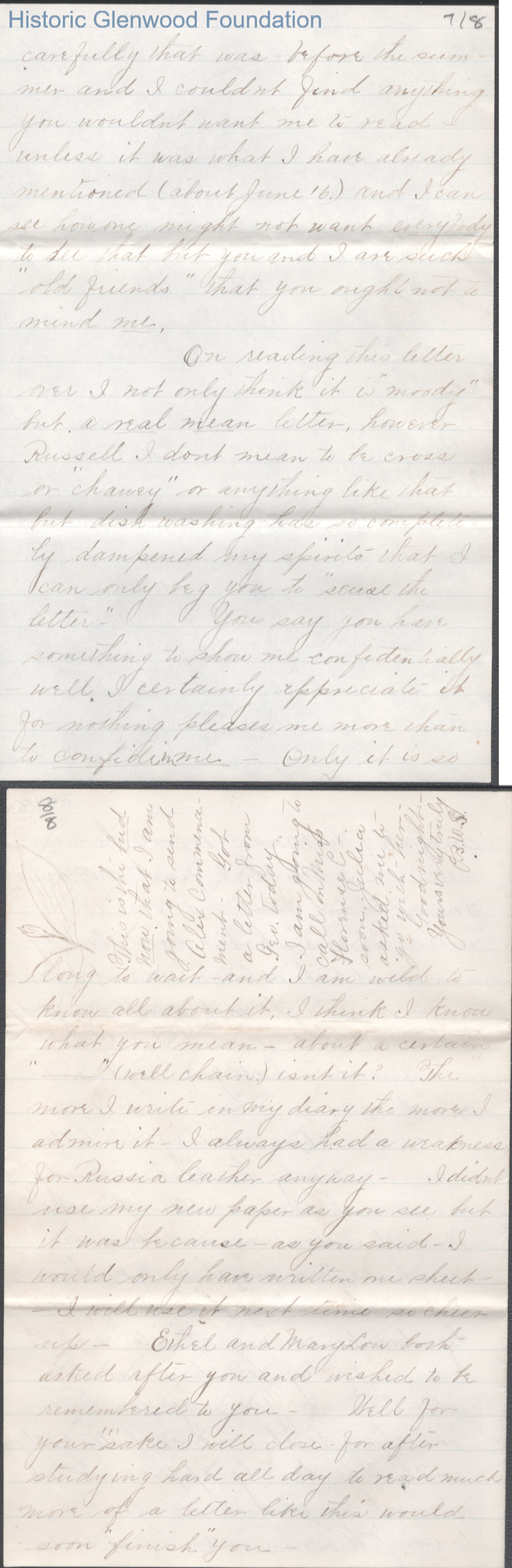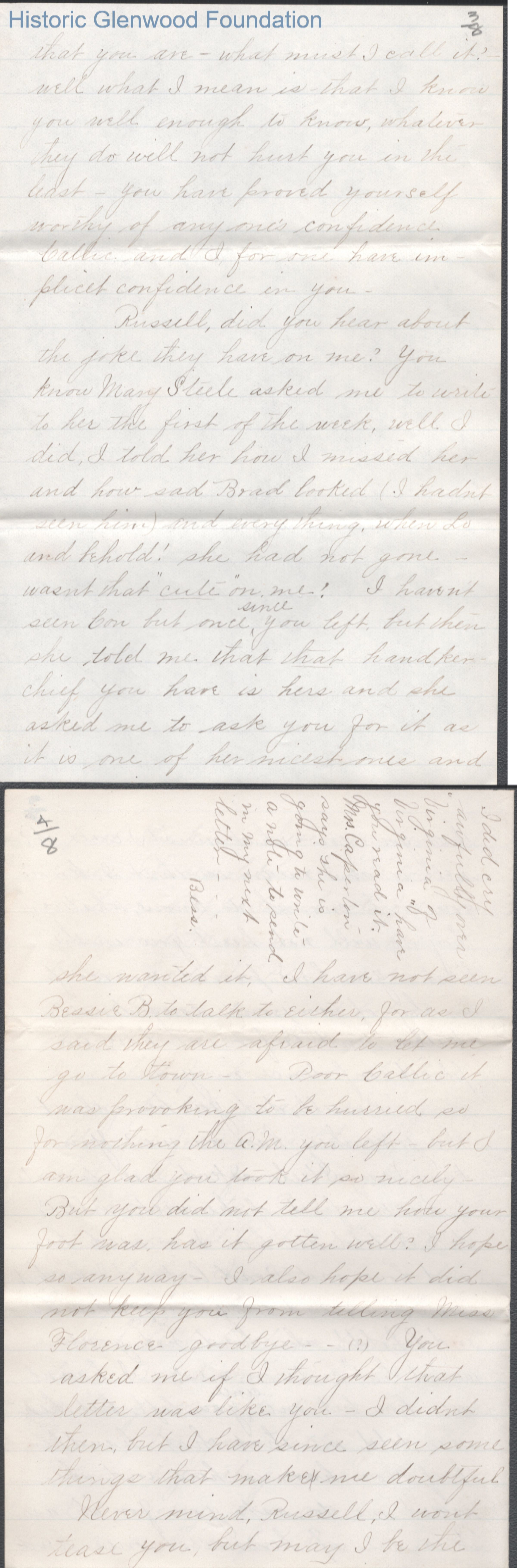 Eight-page letter to Russell G. Quarrier from Elizabeth S. Quarrier, Jan 11, 1888.