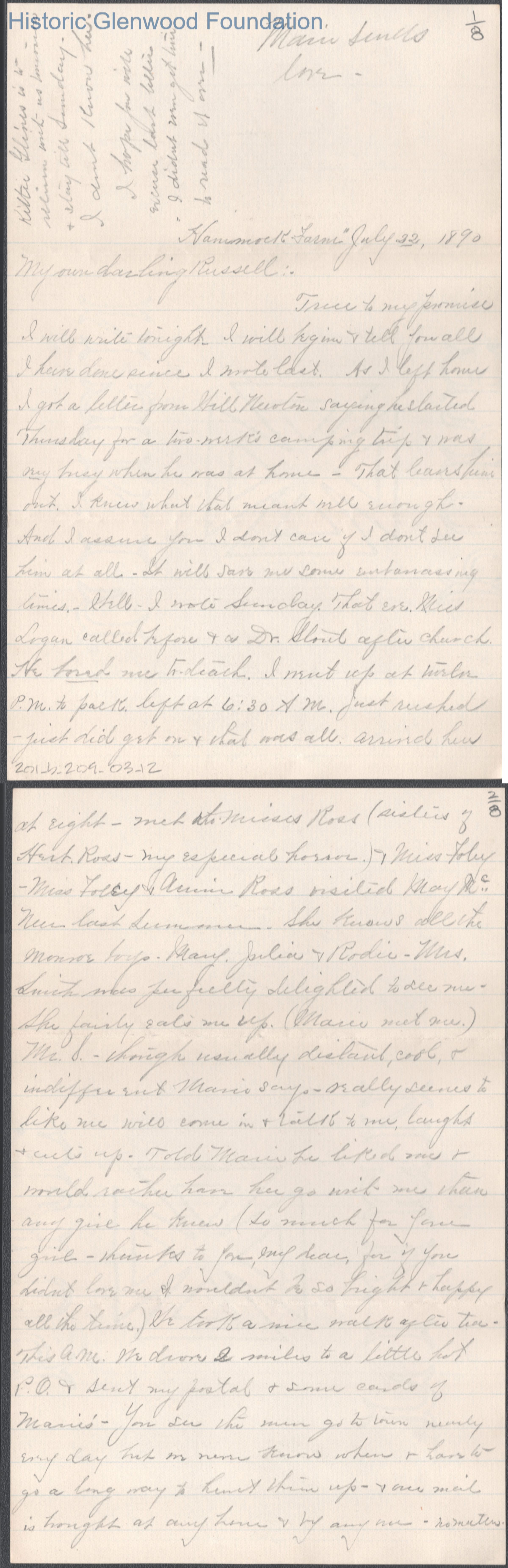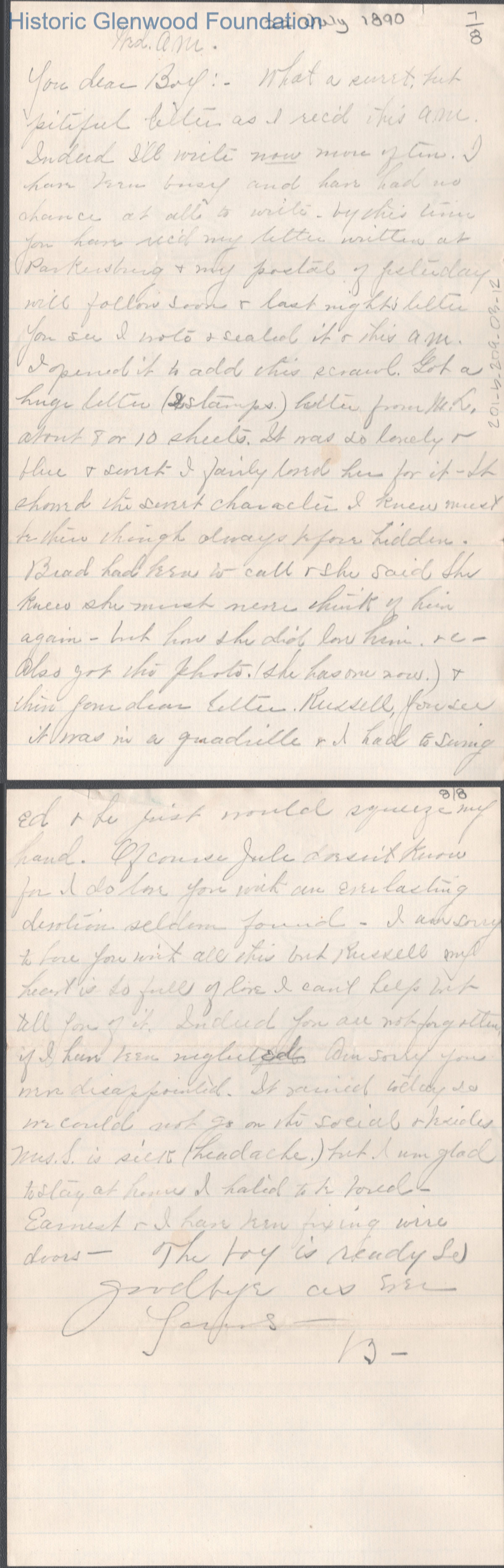 Eight-page letter to Russell G. Quarrier from Elizabeth S. Quarrier, Jul 22, 1890.